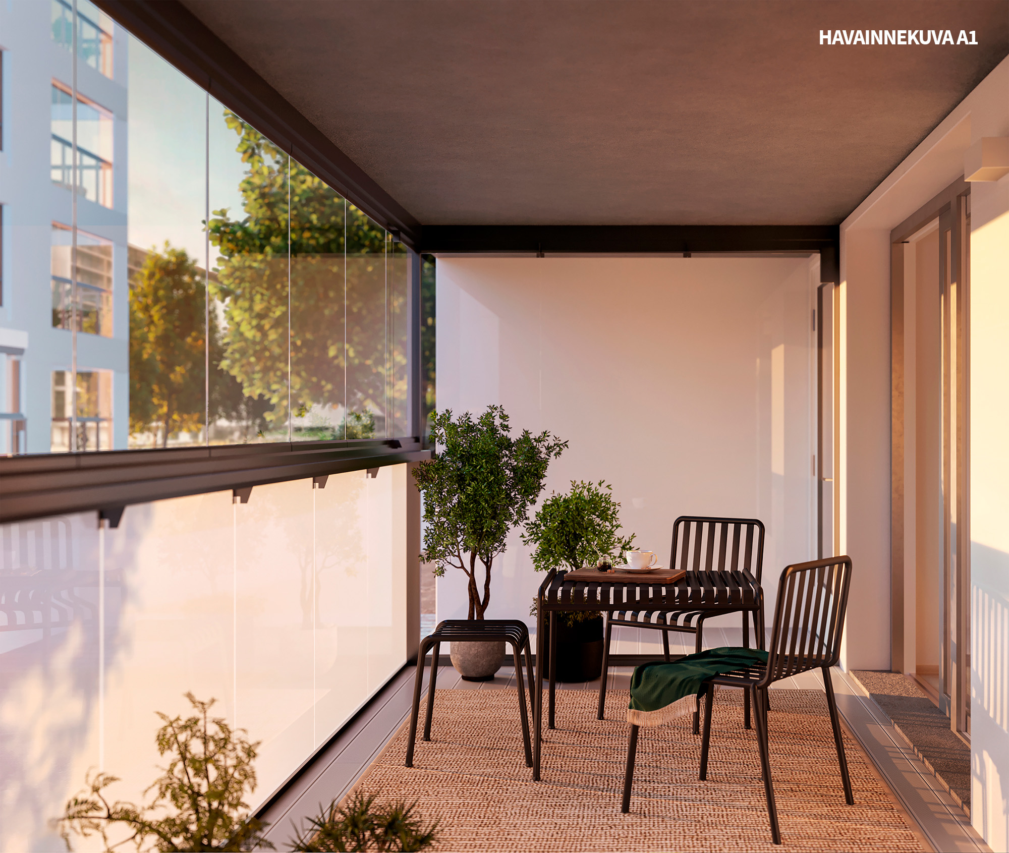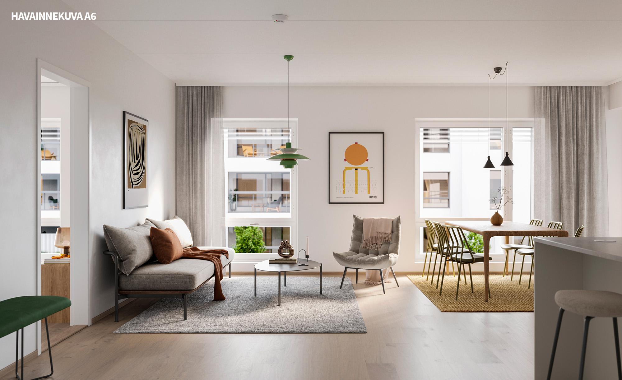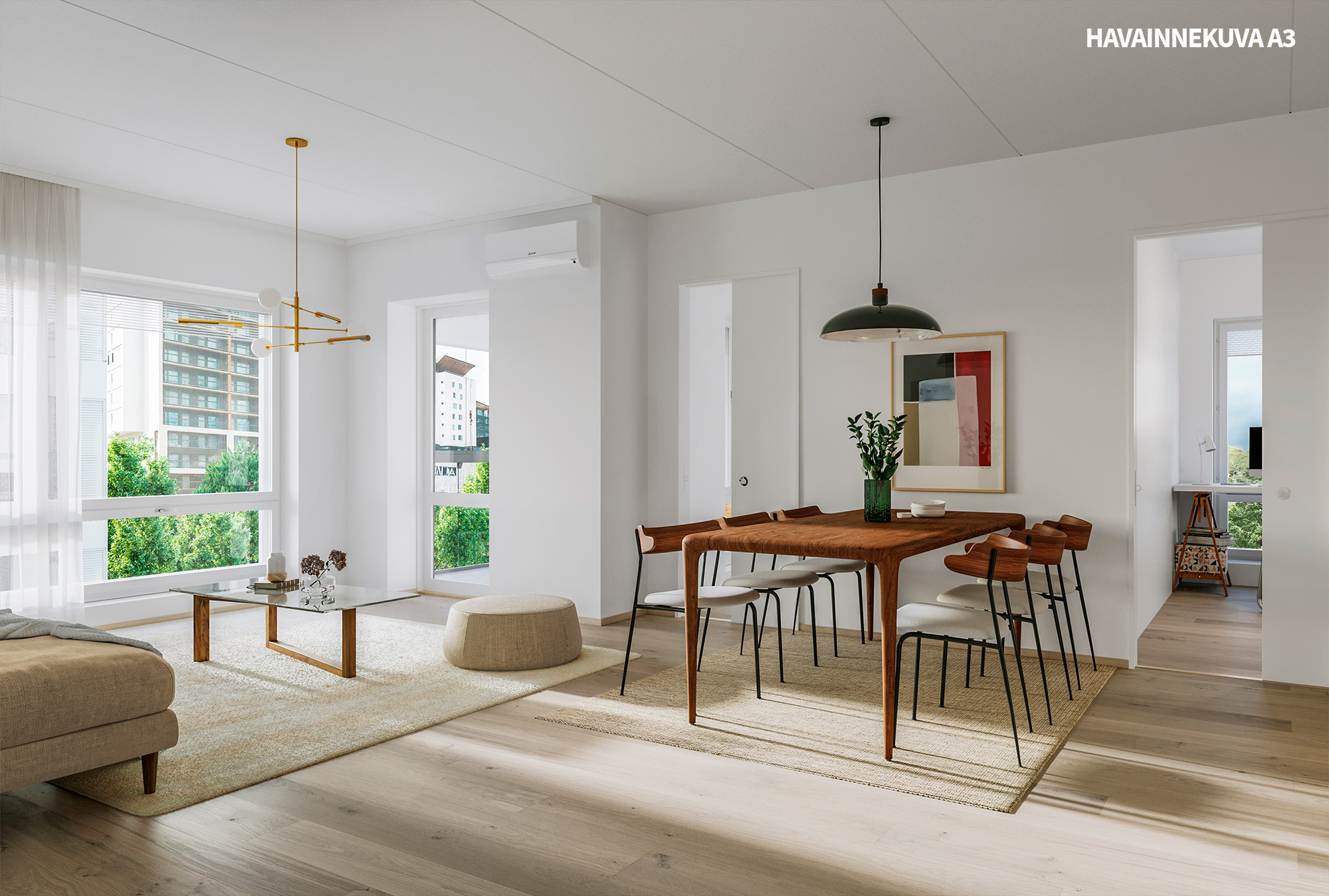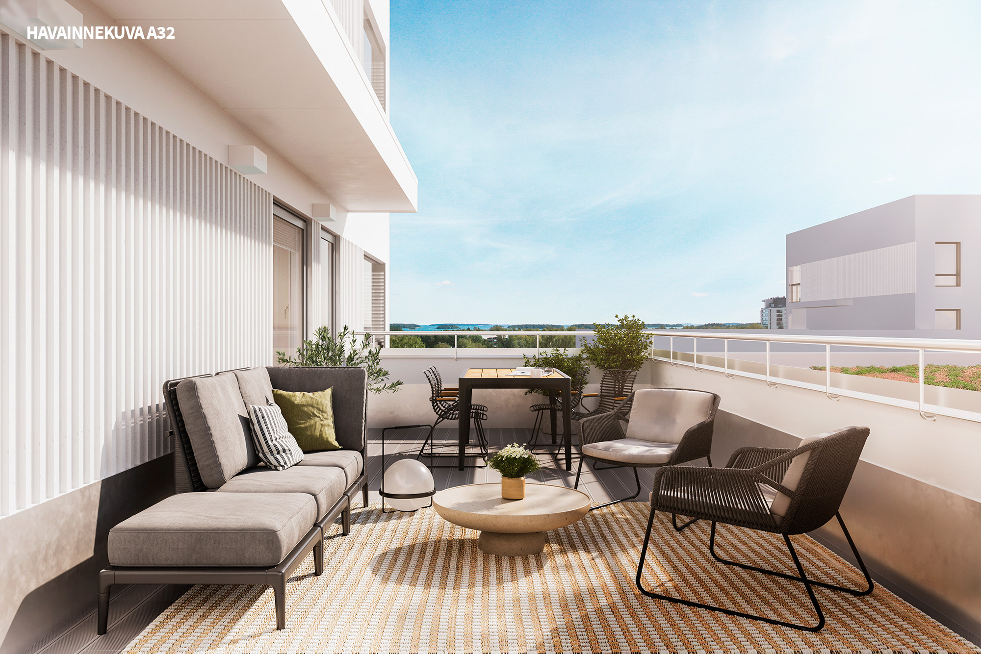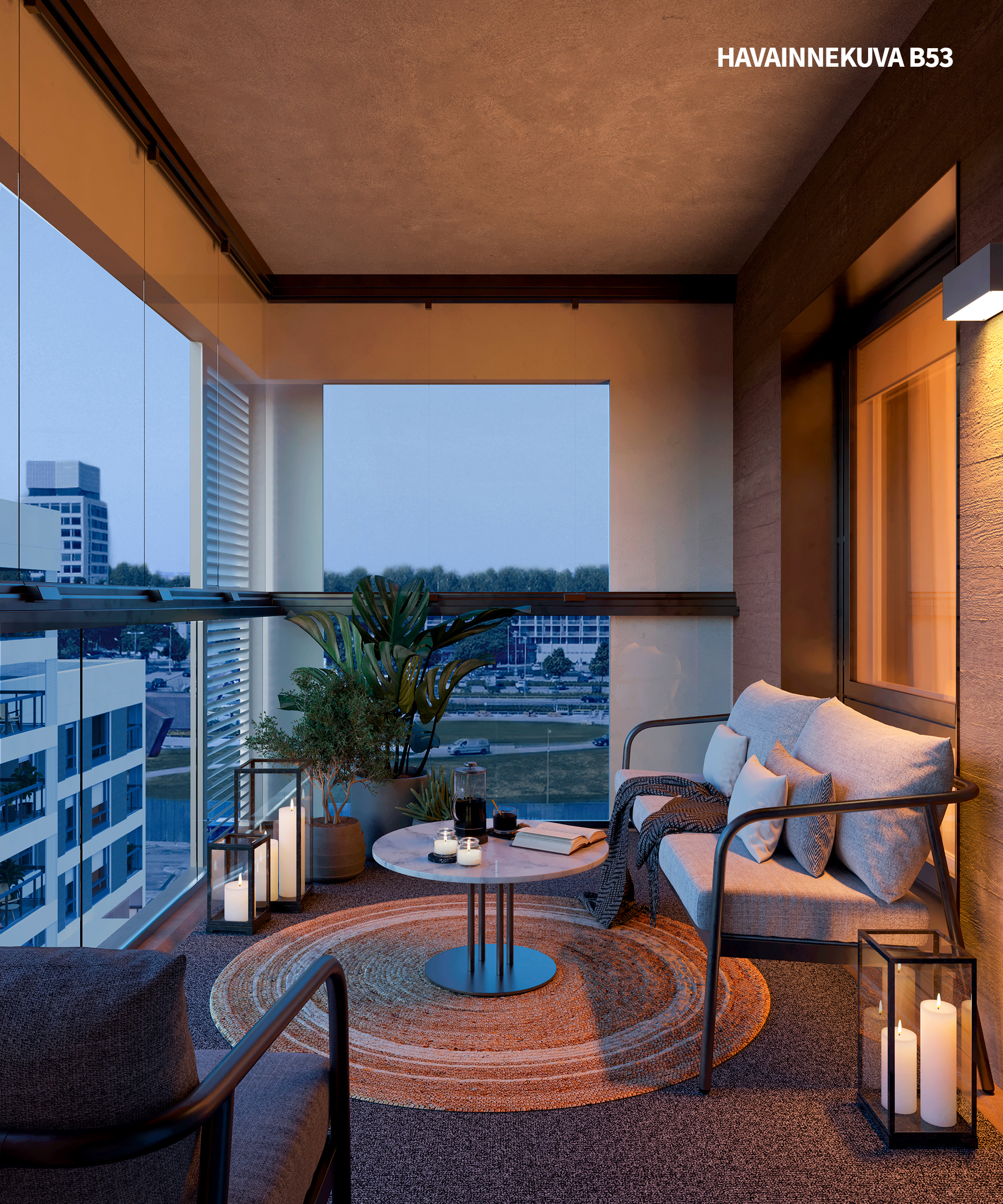Asuntovalikoimaa löytyy 31 m² yksiöstä 114,5 m² kaksikerroksisiin kolmen makuuhuoneen perheasuntoihin. Kaikissa huoneistoissa on parveke tai terassi, ja useista asunnoista on näkymät kolmeen eri ilmansuuntaan. Suuremmissa asunnoissa on käytännöllisesti kaksi kylpyhuonetta sekä oma sauna. Pohjaratkaisuiltaan avarissa asunnoissa on parkettilattiat ja keittiöissä on integroidut kodinkoneet. Huoneistokohtainen viilennys ilmalämpöpumpulla takaa viihtymisen myös kesähelteillä.