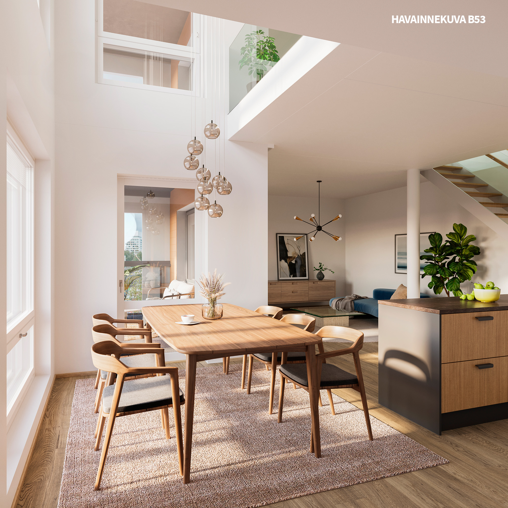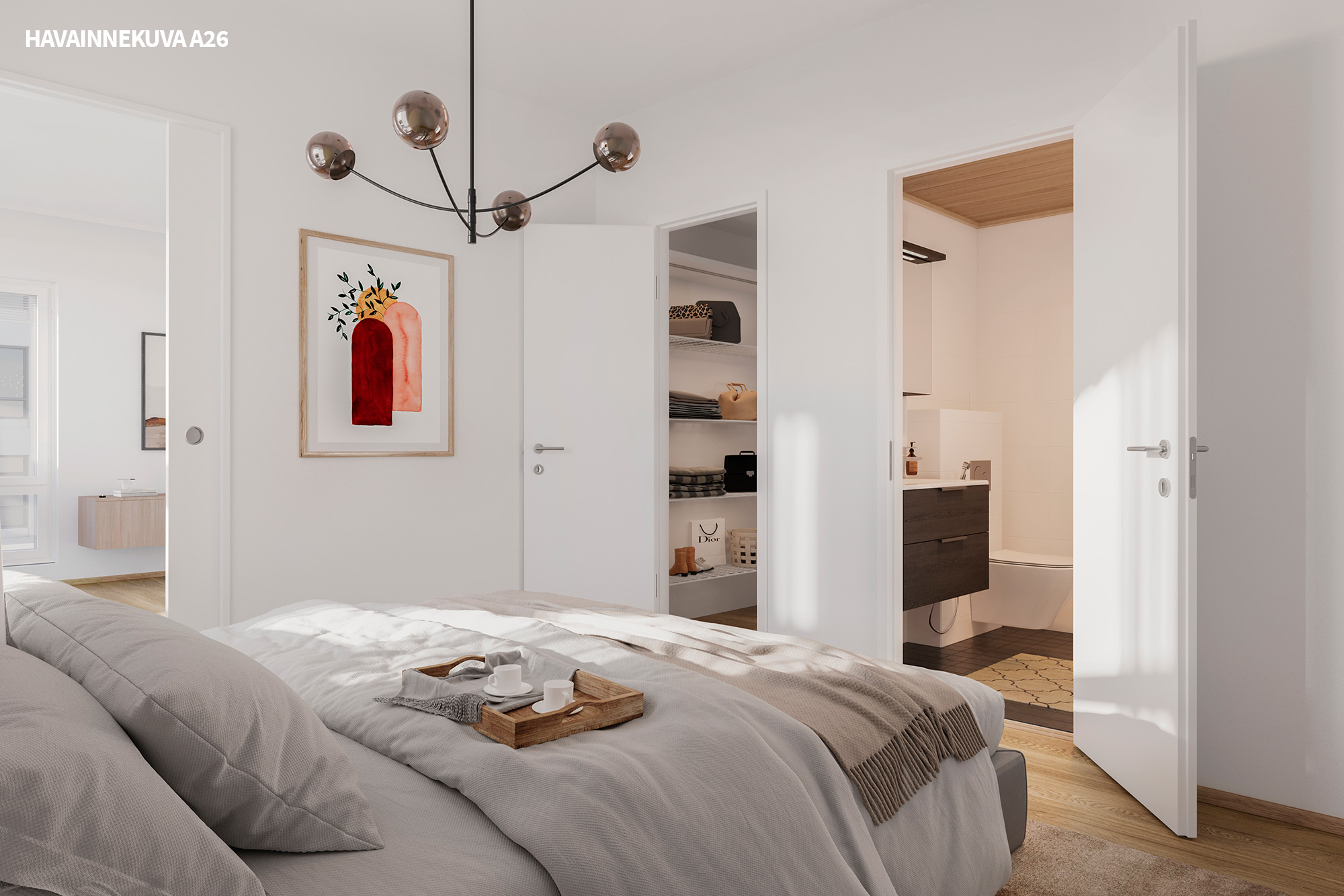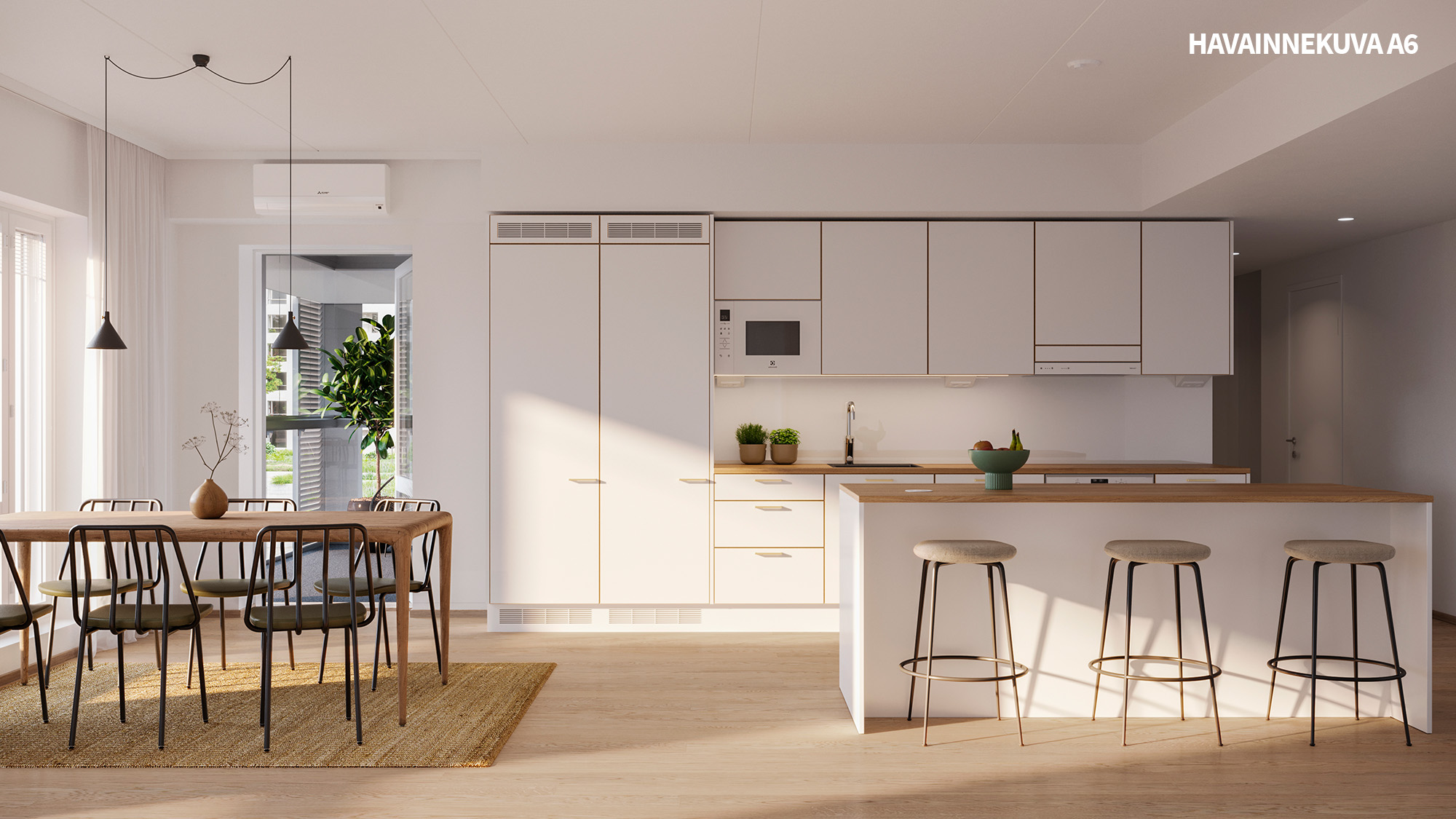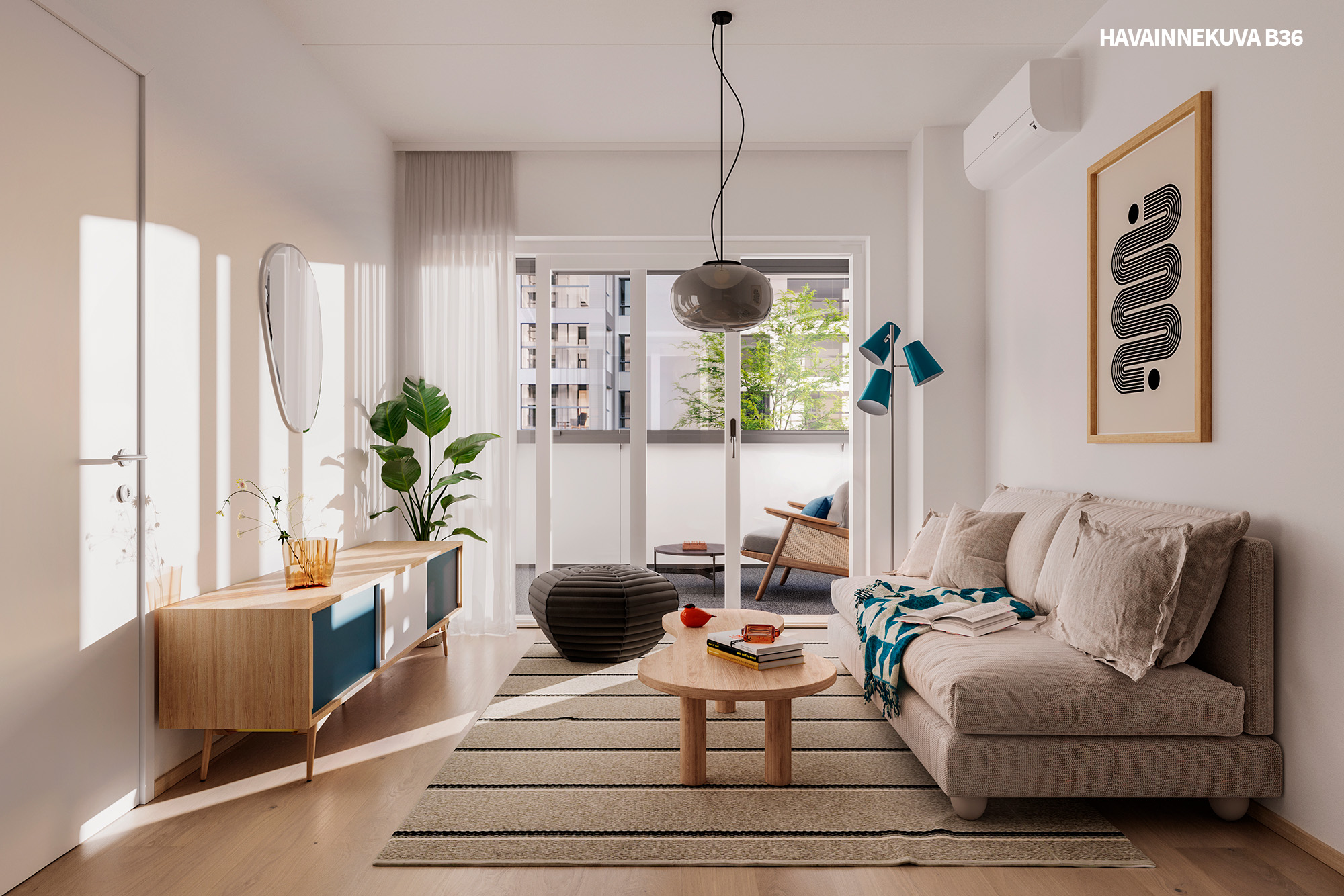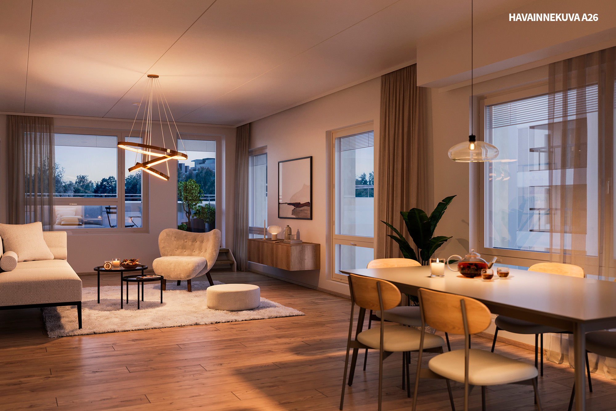 Asuntovalikoimaa löytyy 31 m² yksiöstä 114,5 m² kaksikerroksisiin kolmen makuuhuoneen perheasuntoihin. Kaikissa huoneistoissa on parveke tai terassi, ja useista asunnoista on näkymät kolmeen eri ilmansuuntaan. Suuremmissa asunnoissa on käytännöllisesti kaksi kylpyhuonetta sekä oma sauna. Pohjaratkaisuiltaan avarissa asunnoissa on parkettilattiat ja keittiöissä on integroidut kodinkoneet. Huoneistokohtainen viilennys ilmalämpöpumpulla takaa viihtymisen myös kesähelteillä.