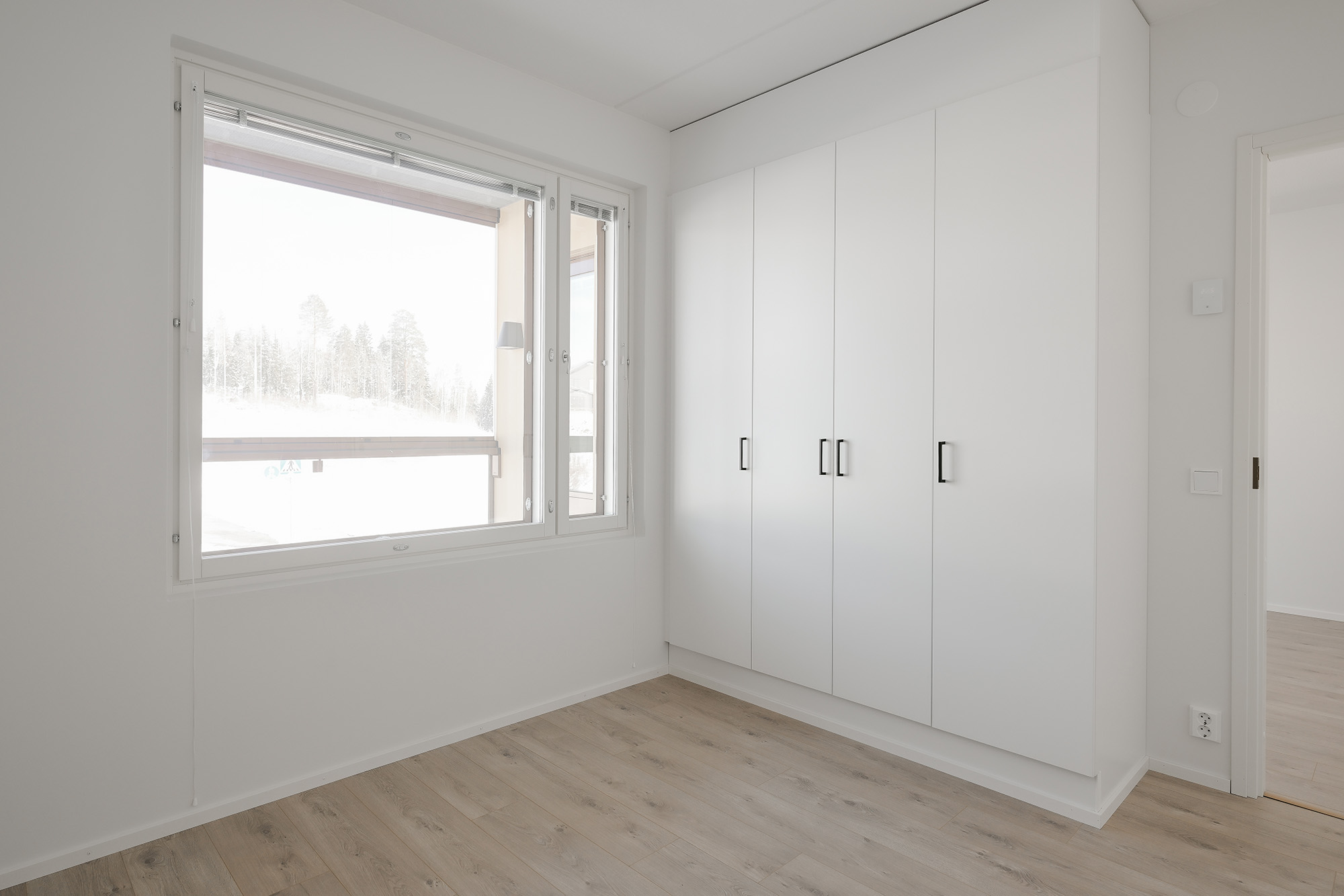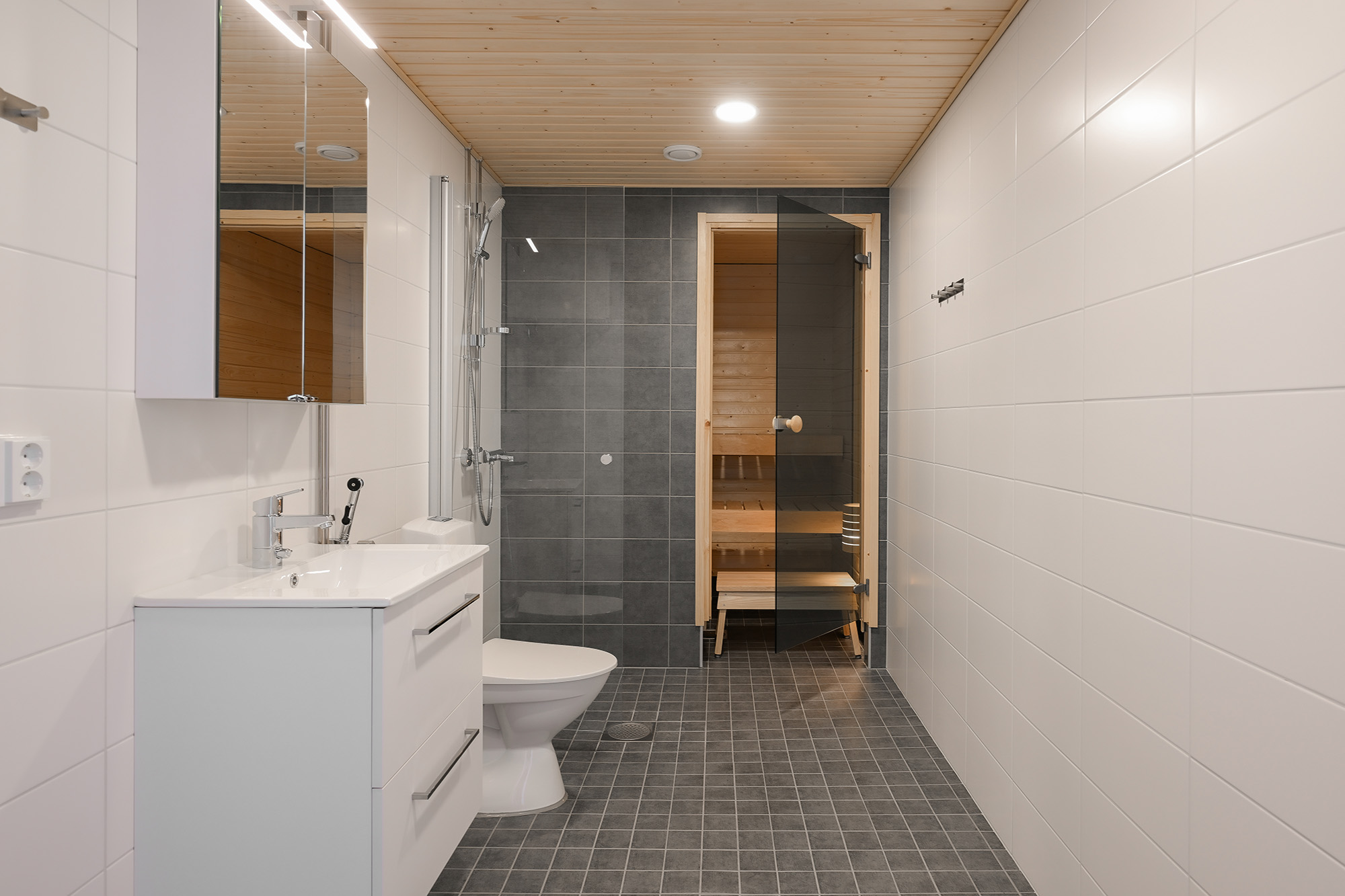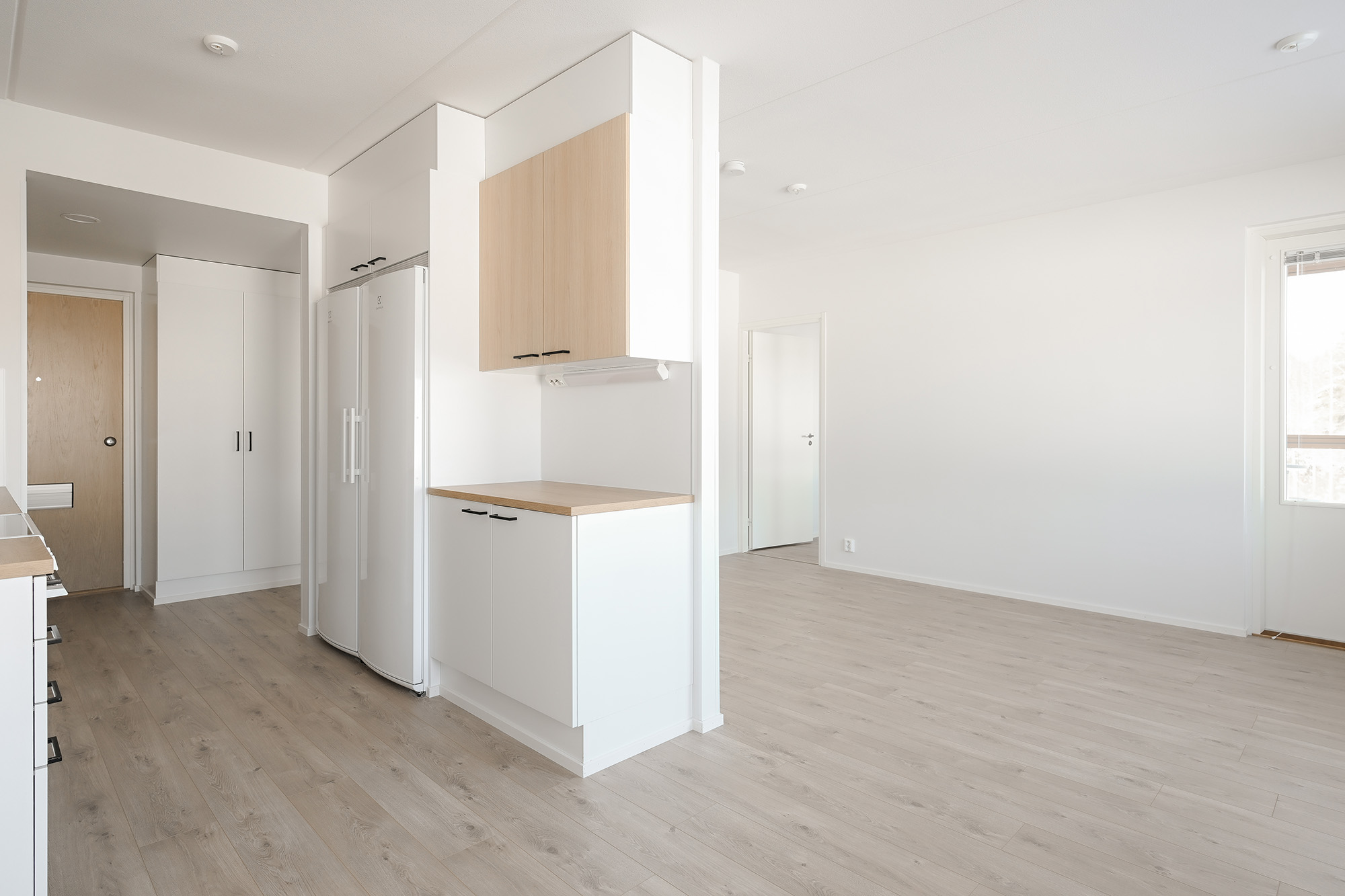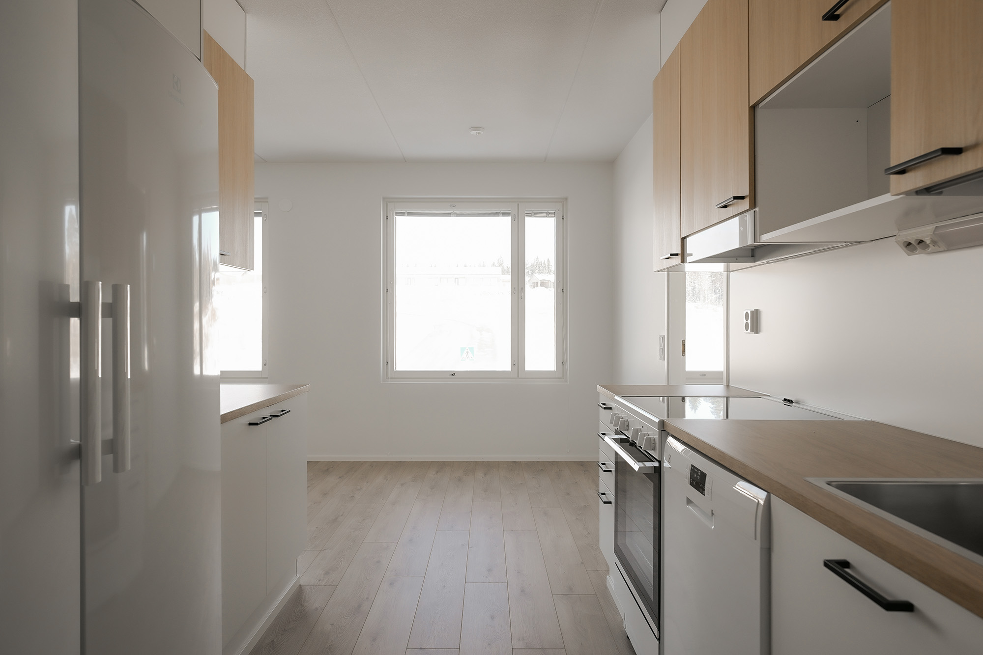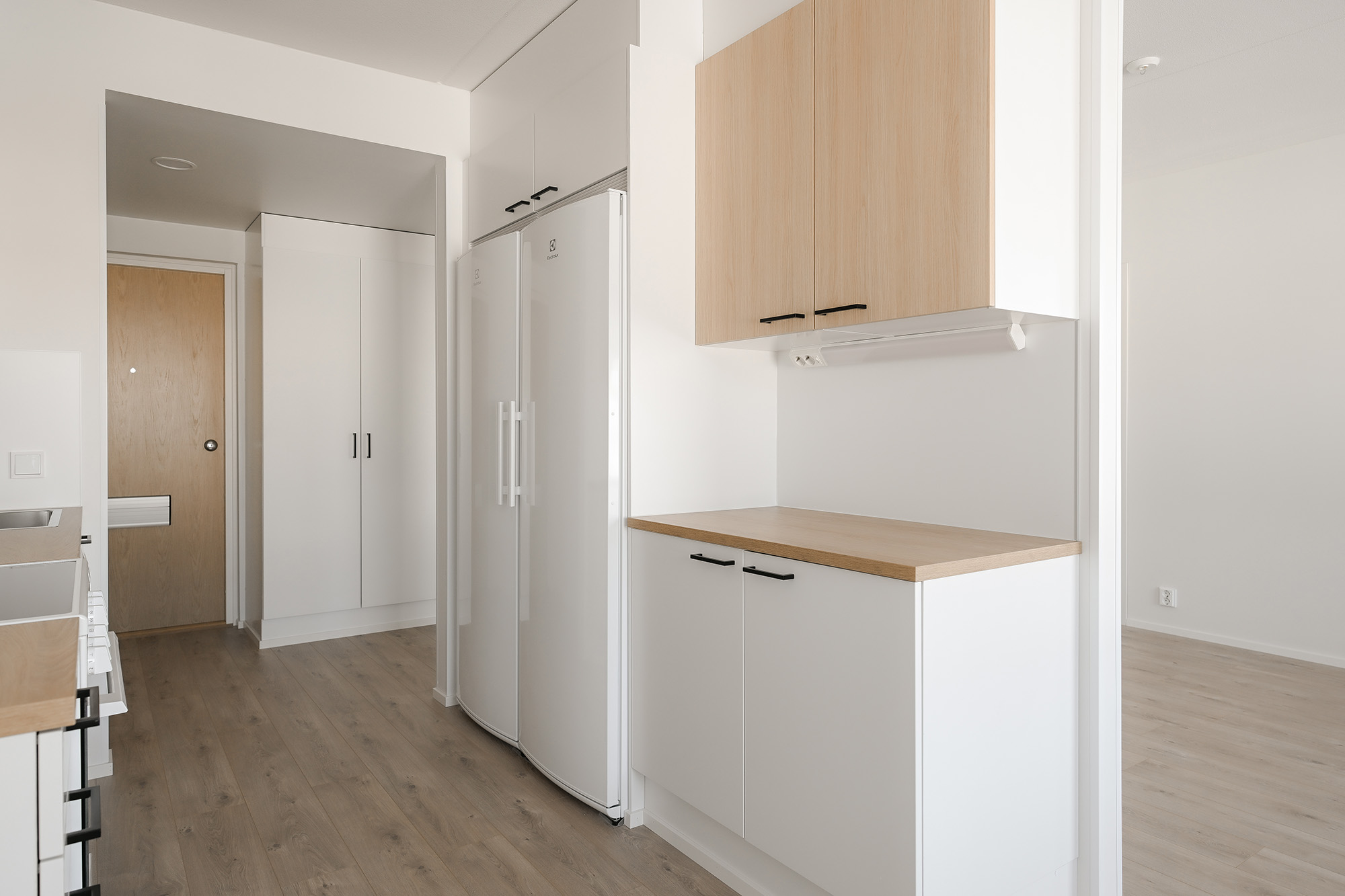 Tästä erinomainen kulmahuoneisto omalla saunalla. Eteisessä on mukavasti säilytystilaa, ja kylpyhuoneessa kätevä taso kodinhoitotöille. Olohuoneen ja keittiön yhdistelmästä löytyy luonteva paikka kaikille tärkeimmille kalusteille. Kulmaparvekkeelta on kiva ihailla metsäisiä maisemia.
