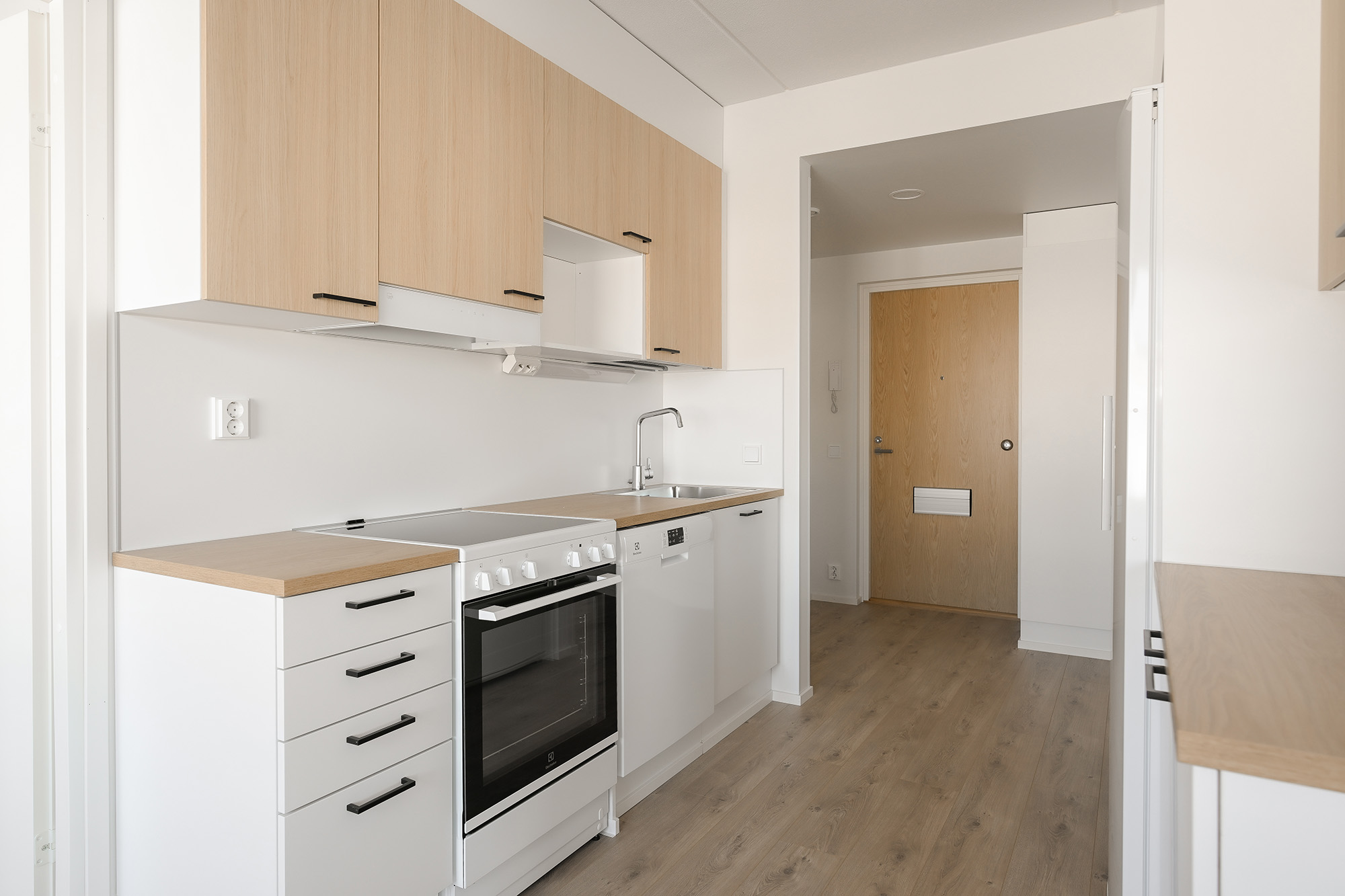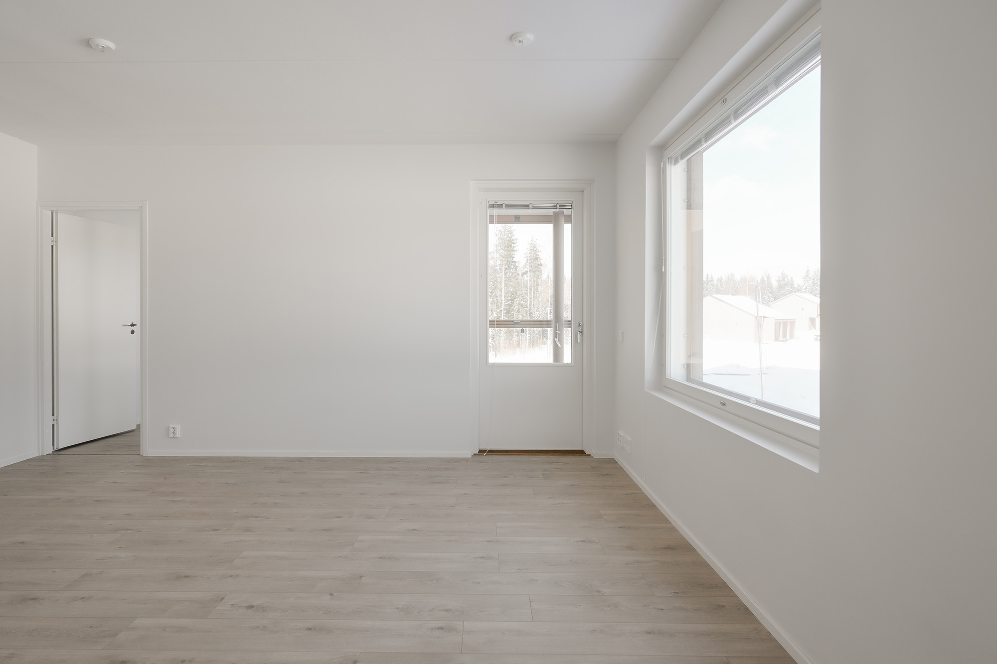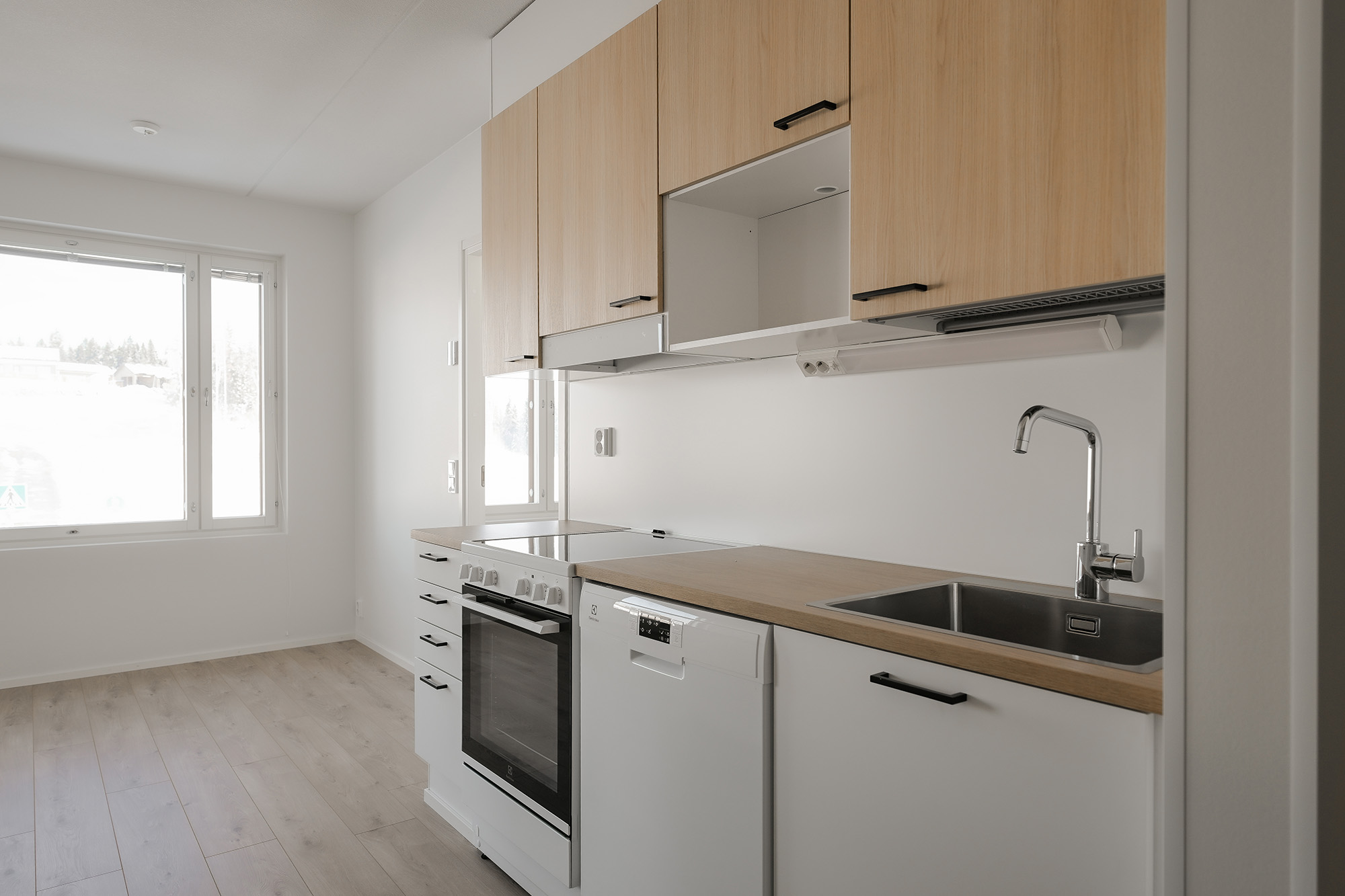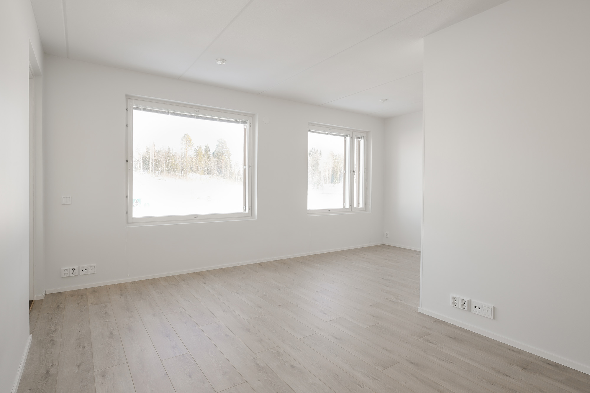 Tästä erinomainen kulmahuoneisto omalla saunalla. Eteisessä on mukavasti säilytystilaa, ja kylpyhuoneessa kätevä taso kodinhoitotöille. Olohuoneen ja keittiön yhdistelmästä löytyy luonteva paikka kaikille tärkeimmille kalusteille. Kulmaparvekkeelta on kiva ihailla metsäisiä maisemia.