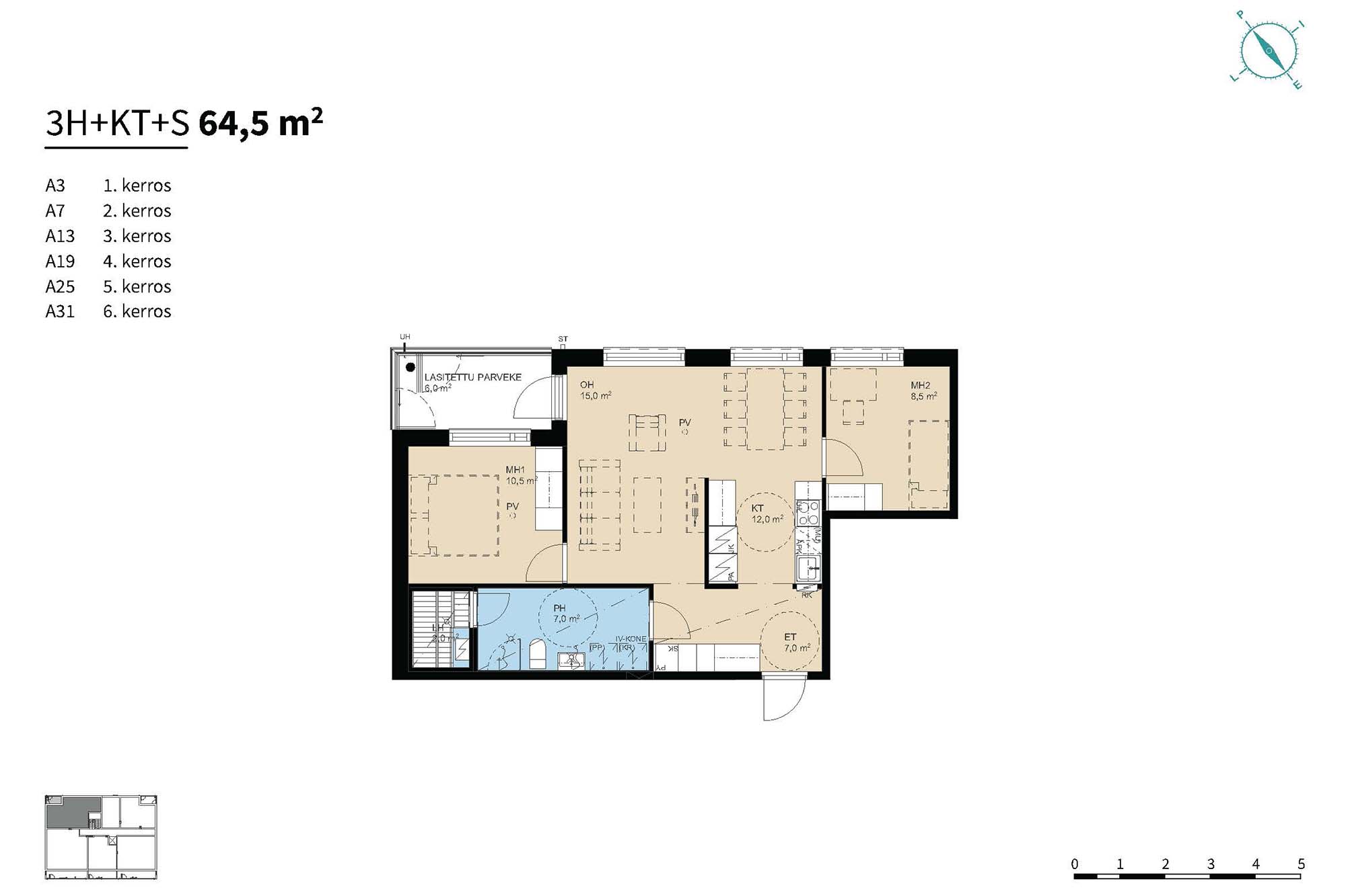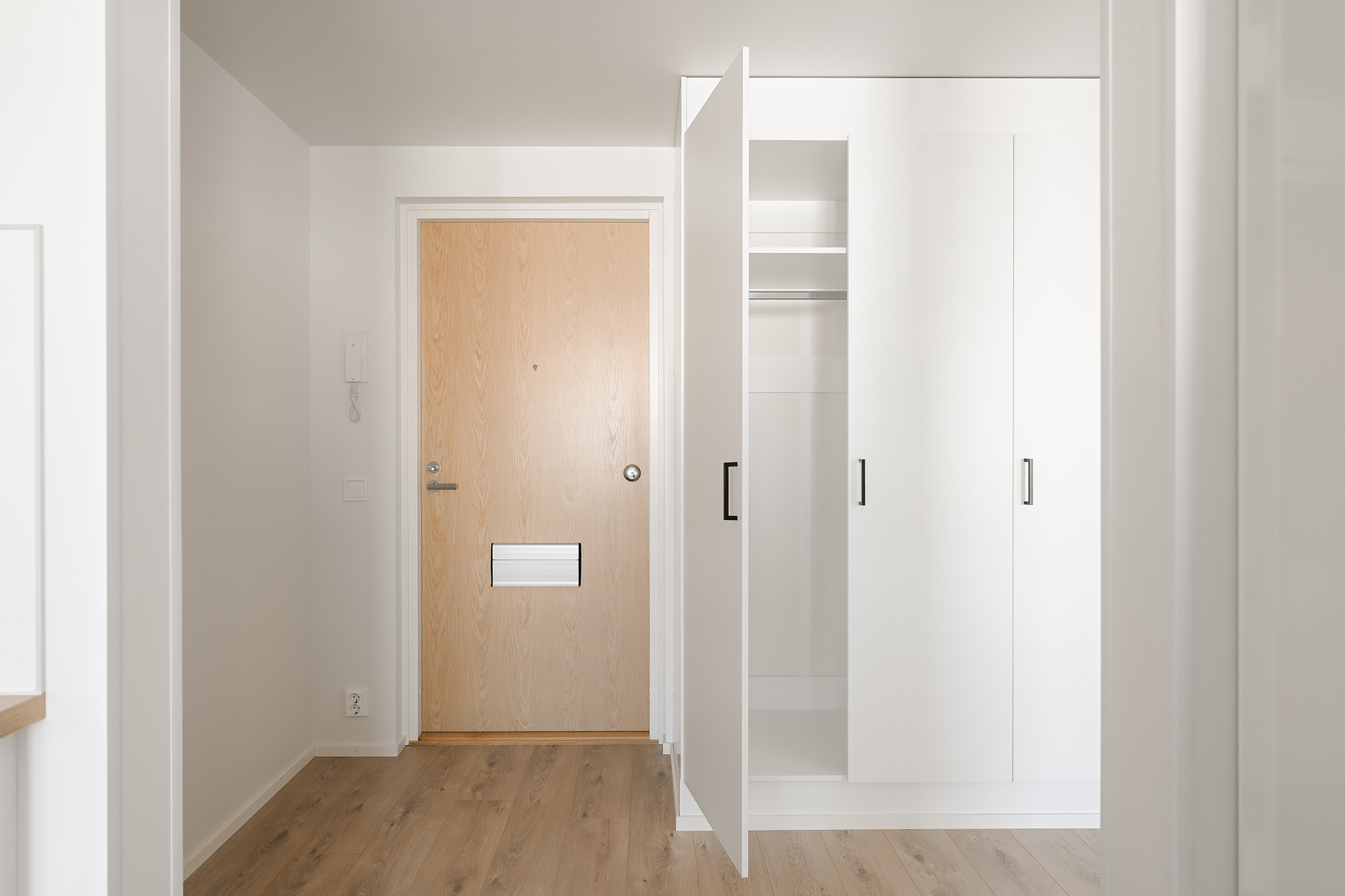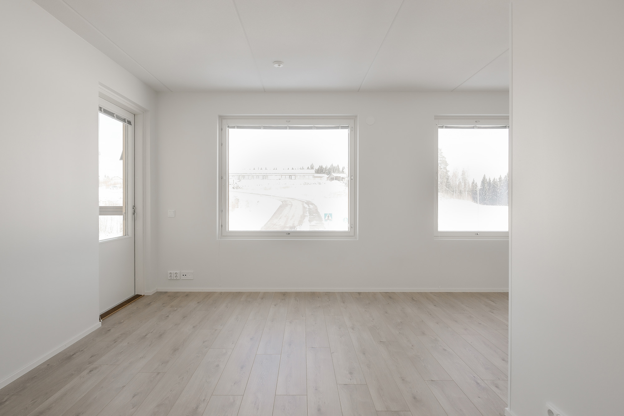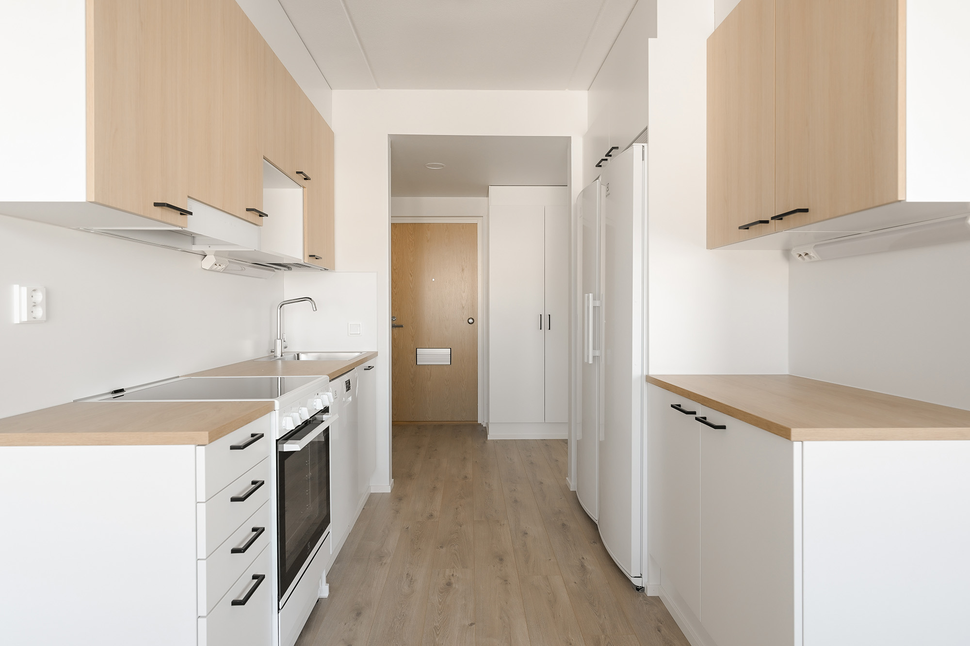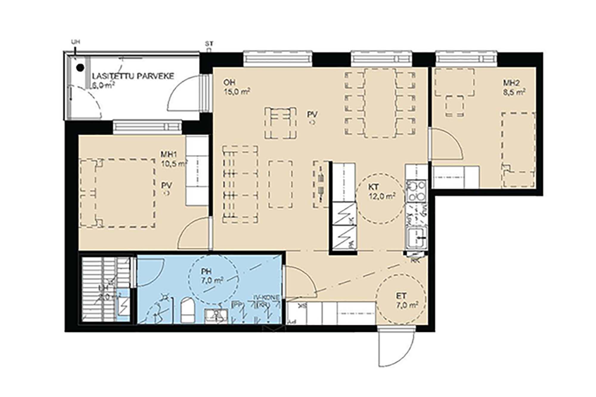 Tästä erinomainen kulmahuoneisto omalla saunalla. Eteisessä on mukavasti säilytystilaa, ja kylpyhuoneessa kätevä taso kodinhoitotöille. Olohuoneen ja keittiön yhdistelmästä löytyy luonteva paikka kaikille tärkeimmille kalusteille. Kulmaparvekkeelta on kiva ihailla metsäisiä maisemia.