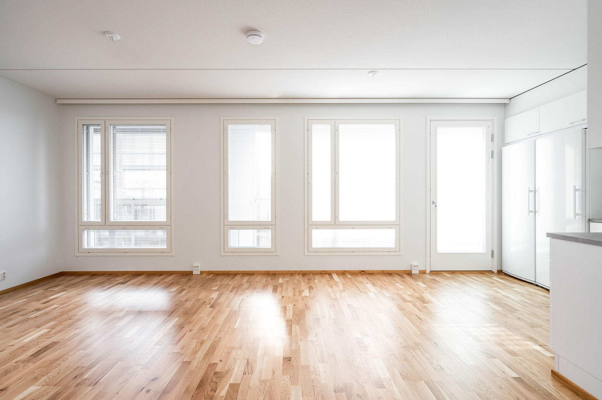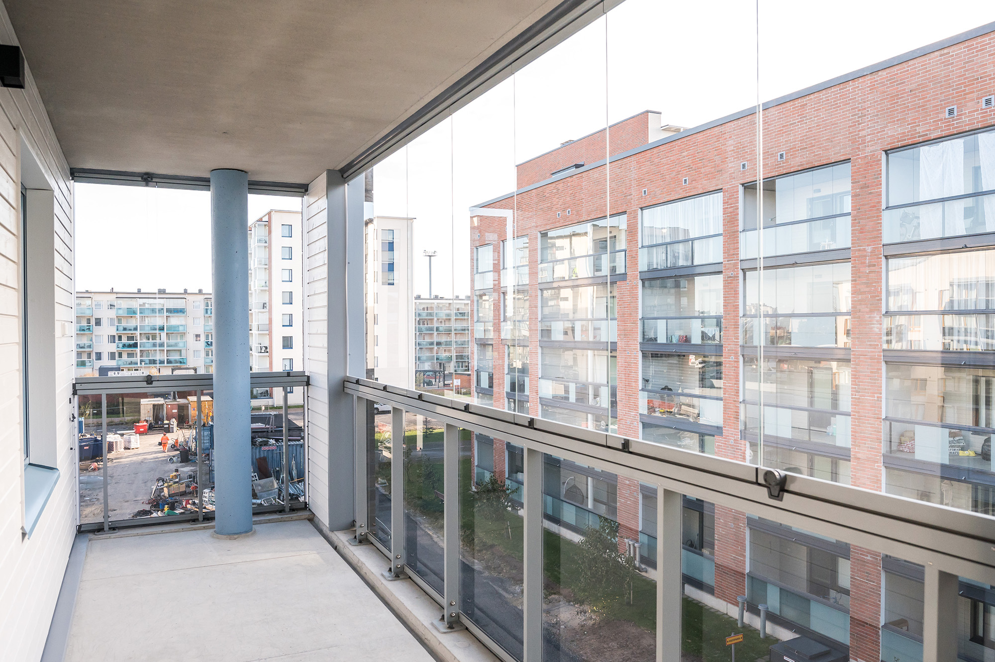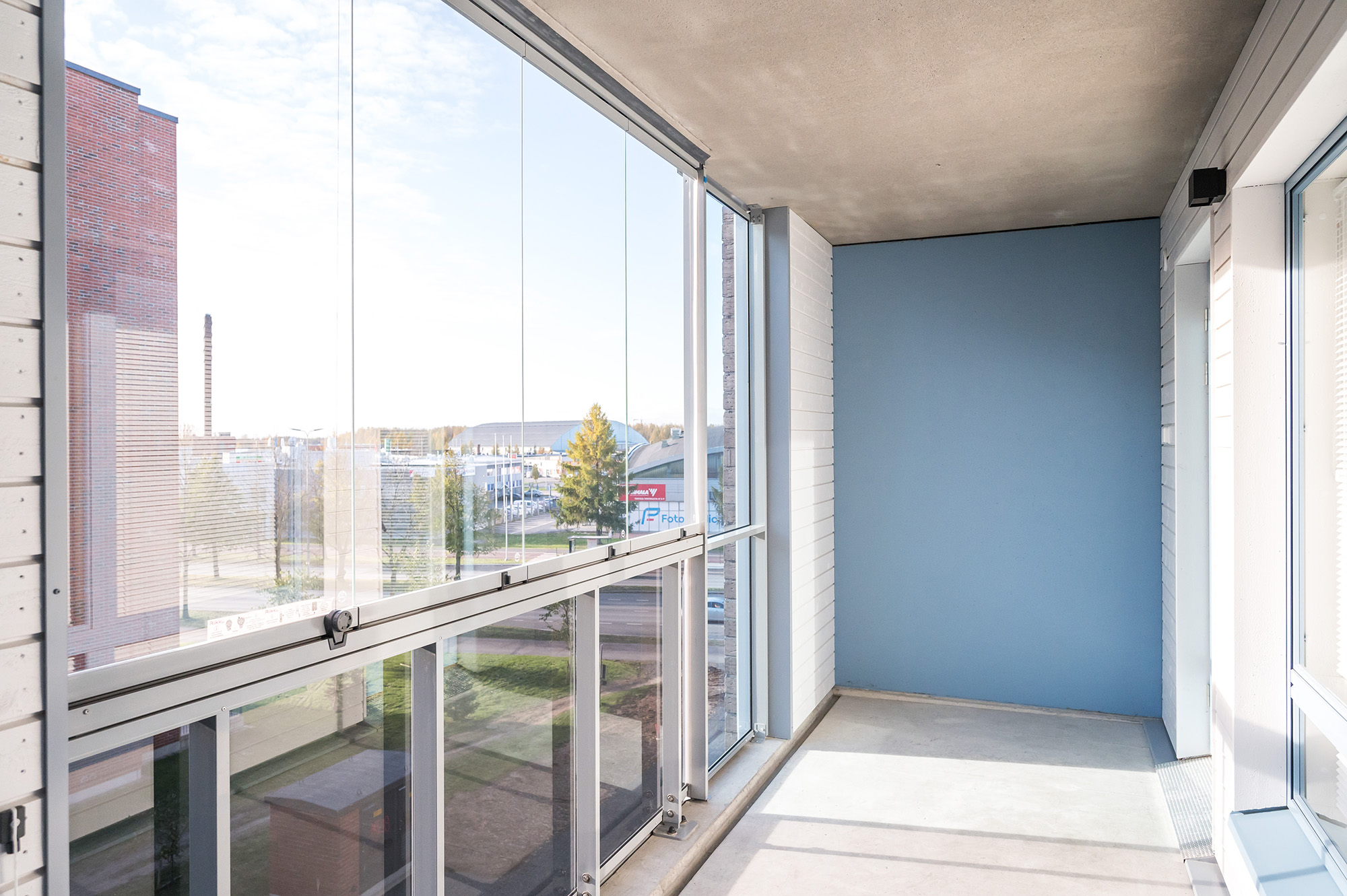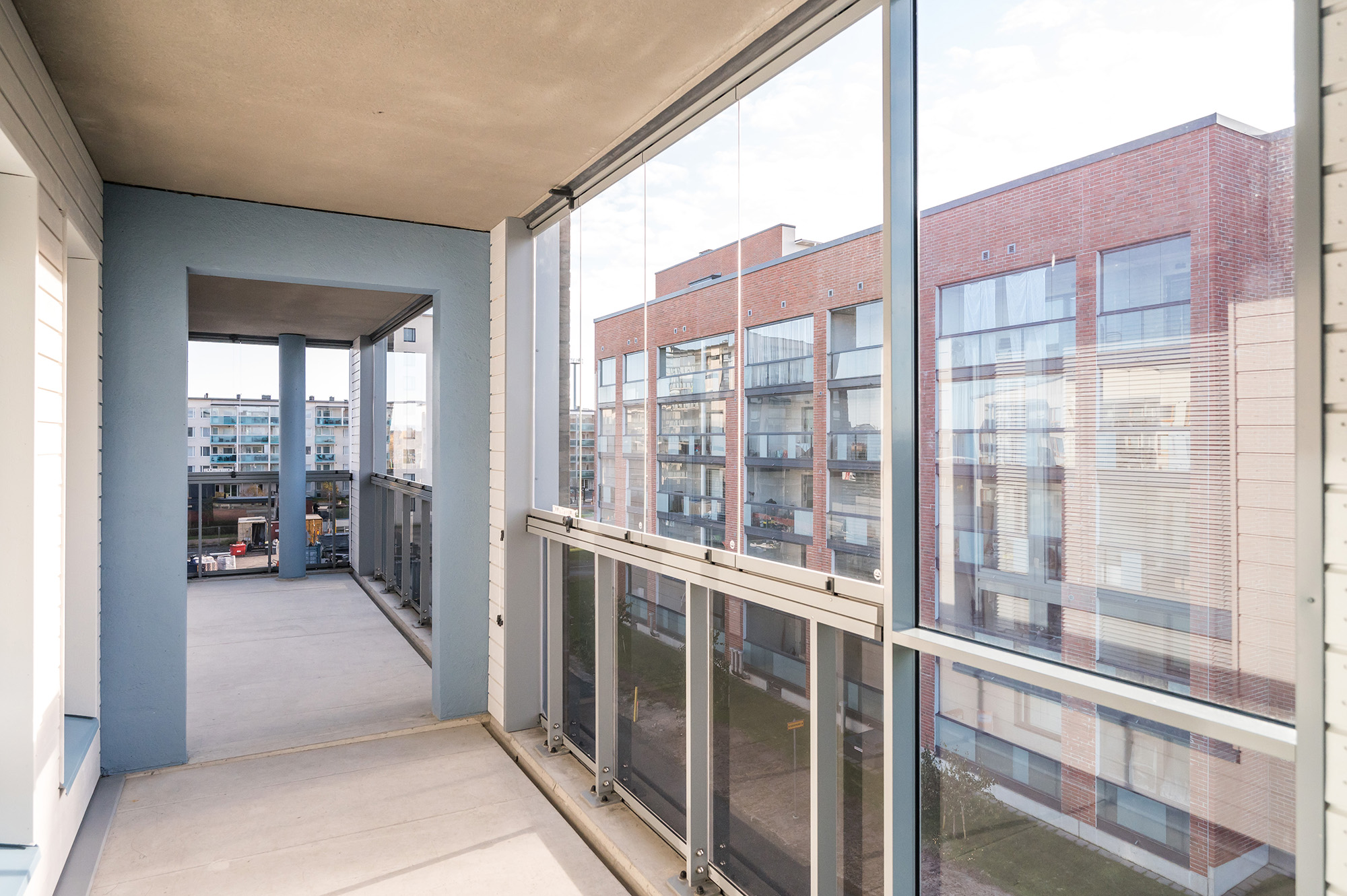 Hurmaava kolmio rakennuksen kulmalta, jossa huikean kokoinen etelään päin suuntaava parveke ja näyttävä sauna. Molemmat makuuhuoneet ovat mukavankokoisia. Olohuoneen ja keittiön yhdistelmä on erittäin avara. Auringonvalo säteilee sisään isoista etelänpuoleisista ikkunoista.