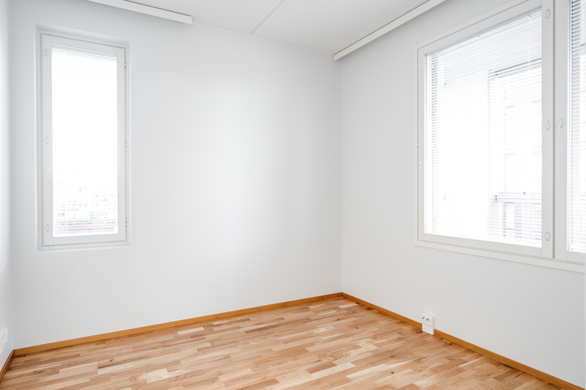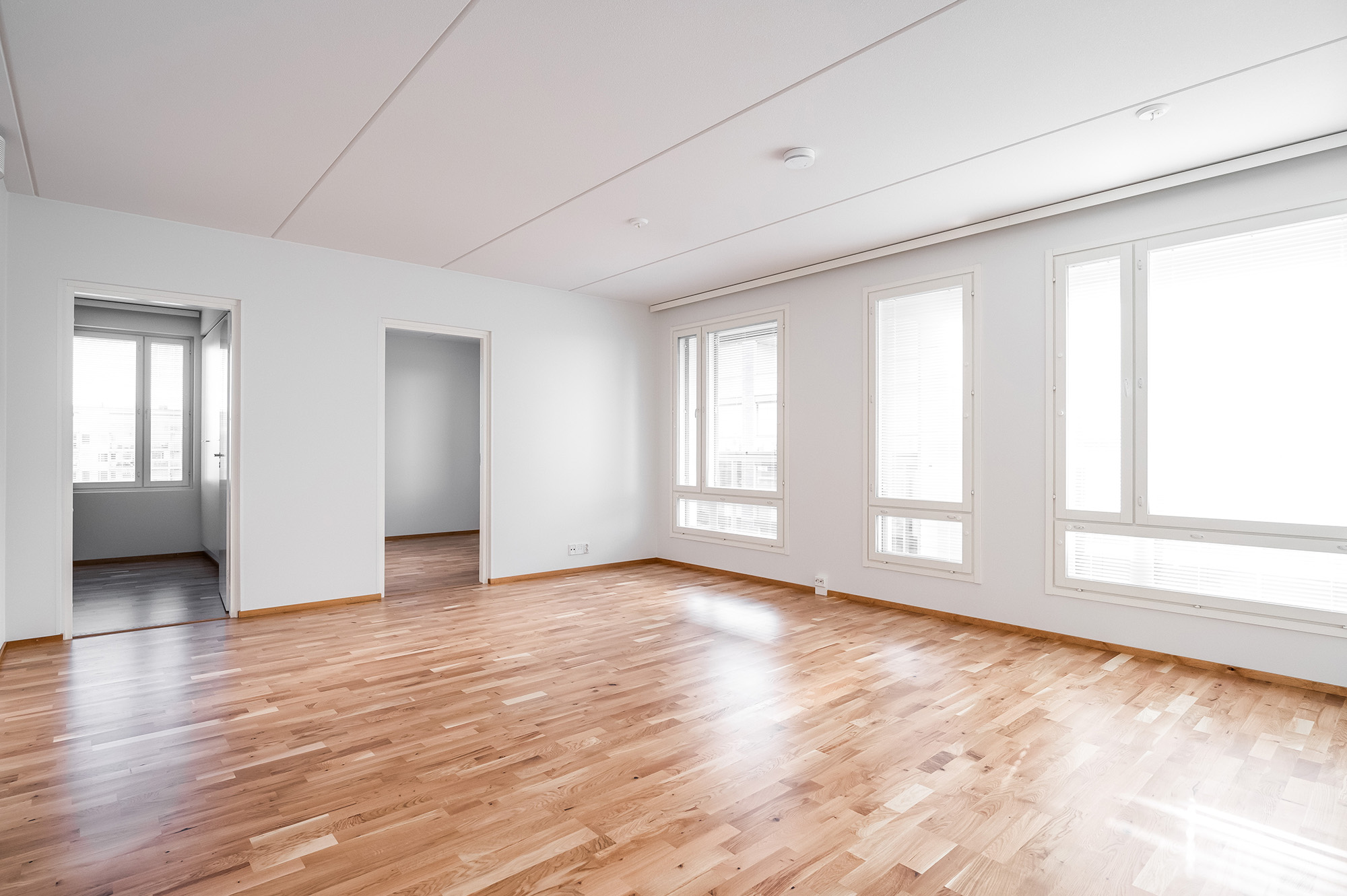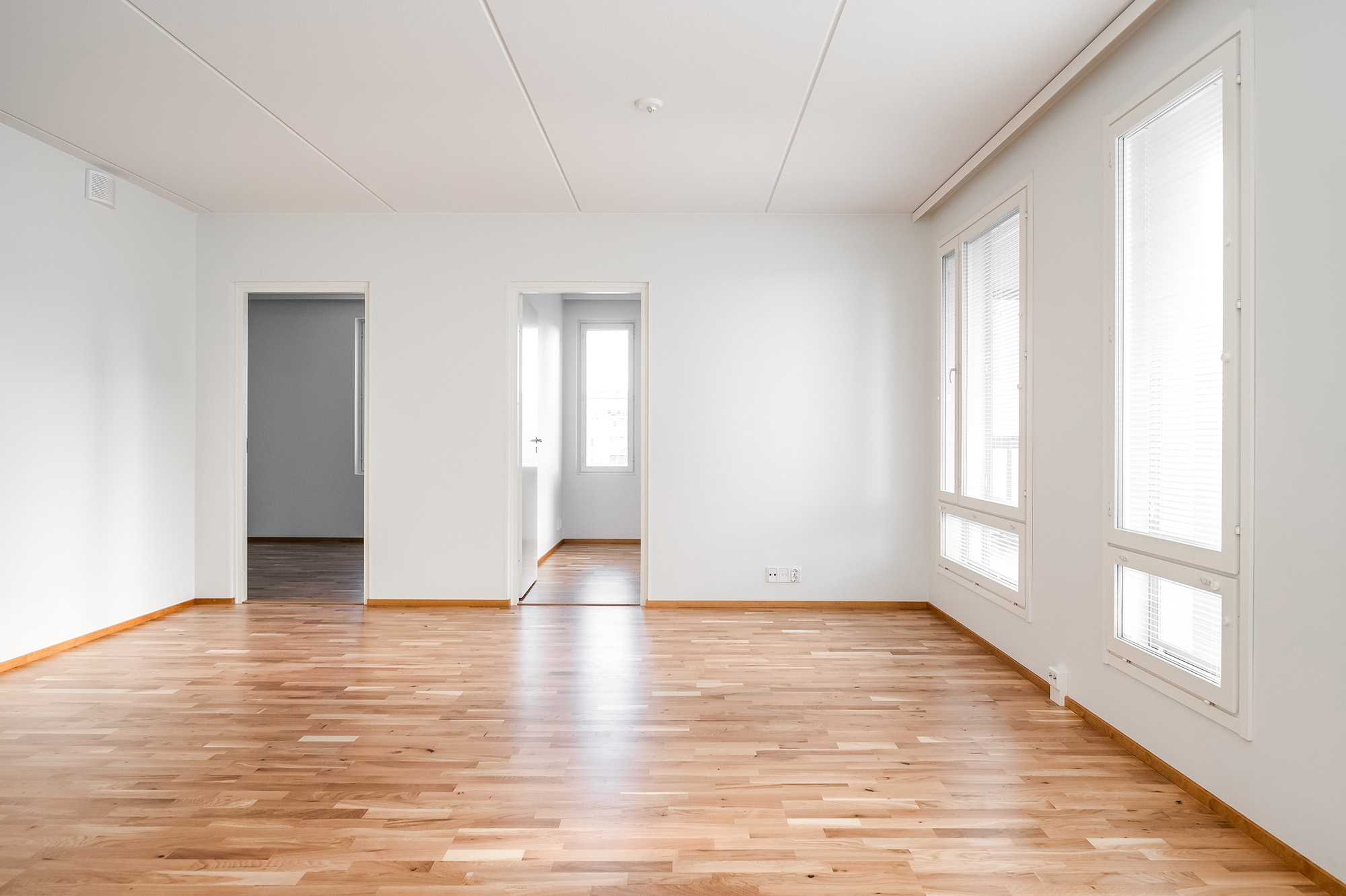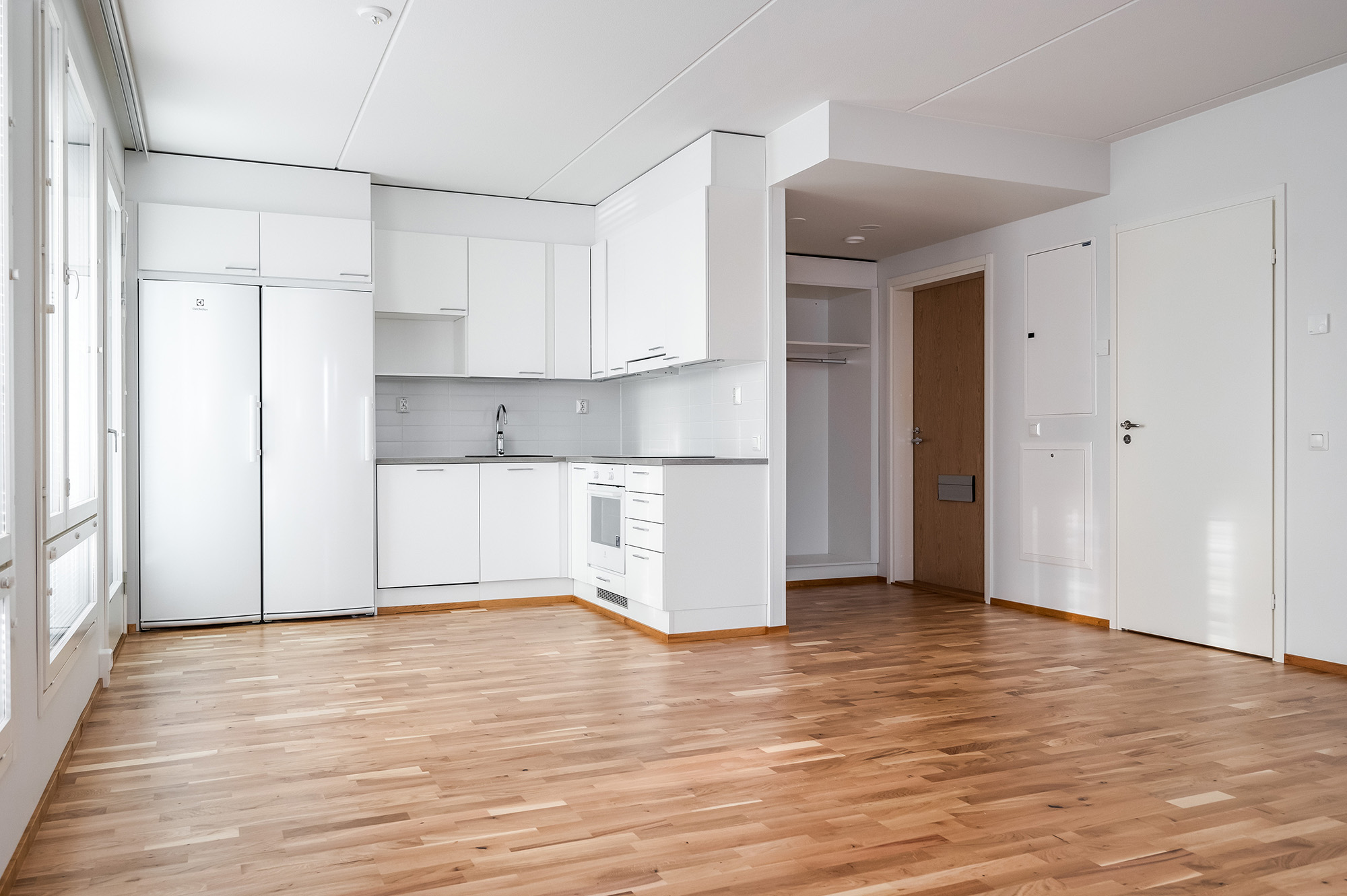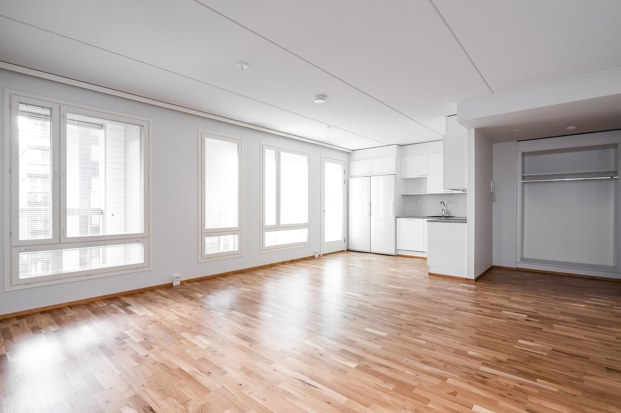 Hurmaava kolmio rakennuksen kulmalta, jossa huikean kokoinen etelään päin suuntaava parveke ja näyttävä sauna. Molemmat makuuhuoneet ovat mukavankokoisia. Olohuoneen ja keittiön yhdistelmä on erittäin avara. Auringonvalo säteilee sisään isoista etelänpuoleisista ikkunoista.
