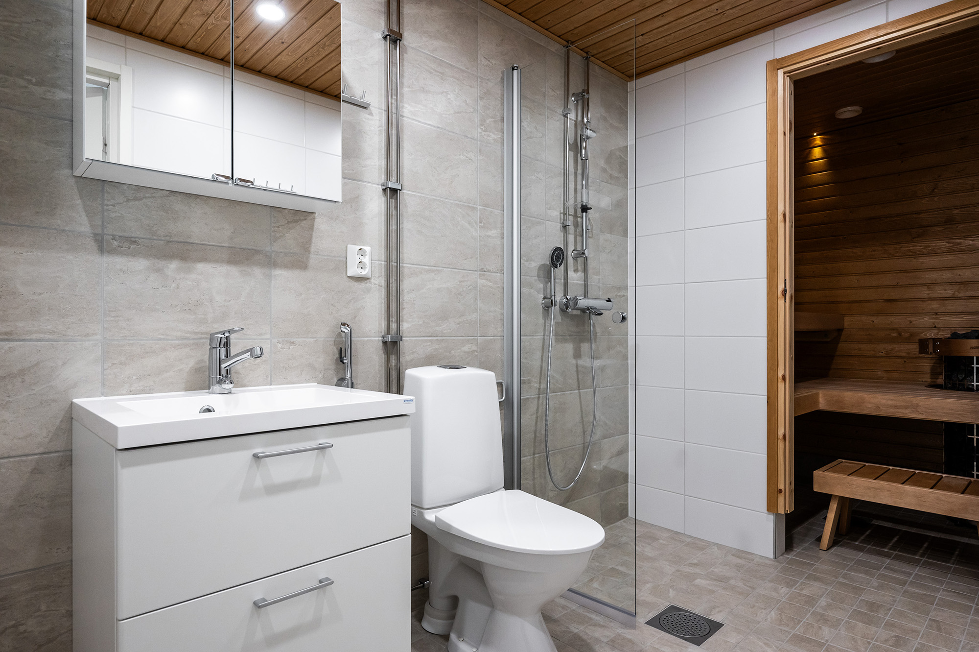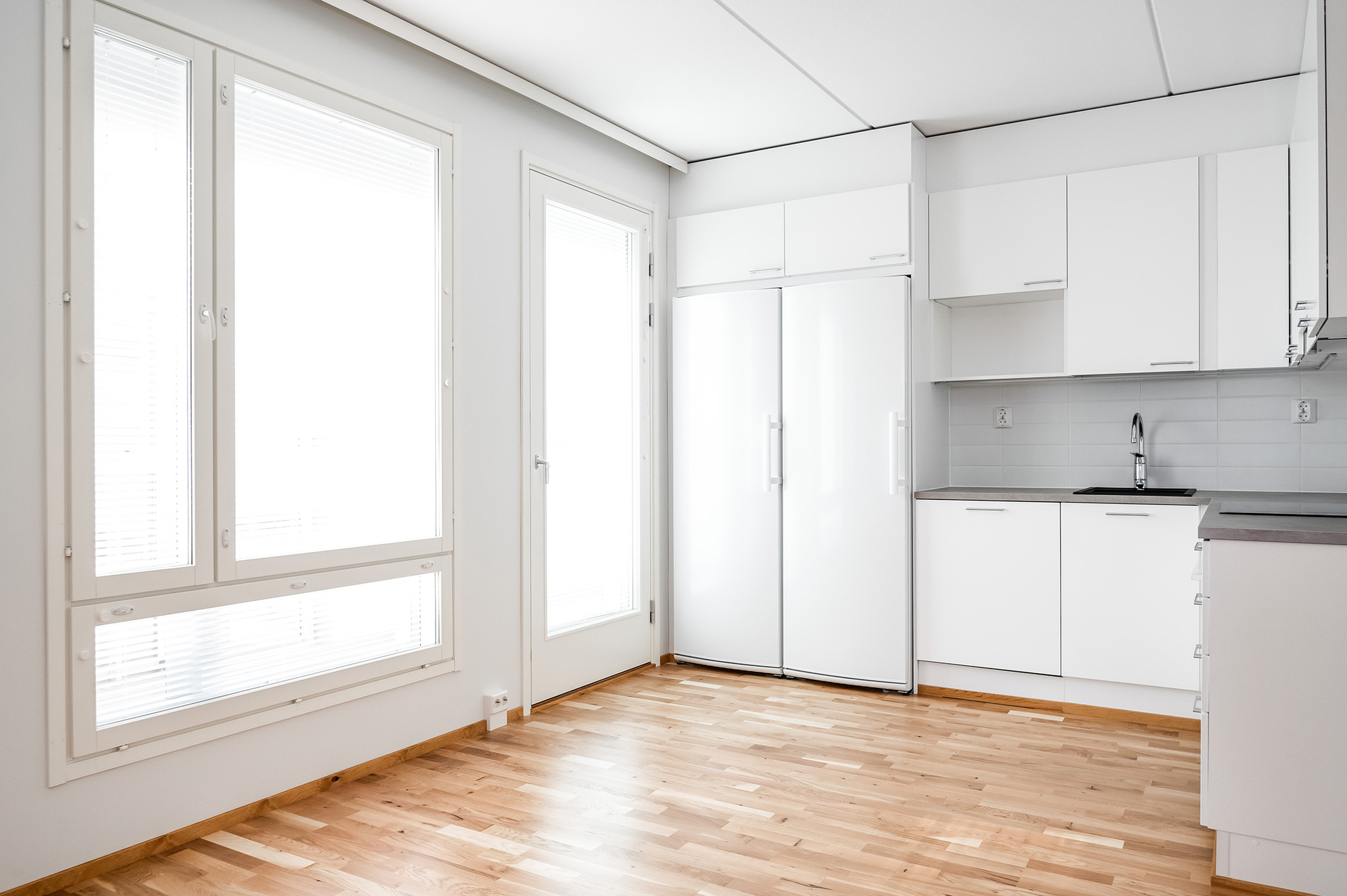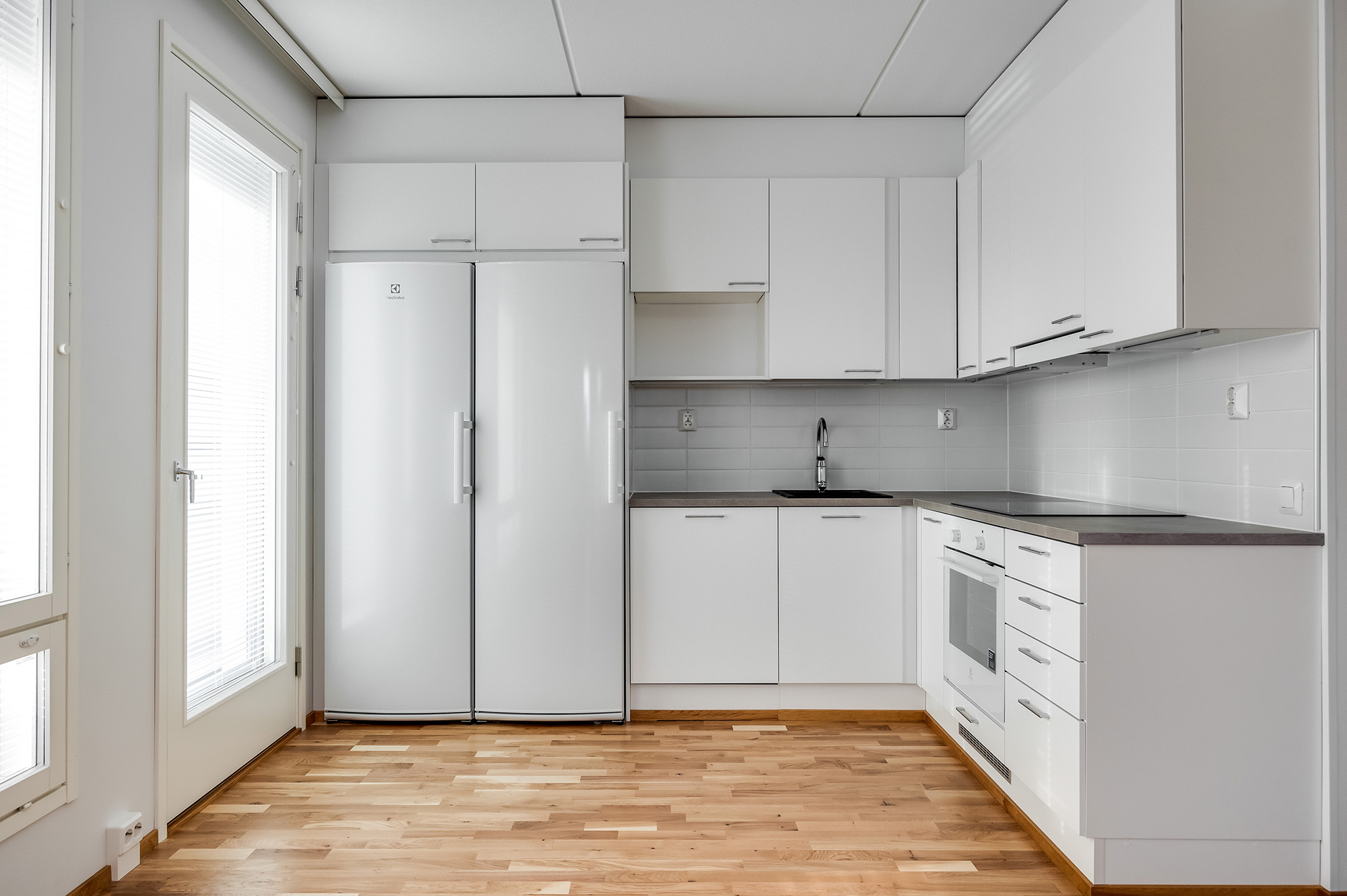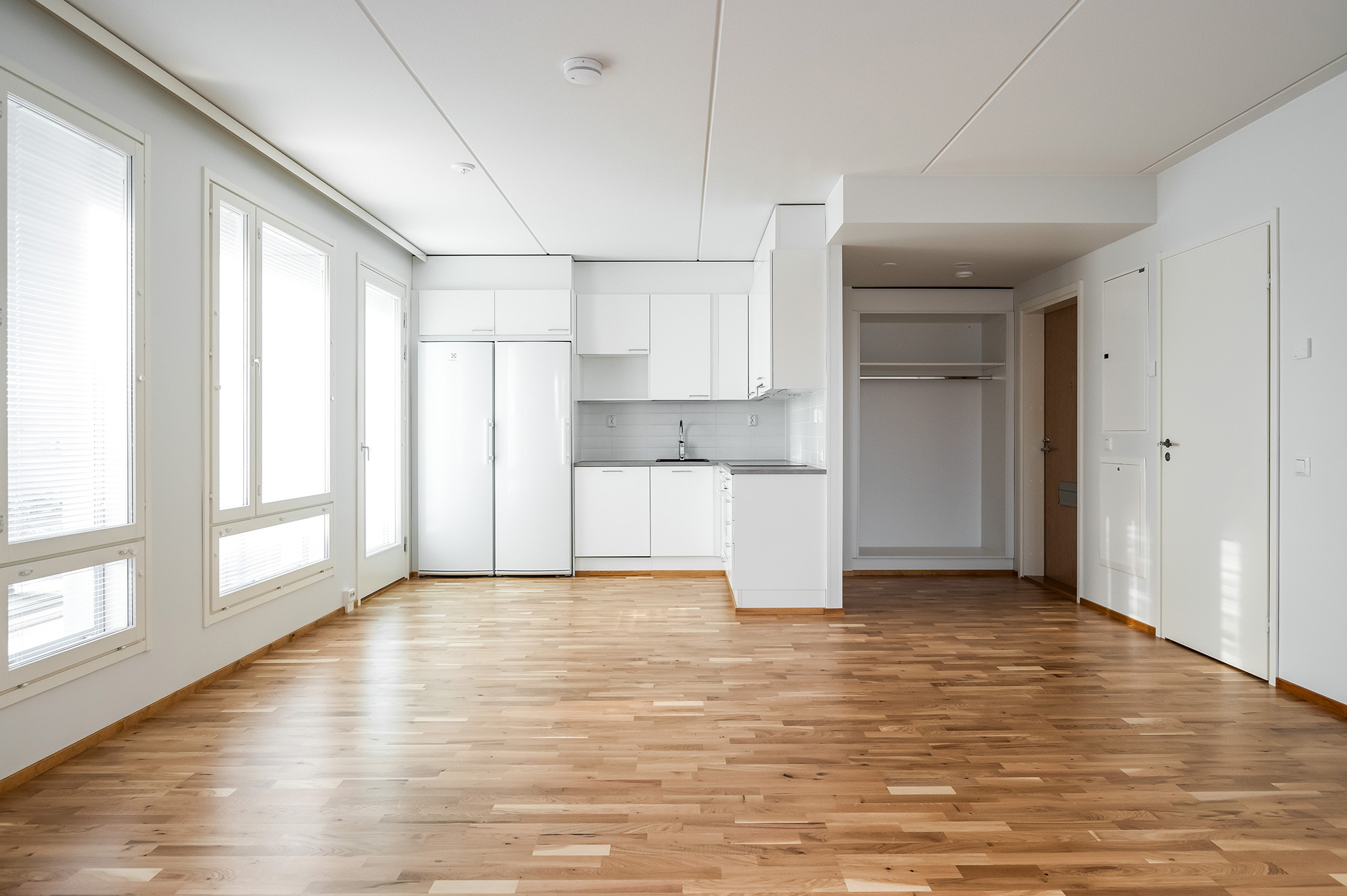 Hurmaava kolmio rakennuksen kulmalta, jossa huikean kokoinen etelään päin suuntaava parveke ja näyttävä sauna. Molemmat makuuhuoneet ovat mukavankokoisia. Olohuoneen ja keittiön yhdistelmä on erittäin avara. Auringonvalo säteilee sisään isoista etelänpuoleisista ikkunoista.