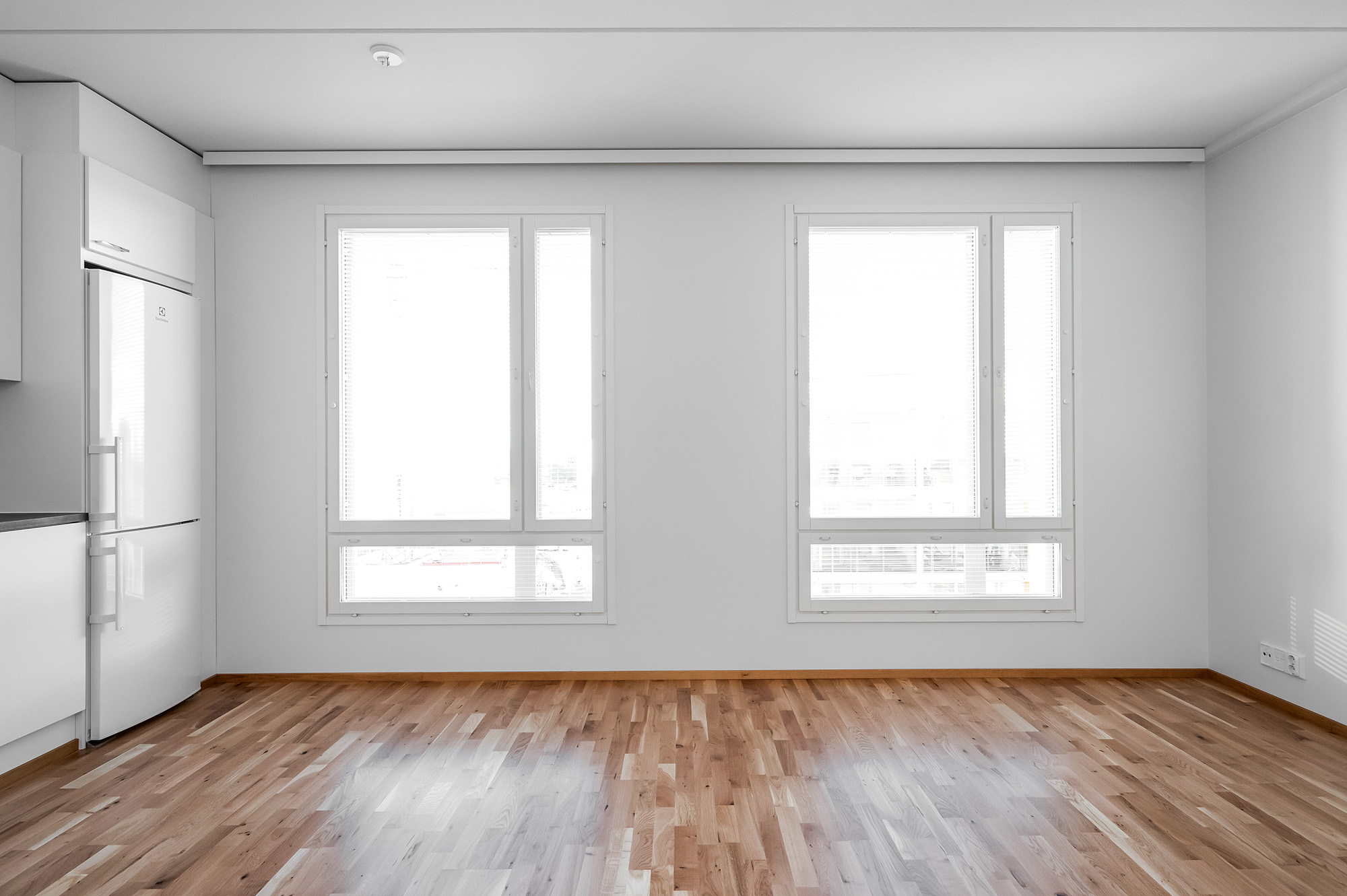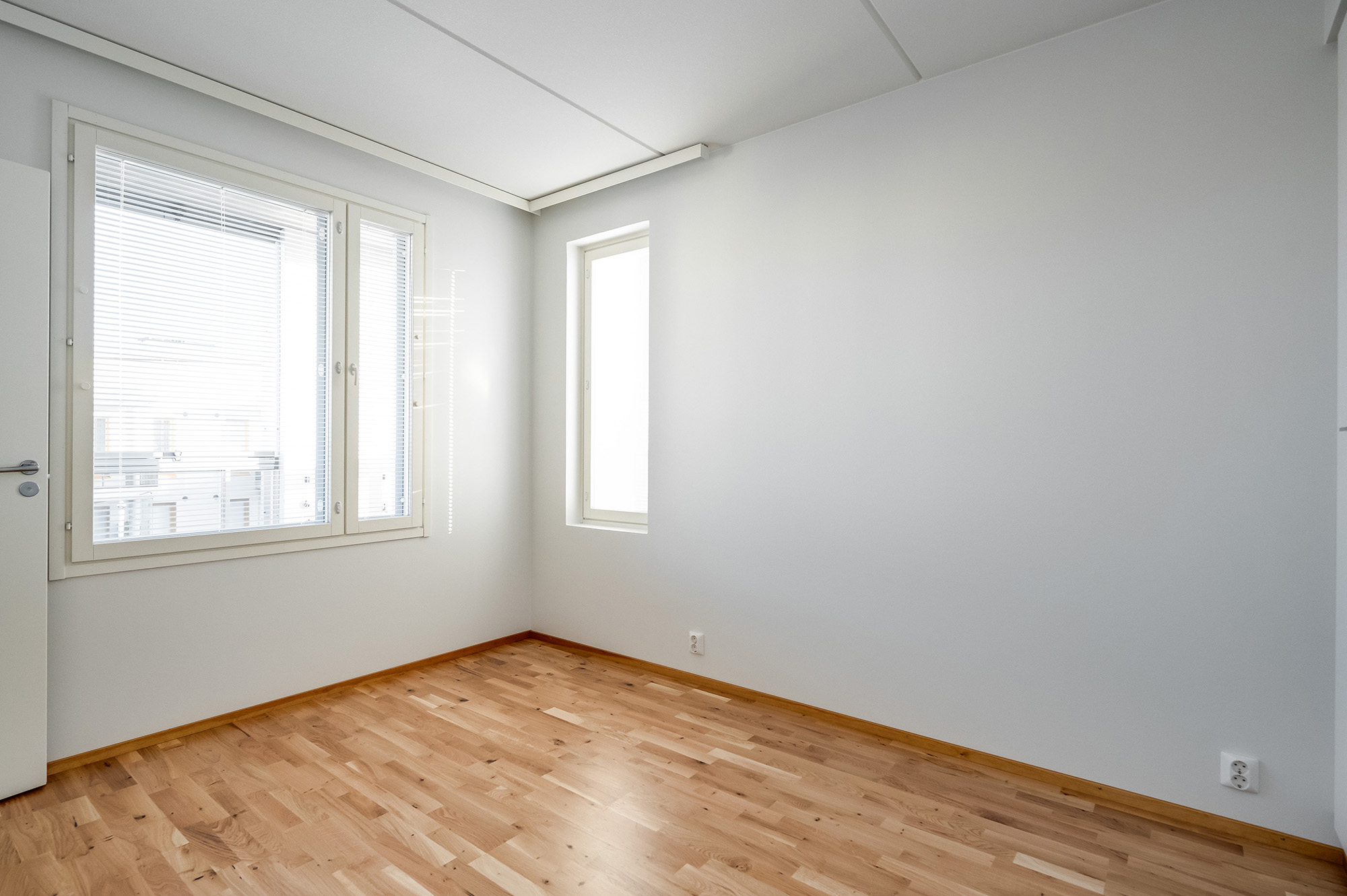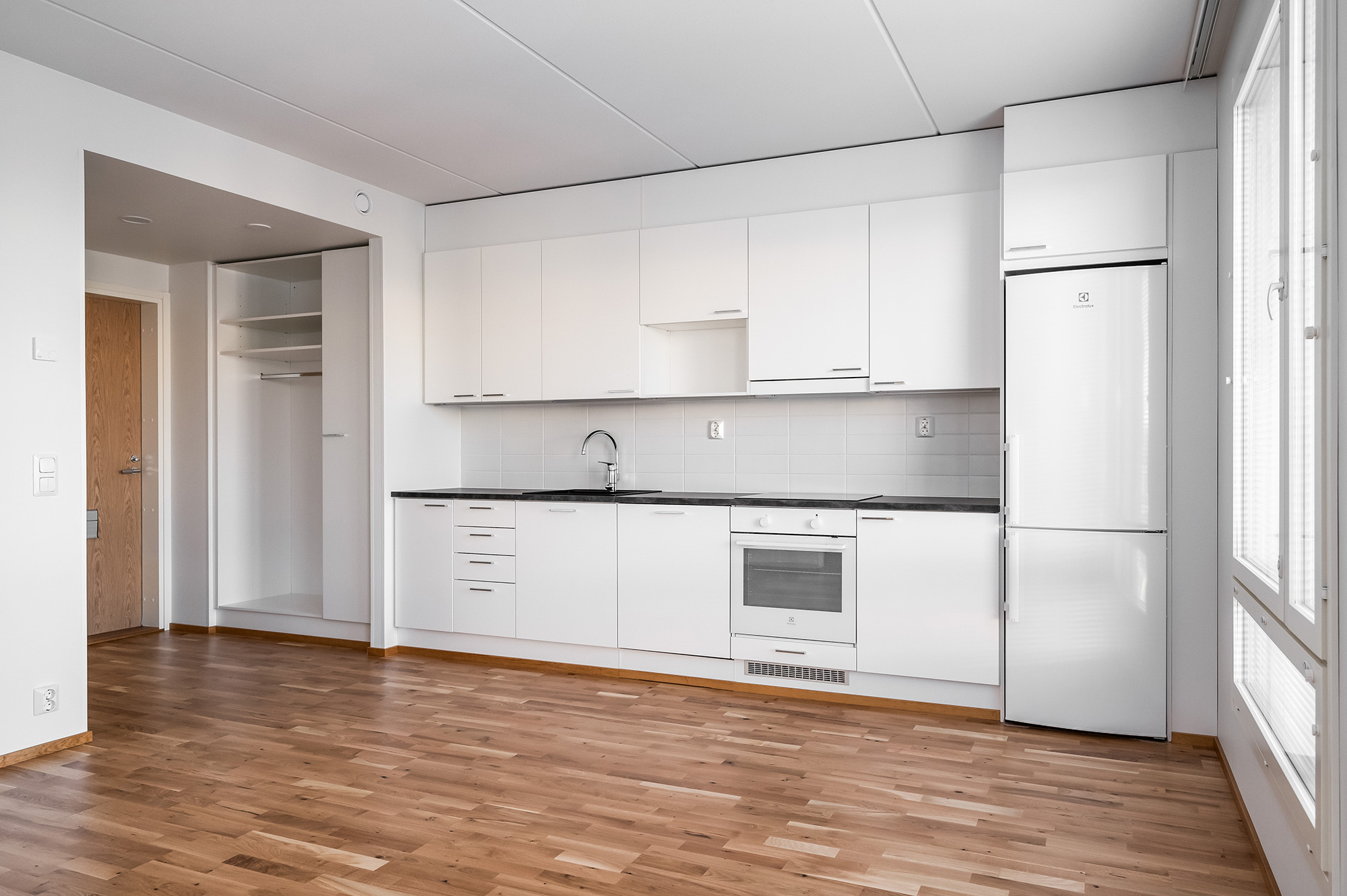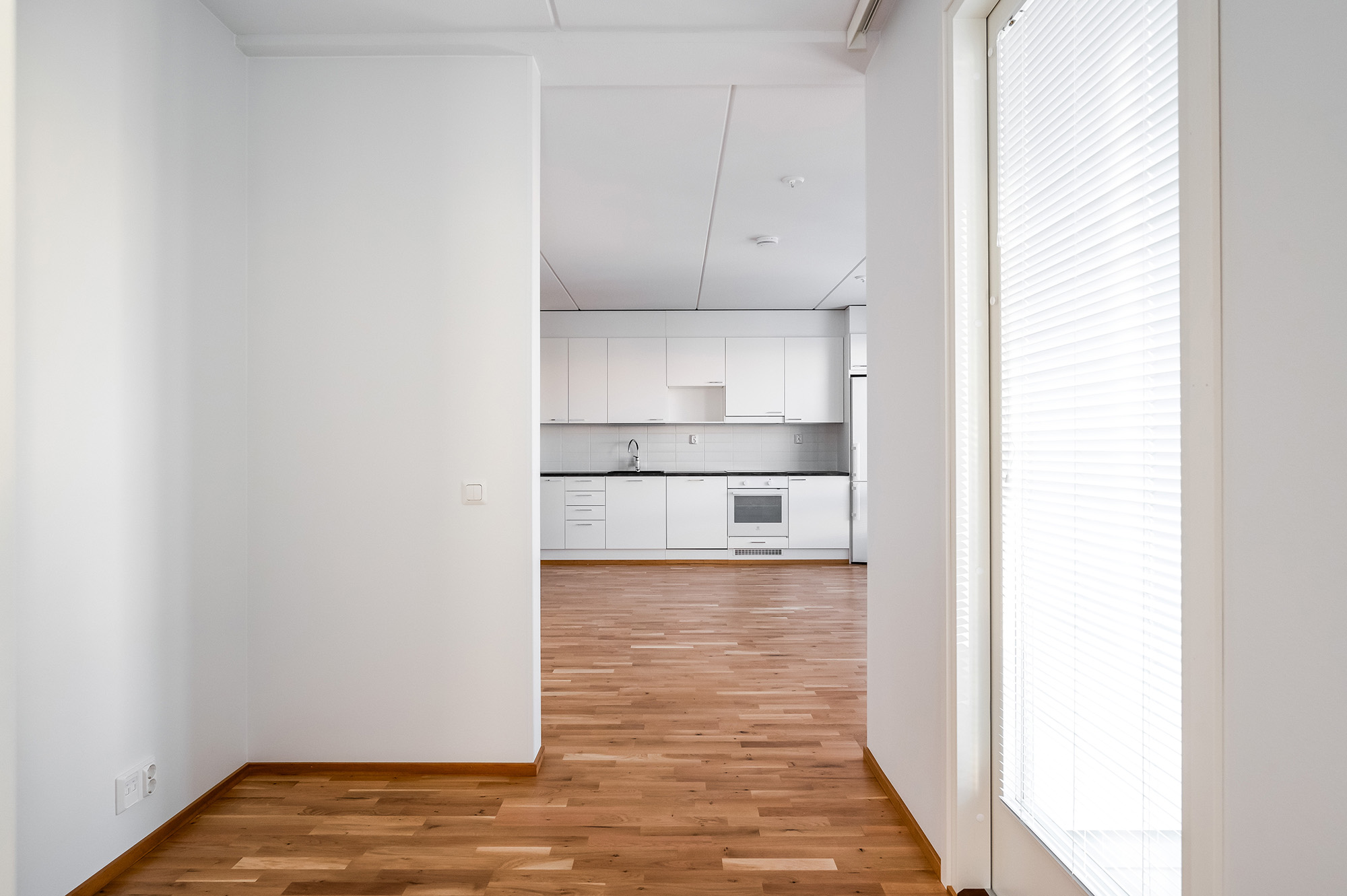 Rakennuksen kulmassa tilava kaksio näyttävällä saunalla. Kylpyhuoneessa on tilaa kodinhoidolle. Olohuoneessa riittää avaruutta olennaisimmille kalusteille. Makuuhuone on mukavan tilava. Alkovitilan voi sisustaa erilaisiin käyttötarkoituksiin, esim. kotitoimistoksi. Kivalta kulmaparvekkeelta avautuu näkymiä kahteen suuntaan.