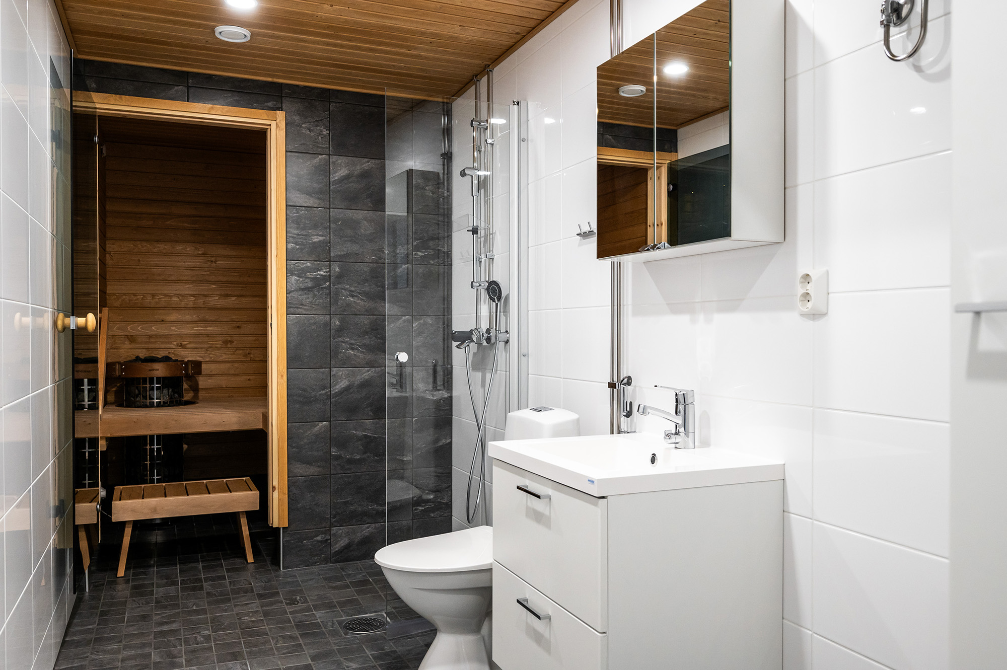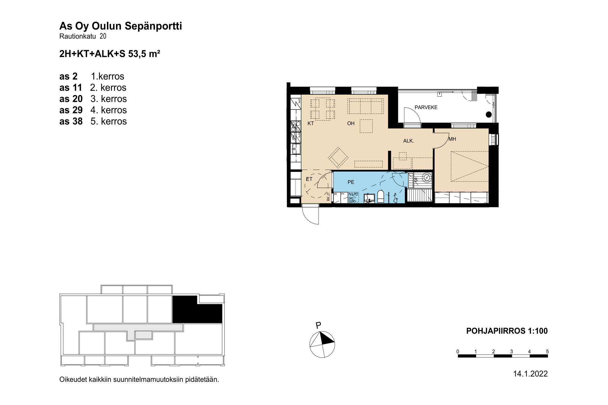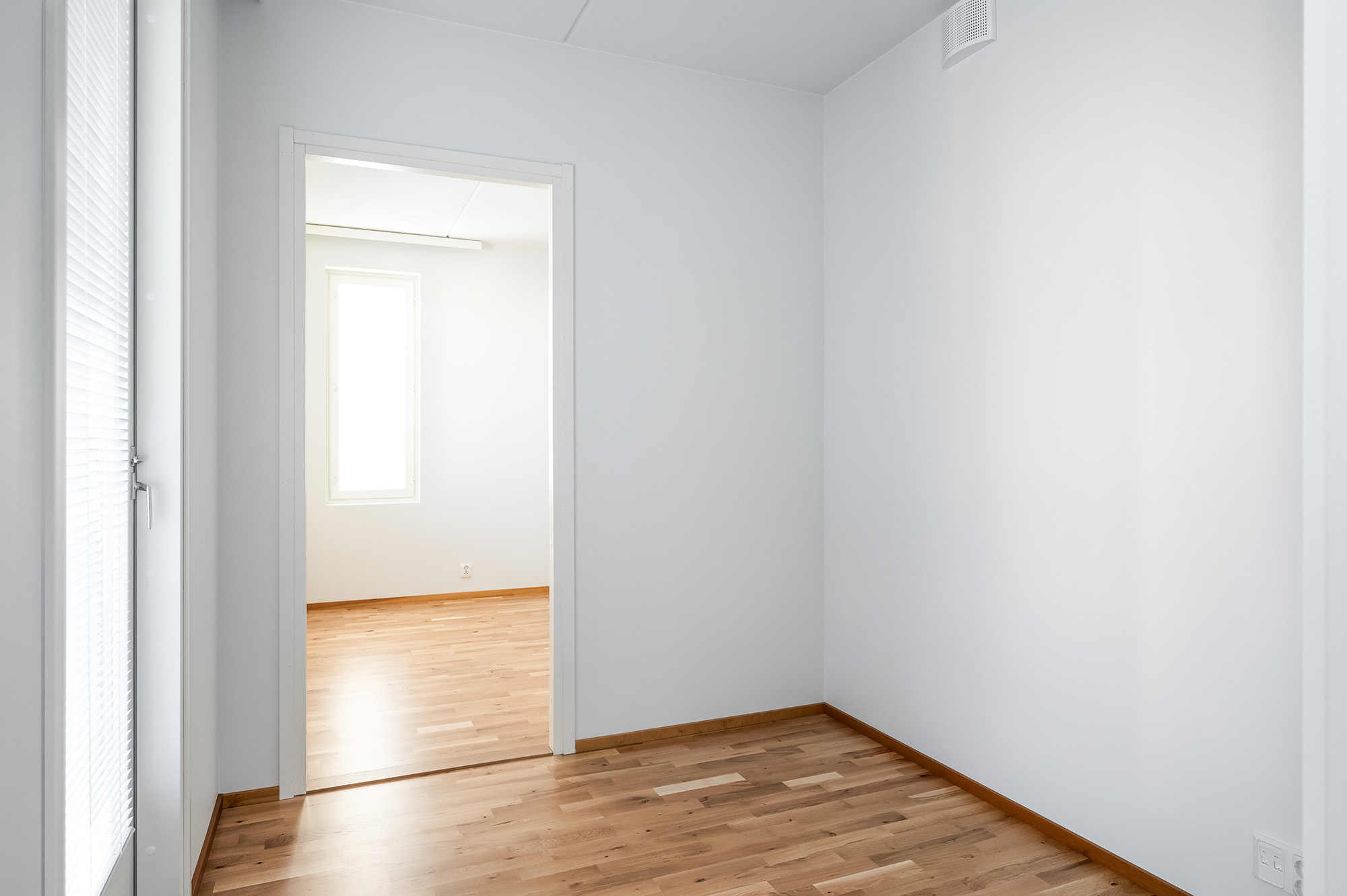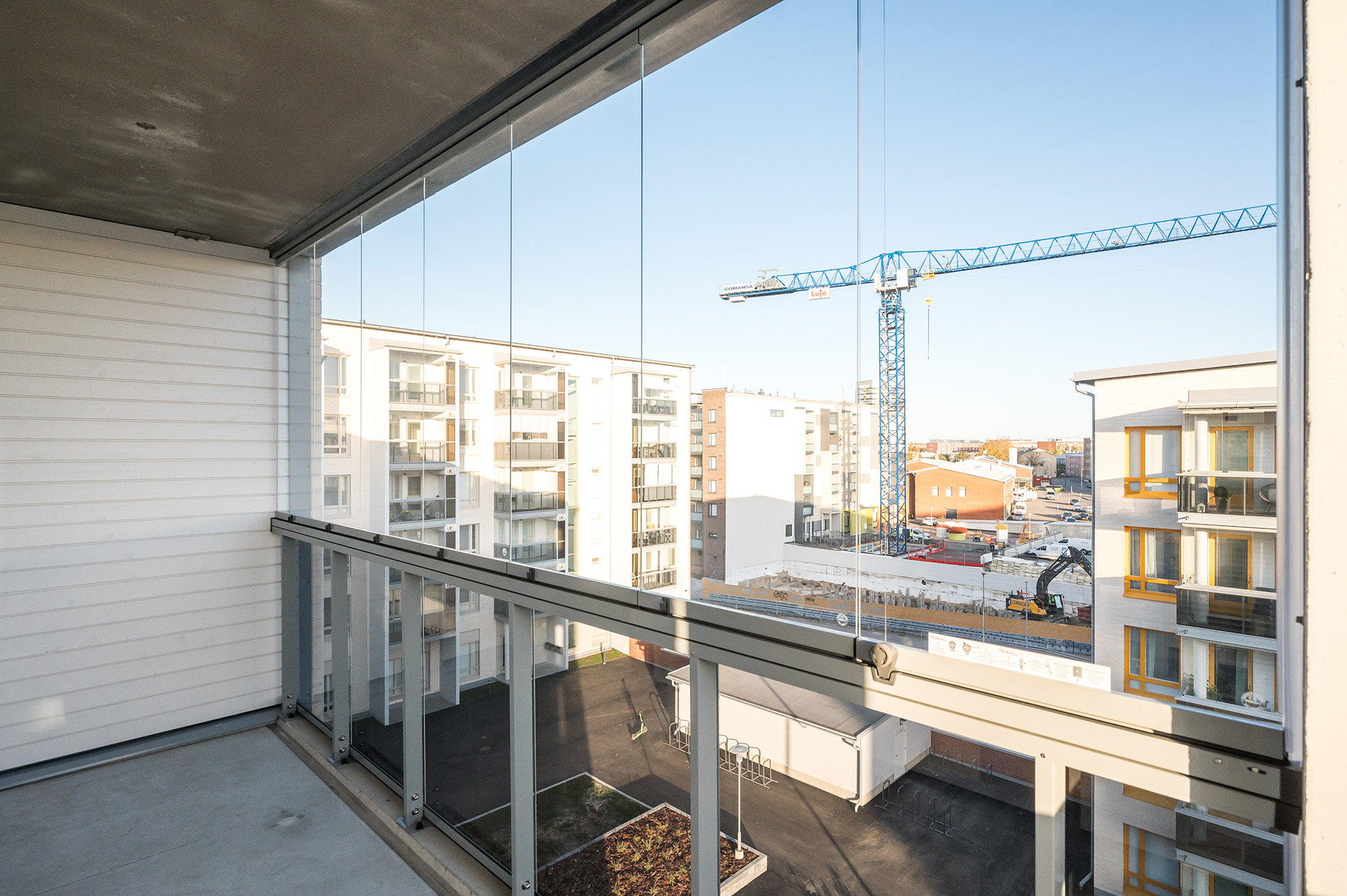Rakennuksen kulmassa tilava kaksio näyttävällä saunalla. Kylpyhuoneessa on tilaa kodinhoidolle. Olohuoneessa riittää avaruutta olennaisimmille kalusteille. Makuuhuone on mukavan tilava. Alkovitilan voi sisustaa erilaisiin käyttötarkoituksiin, esim. kotitoimistoksi. Kivalta kulmaparvekkeelta avautuu näkymiä kahteen suuntaan.