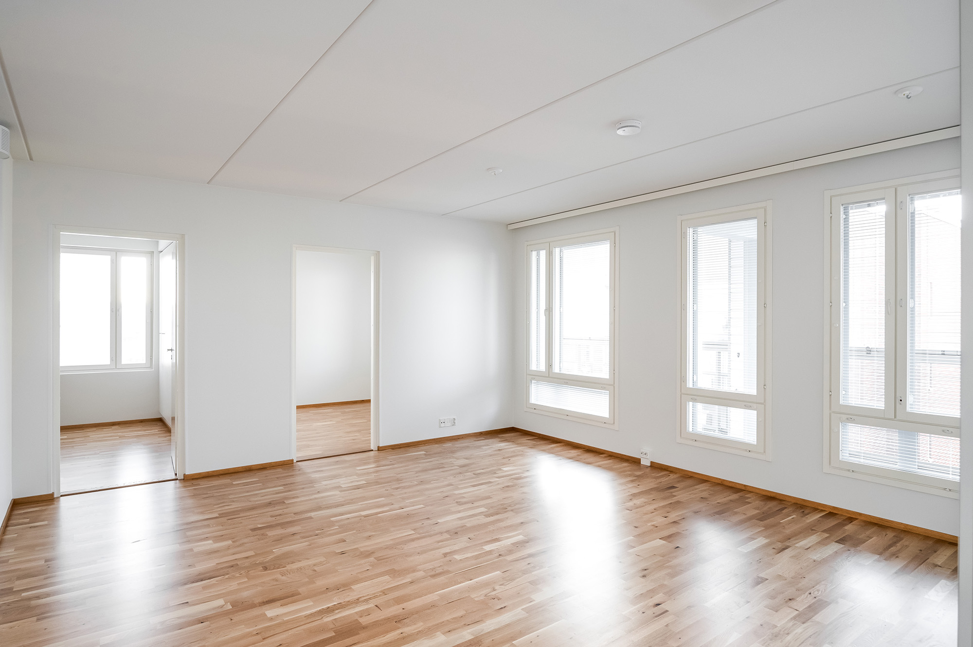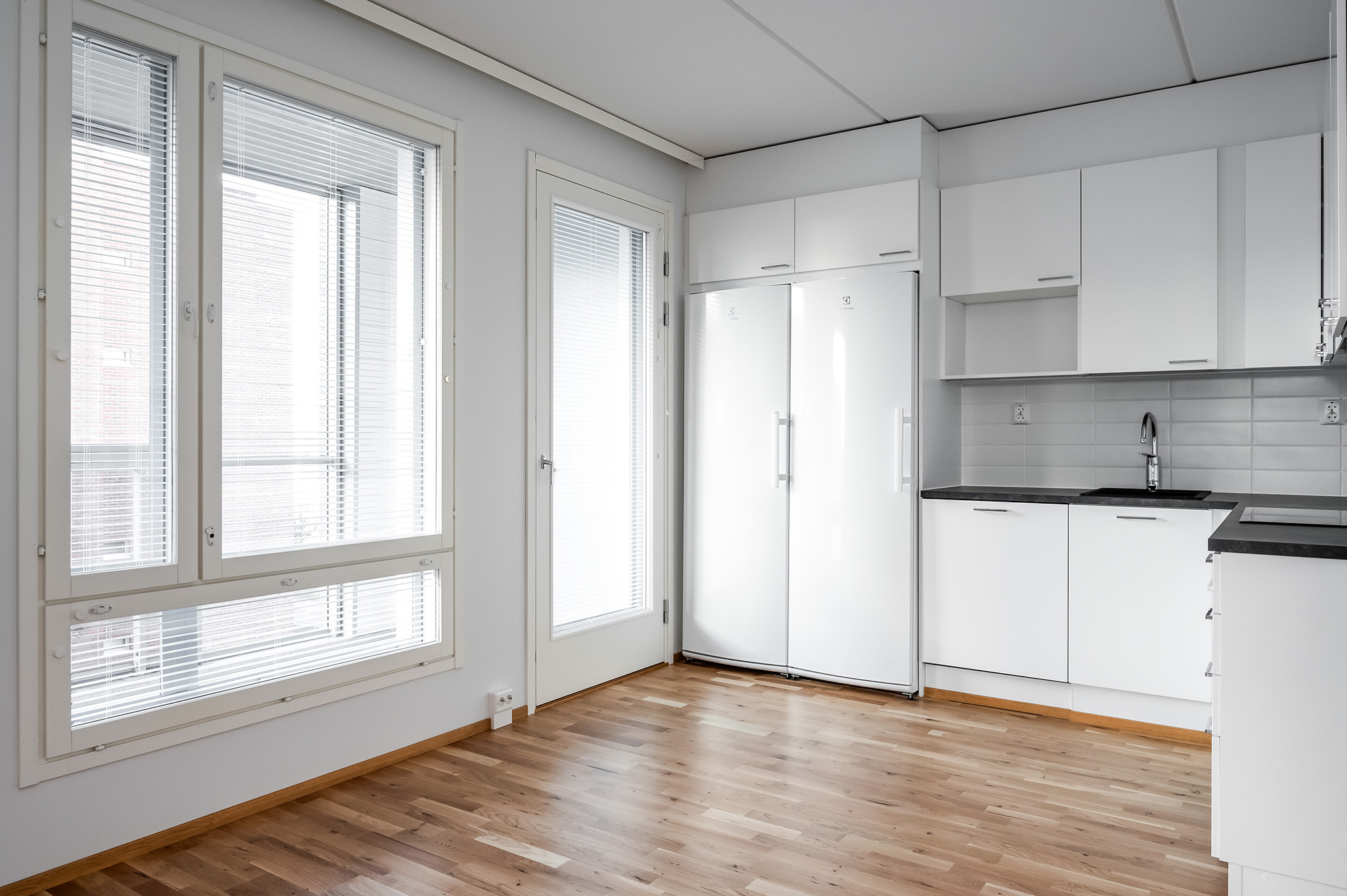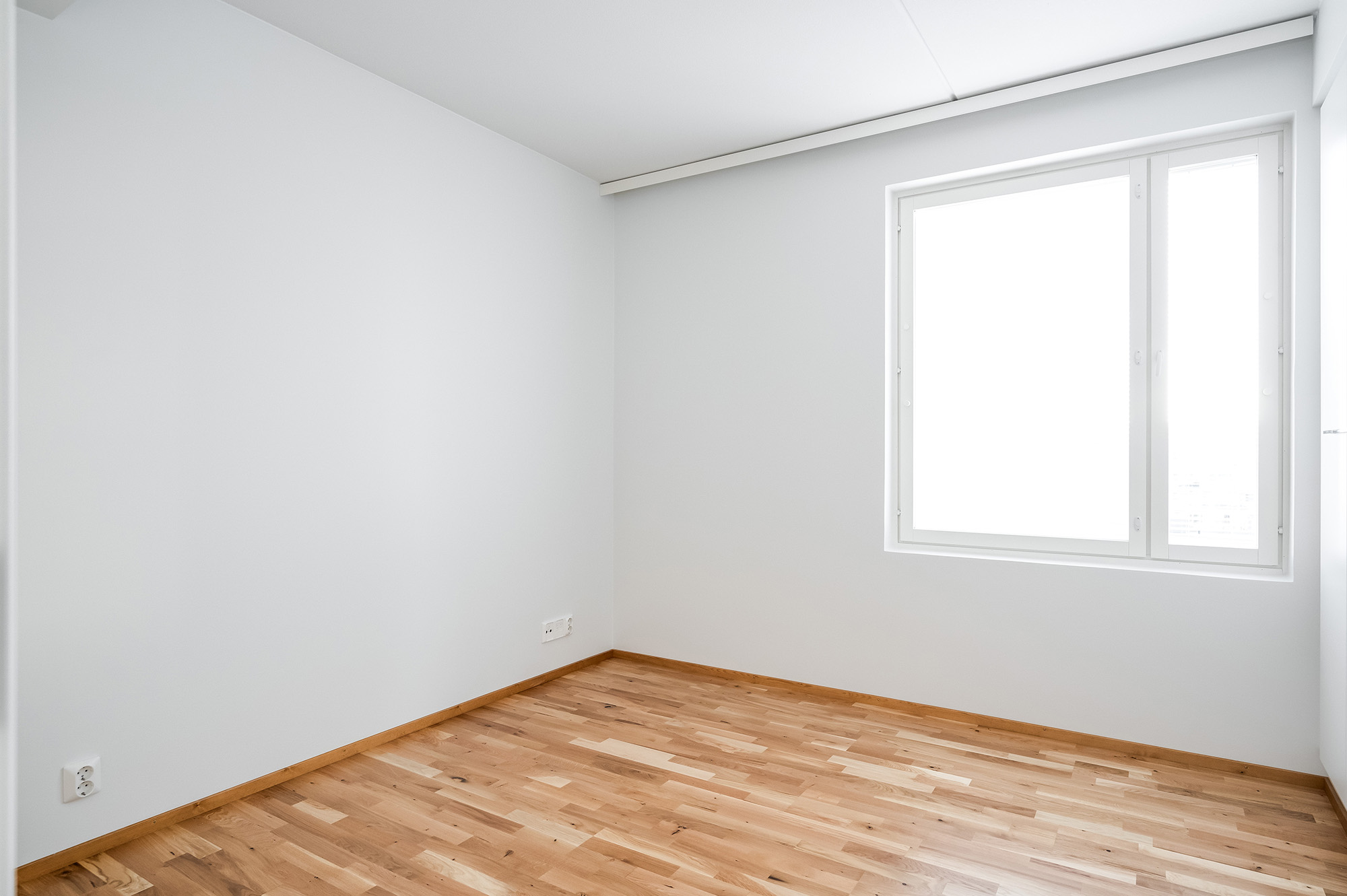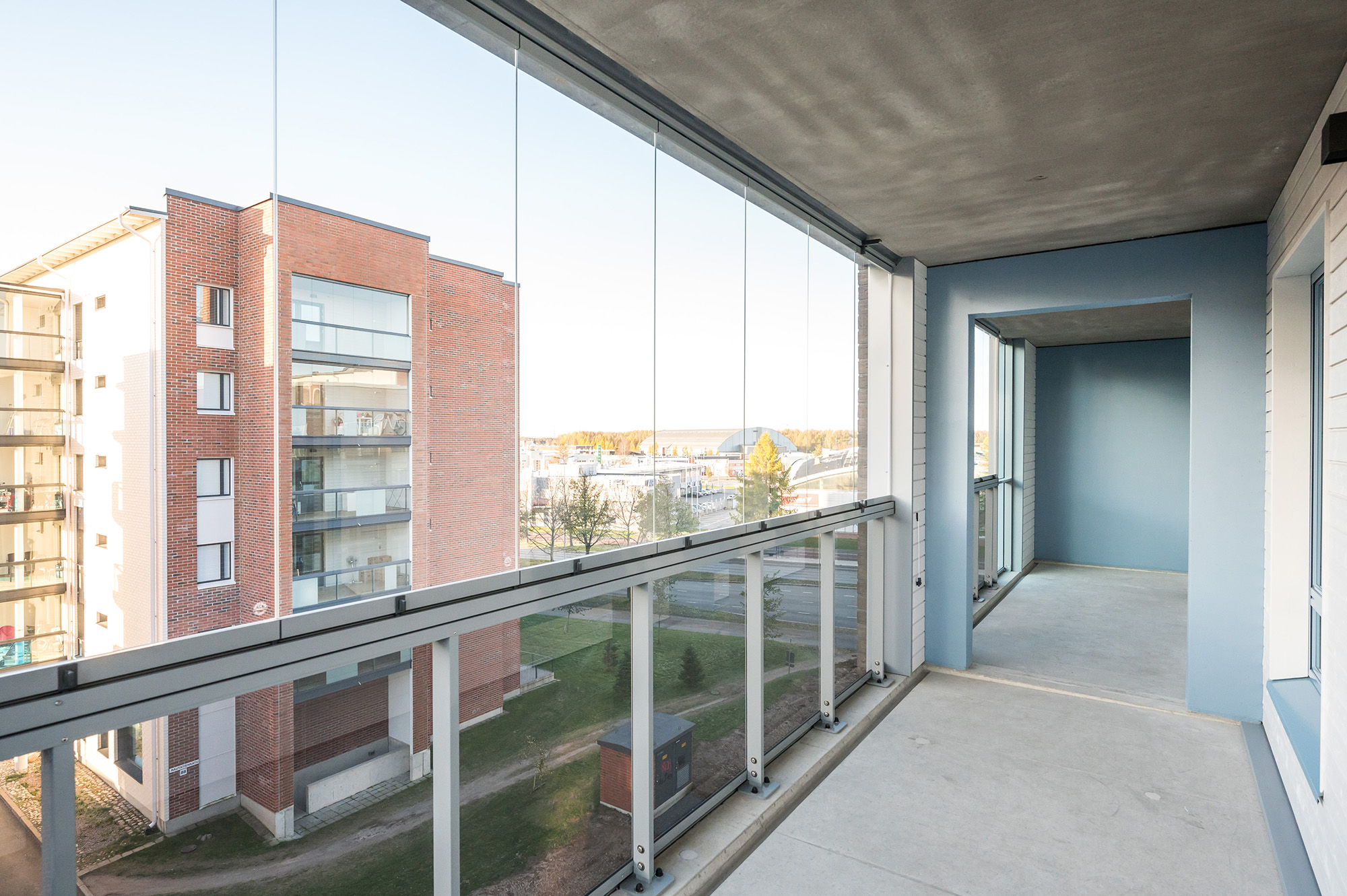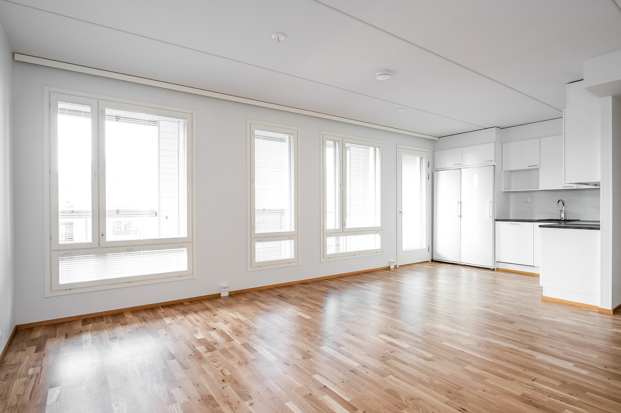 Hurmaava kolmio rakennuksen kulmalta, jossa huikean kokoinen etelään päin suuntaava parveke ja näyttävä sauna. Molemmat makuuhuoneet ovat mukavankokoisia. Olohuoneen ja keittiön yhdistelmä on erittäin avara. Auringonvalo säteilee sisään isoista etelänpuoleisista ikkunoista.
