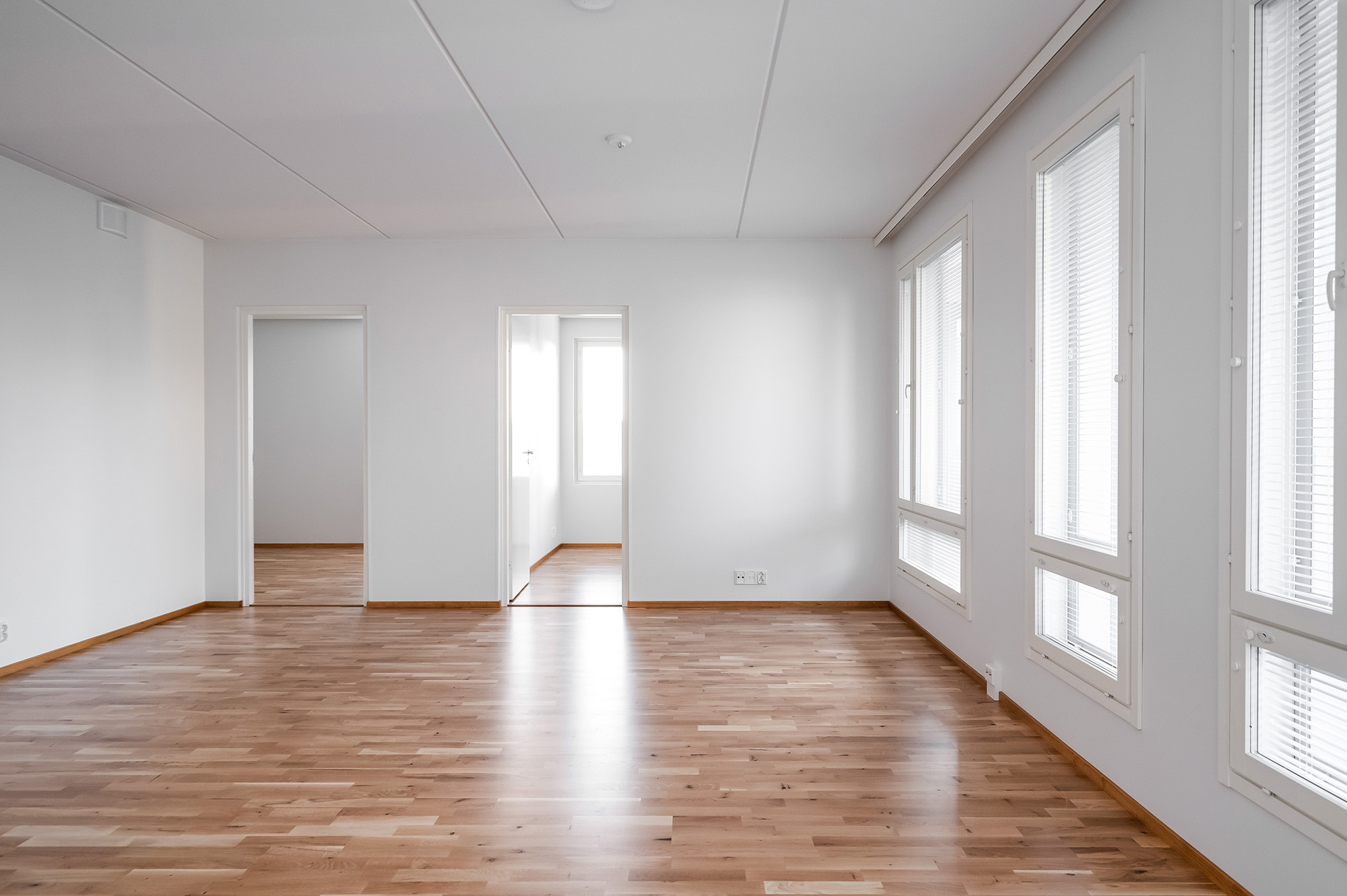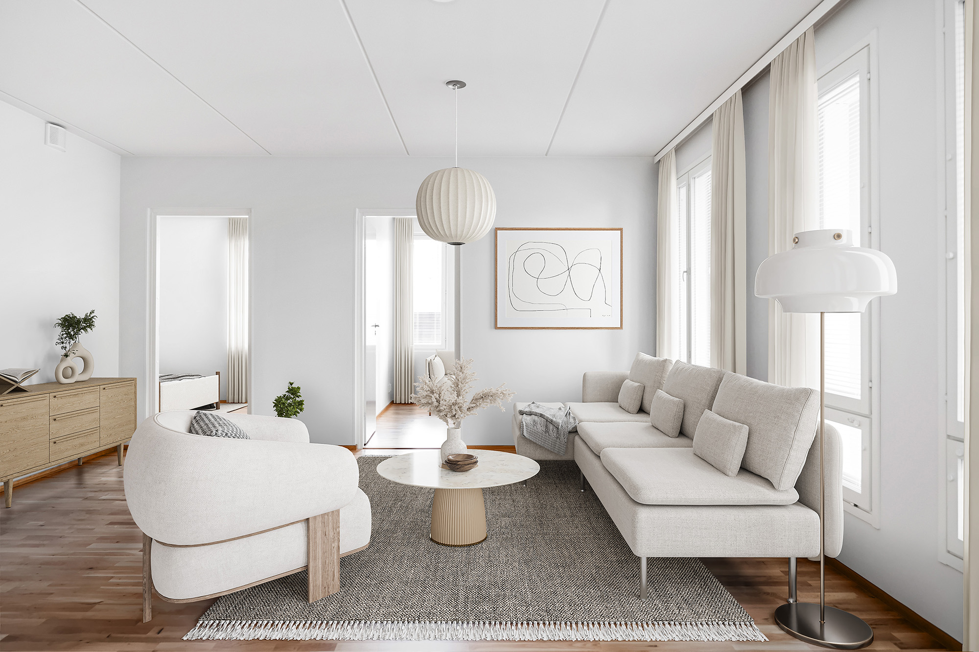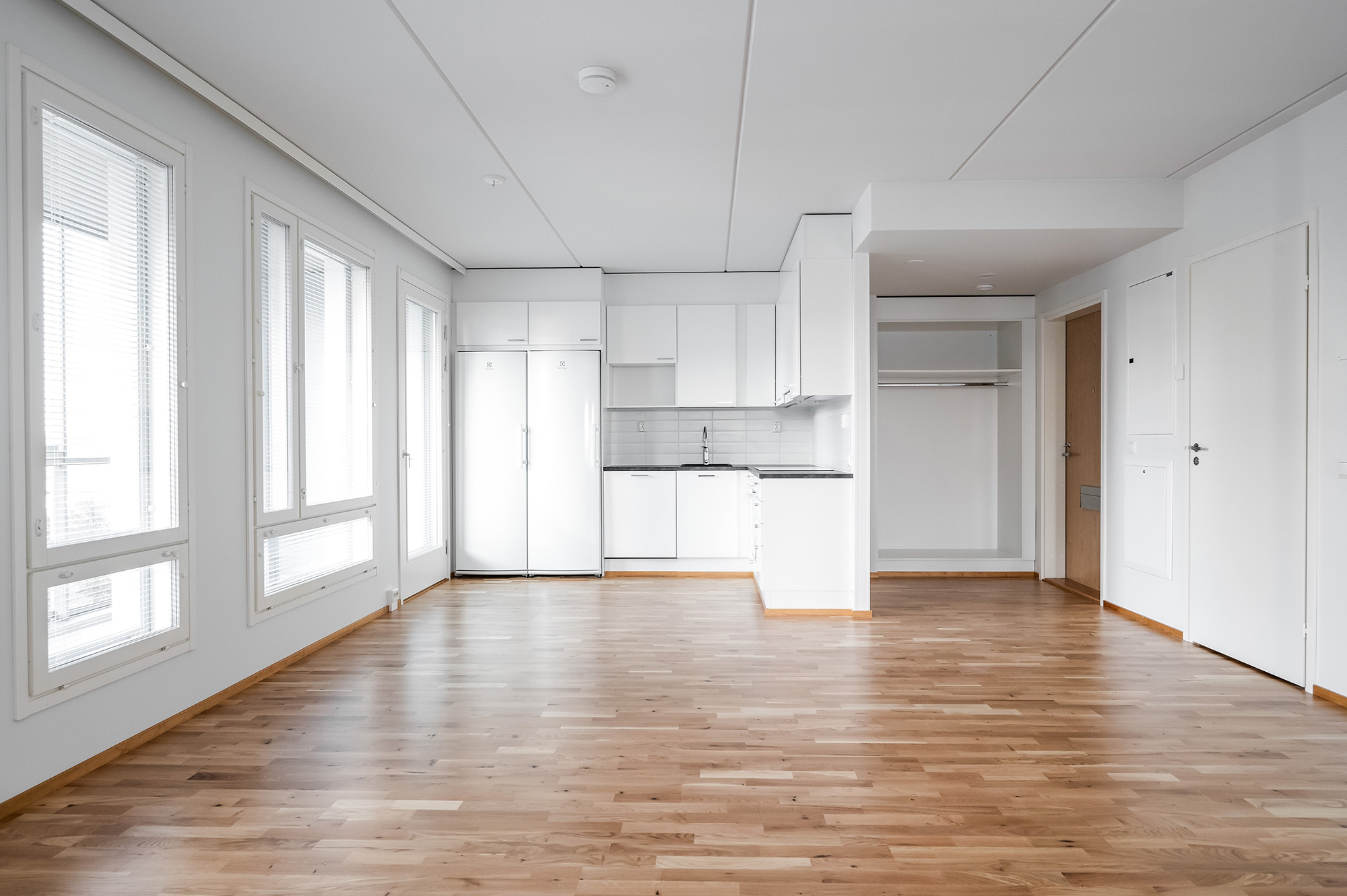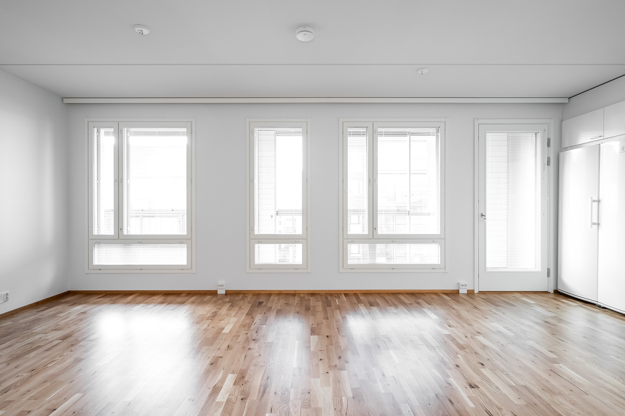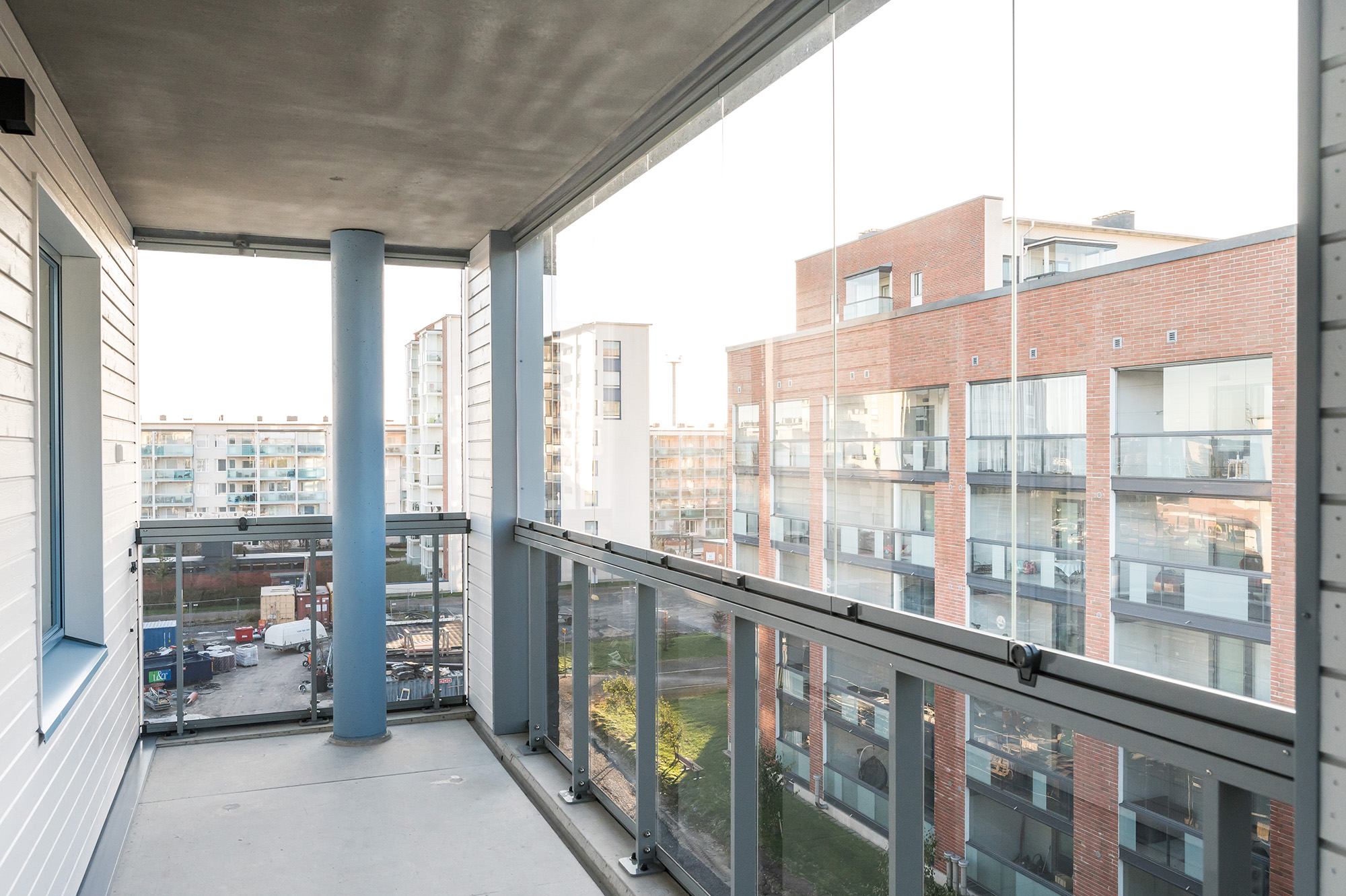Hurmaava kolmio rakennuksen kulmalta, jossa huikean kokoinen etelään päin suuntaava parveke ja näyttävä sauna. Molemmat makuuhuoneet ovat mukavankokoisia. Olohuoneen ja keittiön yhdistelmä on erittäin avara. Auringonvalo säteilee sisään isoista etelänpuoleisista ikkunoista.