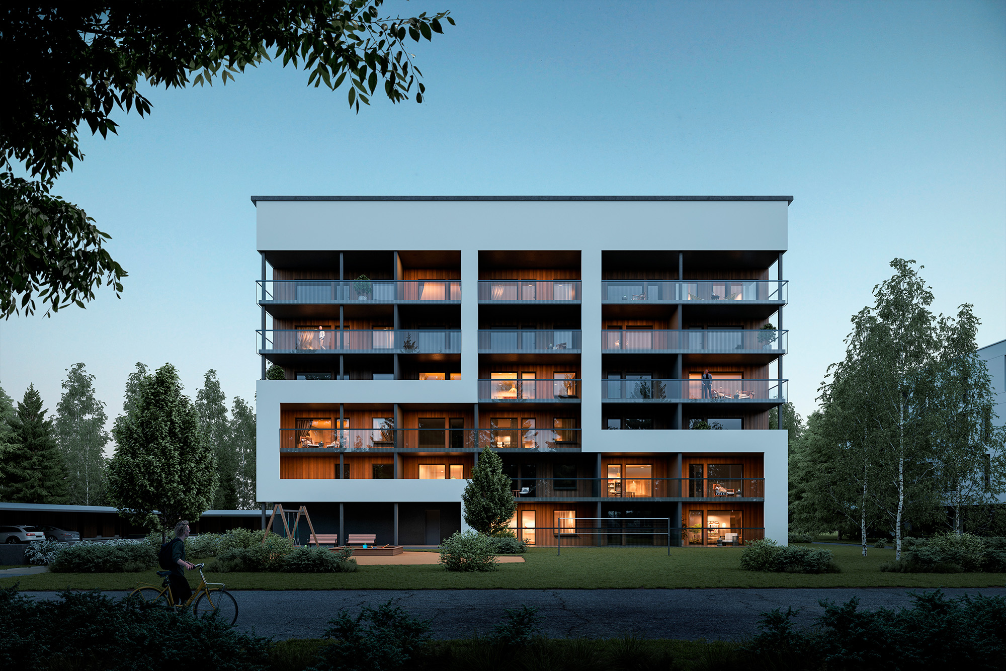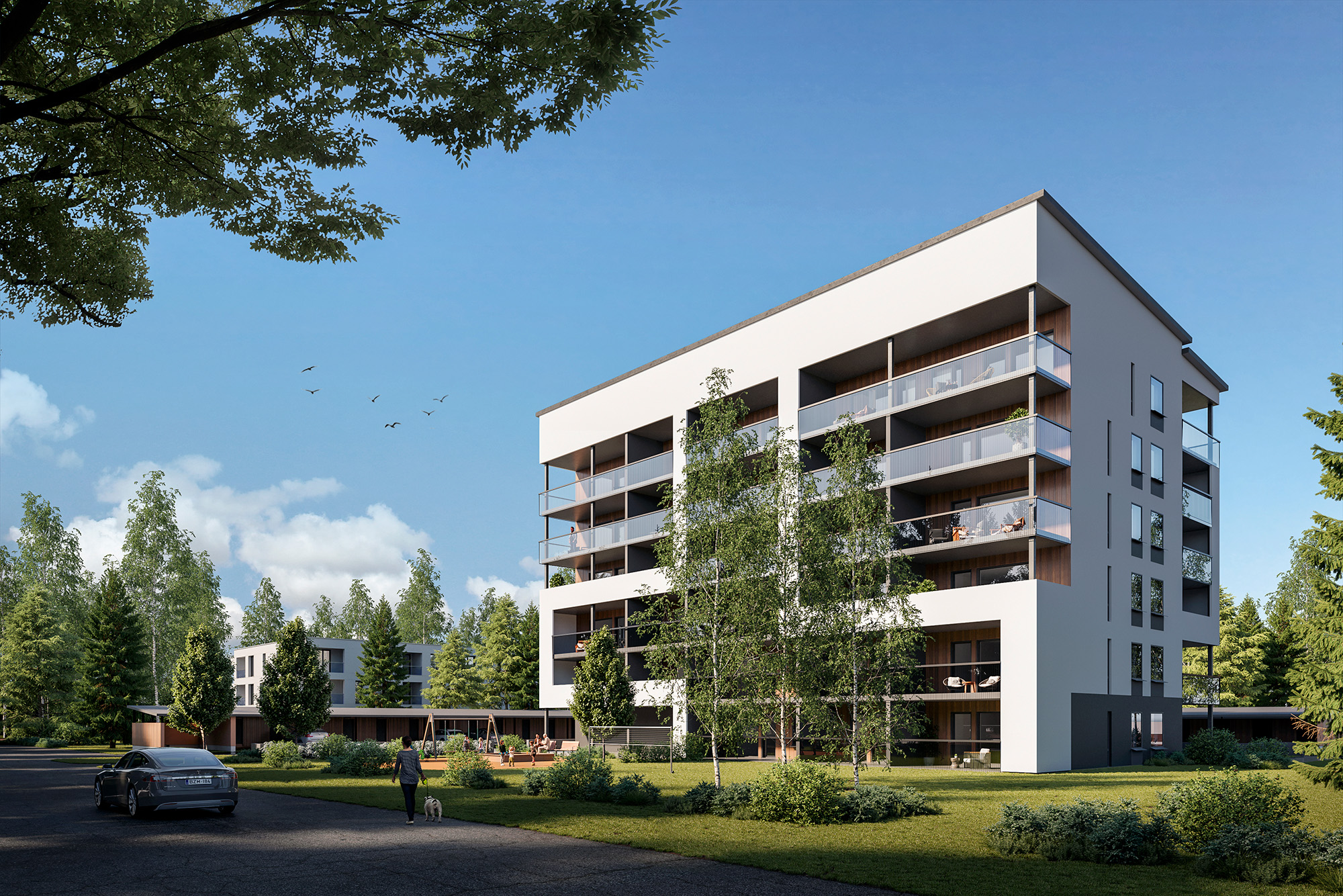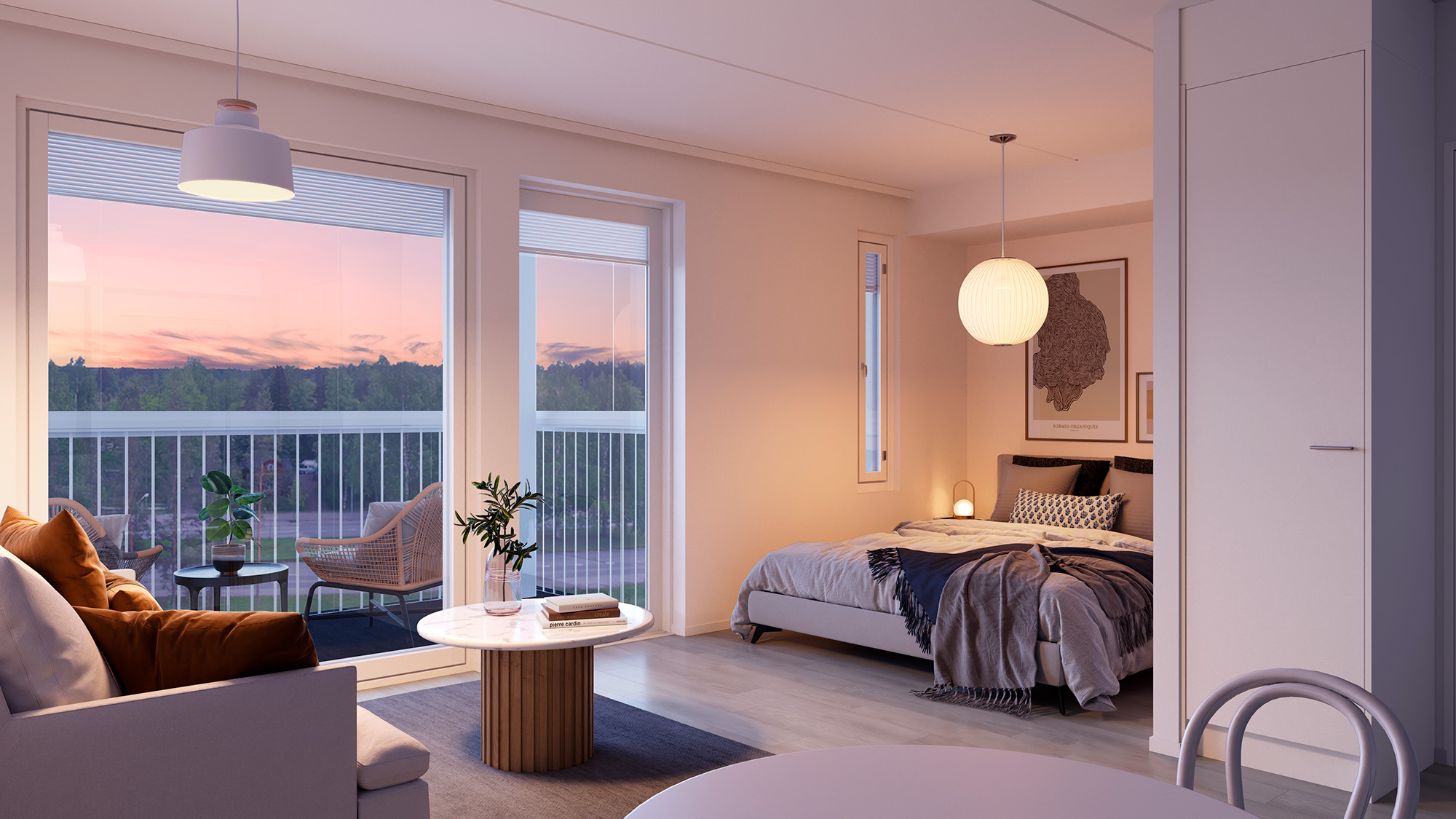 Asuntovalikoima yltää 32 m² yksiöistä ylimmän kerroksen saunalla, tilavalla vaatehuoneella ja koko asunnon levyisellä parvekkeella varustettuun 101,5 m² kolmioon. Jokaisessa asunnossa on lasitettu parveke, ja avaruuden tuntua lisää parvekkeelle avautuva lattiaan asti ulottuva olohuoneen ikkuna.