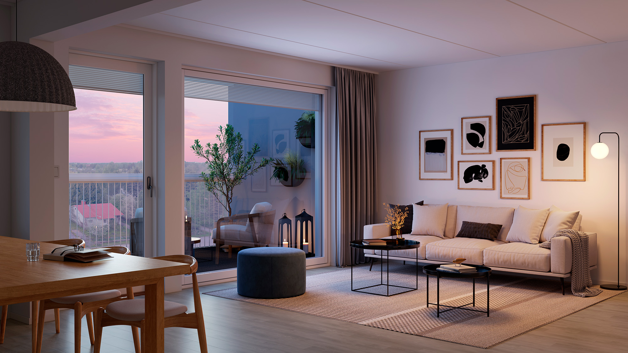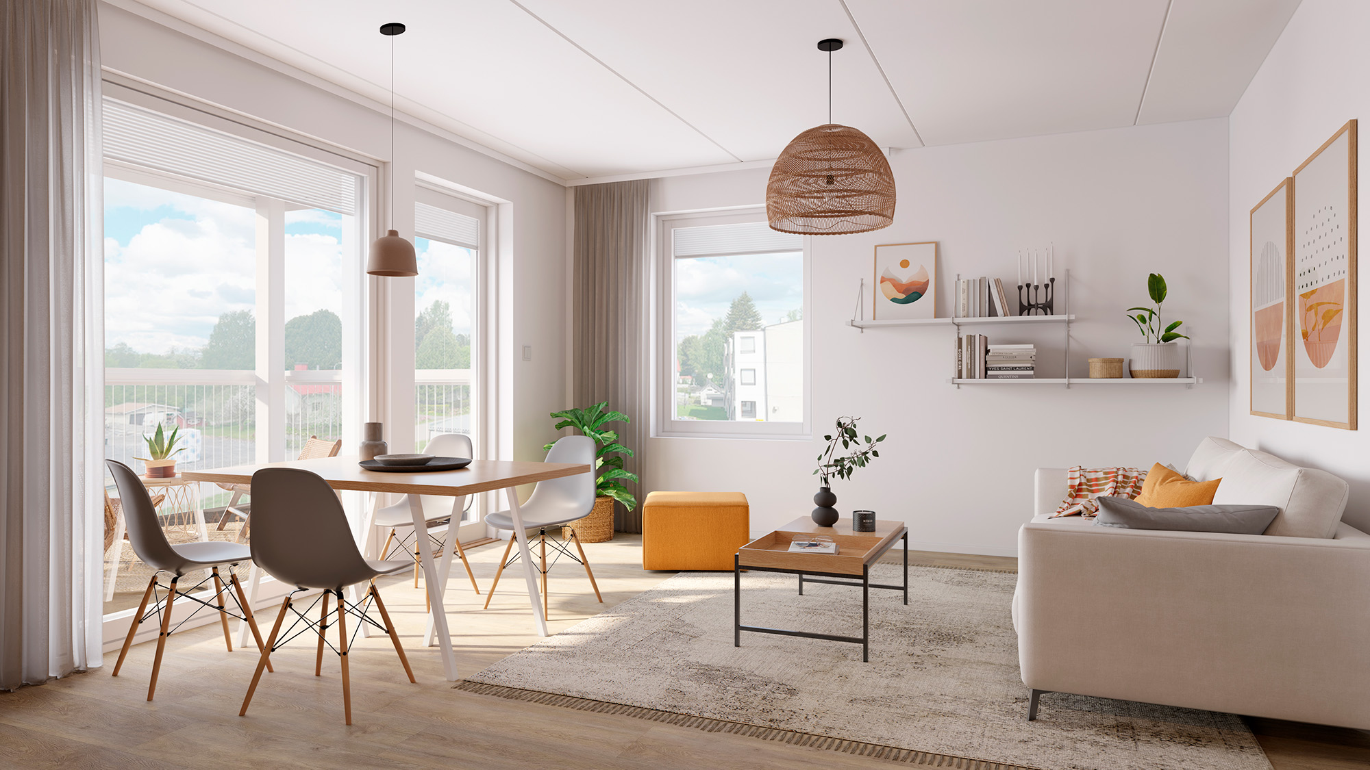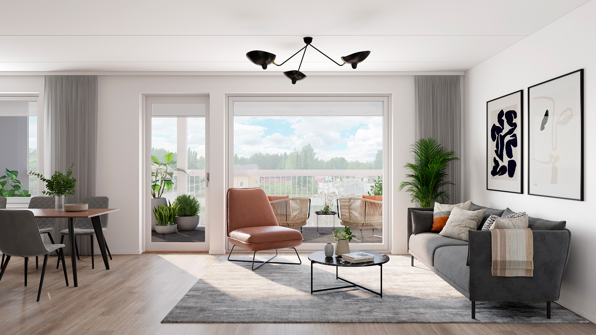 Asuntovalikoima yltää 32 m² yksiöistä ylimmän kerroksen saunalla, tilavalla vaatehuoneella ja koko asunnon levyisellä parvekkeella varustettuun 101,5 m² kolmioon. Jokaisessa asunnossa on lasitettu parveke, ja avaruuden tuntua lisää parvekkeelle avautuva lattiaan asti ulottuva olohuoneen ikkuna.