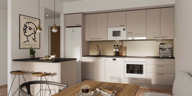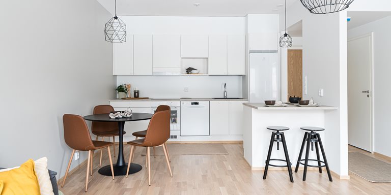 Huom. Asunnon valokuvat ovat samankokoisesta toisen kerroksen mallihuoneistosta B39, jossa on lähes vastaava pohjaratkaisu.