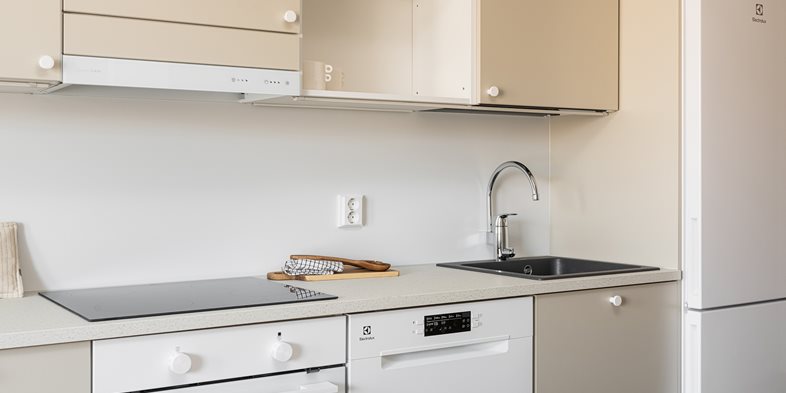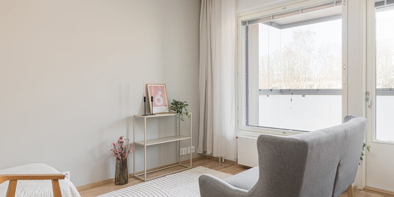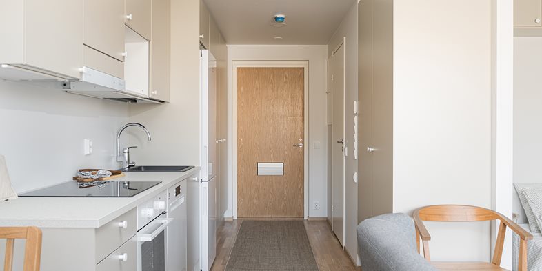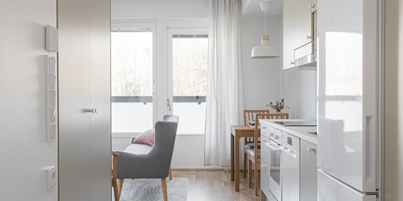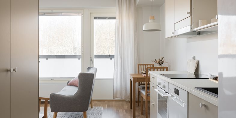 Tehokas ja toimiva yksiö, jossa on kaikki eväät sujuvaan arkipäivään. Pohjaratkaisusta löytyy luontevat paikat olennaisimmille kalusteille. Ilta-auringon suuntaan avautuva lasitettu parveke on yhtä leveä kuin koko asunto.
