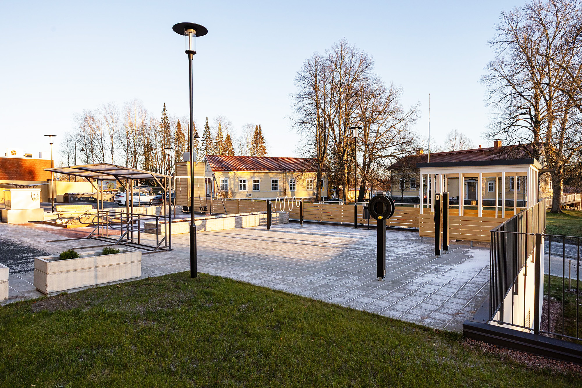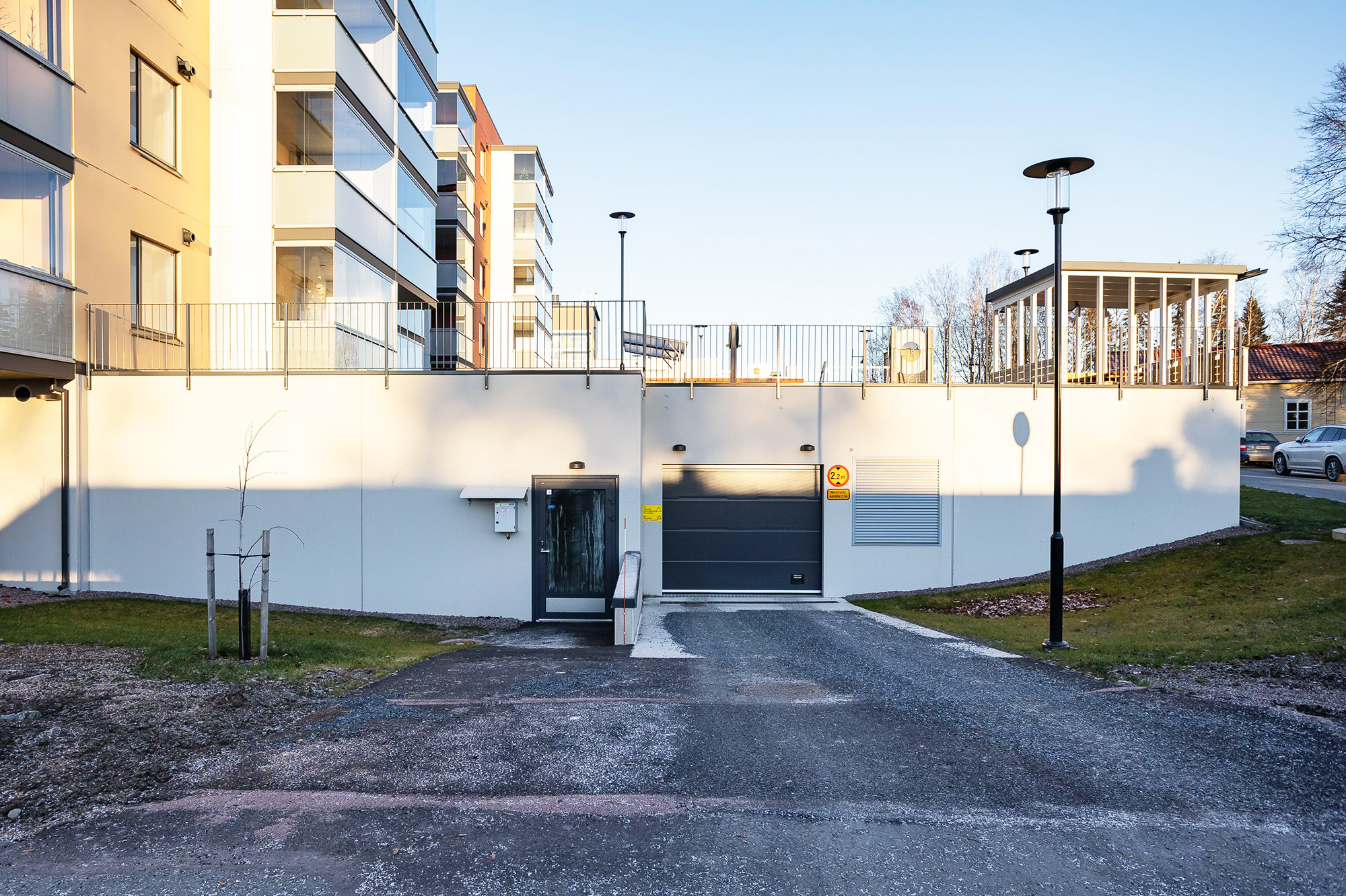 Autolle voi hankkia paikan pysäköintihallista tai etäkäytettävillä lämmityspisteillä varustetulta pihalta. Kaikissa yhtiön autopaikoissa on sähköauton hidaslataaminen mahdollista, energiakulun maksaa tällöin käyttäjä. Haluttaessa latauspisteen voi muuttaa myös paremmin lataukseen soveltuvaksi (type 2).