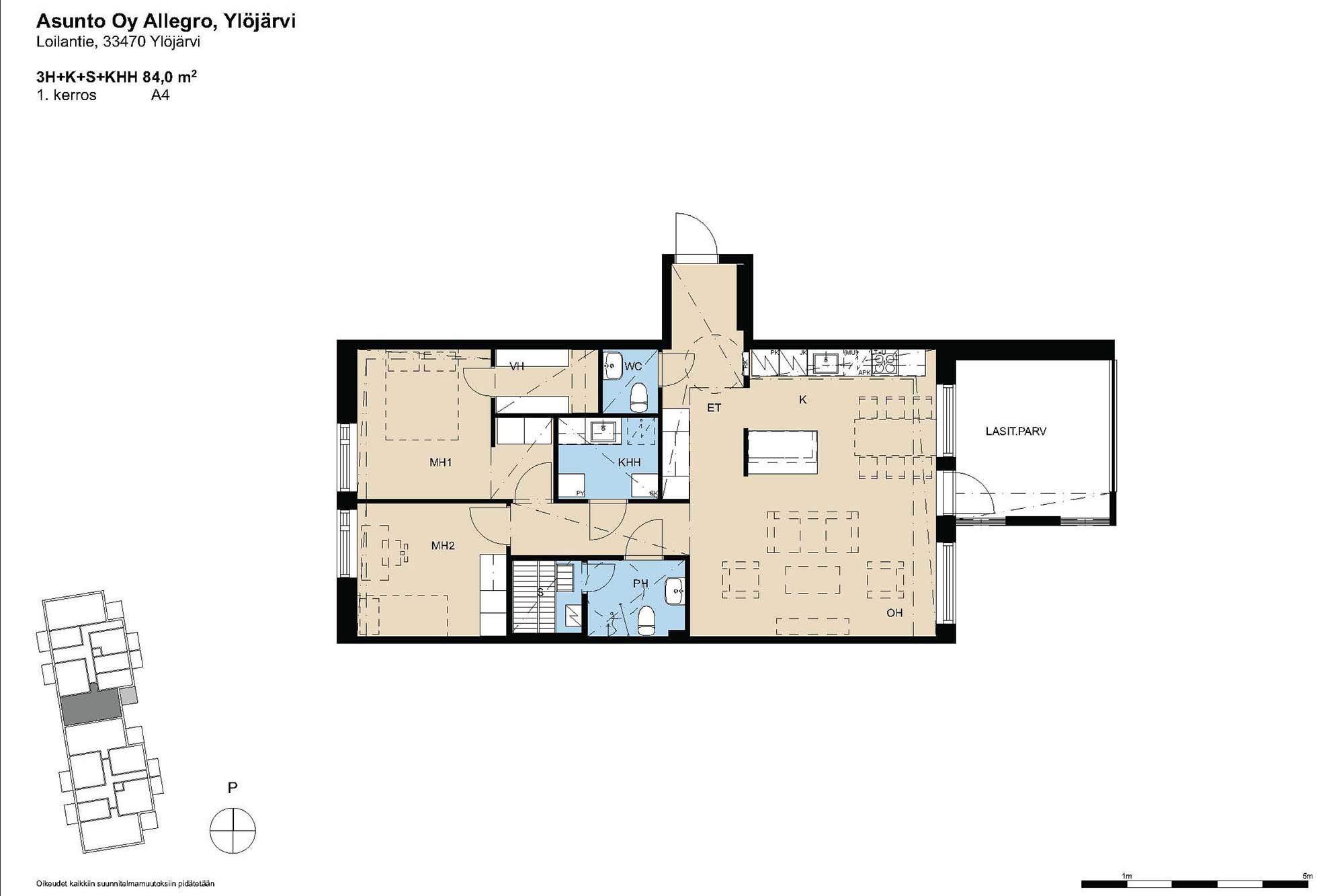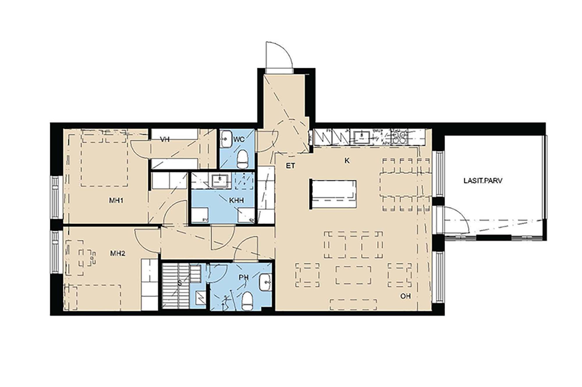 Erittäin toimivan pohjaratkaisun omaava läpitalon kolmio. Pyykkihuollon voi keskittää kodinhoitohuoneeseen. Kaksi wc:tä sujuvoittaa arkea. Tässä kookkaassa huoneistossa on runsaat säilytystilat. Huomaa keittiön kaksi kylmälaitetta sekä iso saareke. Pienellä muutoksella asuntoon saa myös erilliskeittiön. Lasitetulta parvekkeelta voi ihailla järvelle päin avautuvia maisemia.