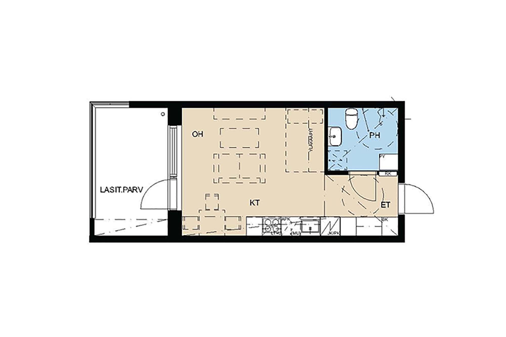 Tehokas ja toimiva yksiö, jossa on kaikki eväät sujuvaan arkipäivään. Pohjaratkaisusta löytyy luontevat paikat olennaisimmille kalusteille. Ilta-auringon suuntaan avautuva lasitettu parveke on yhtä leveä kuin koko asunto.