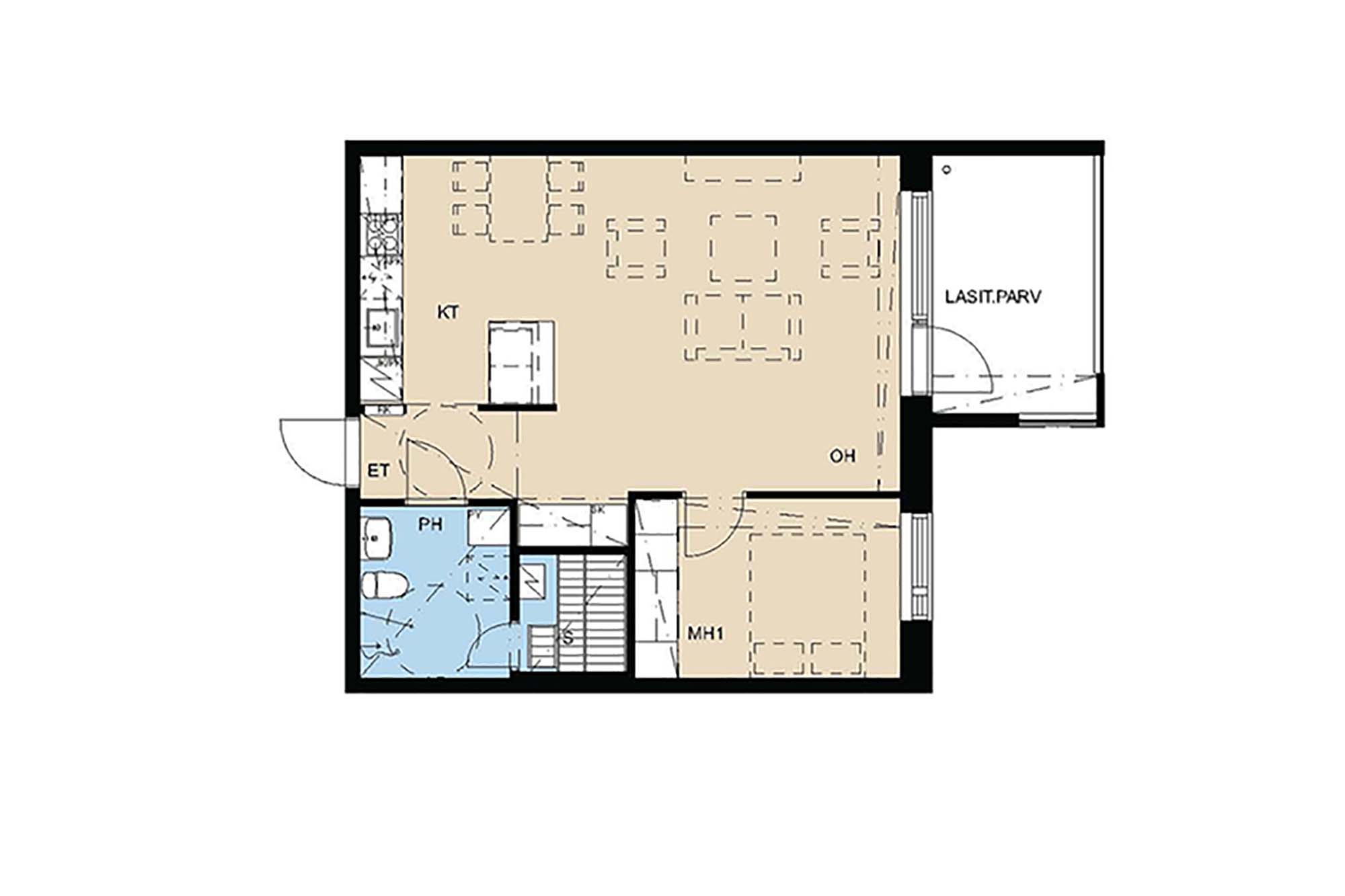 Muhkeankokoinen kaksio, jonka avaraan keittiön ja olohuoneen yhdistelmään on helppo sommitella sekä ruokailu- että sohvaryhmä. Keittiötilan käytännöllisyyttä lisää saareke. Makuuhuoneessa on mukavasti kaappitilaa. Oman saunan lauteilla on ihana huuhtoa arjen pölyt. Lasitettu parveke avautuu aamuauringon suuntaan.