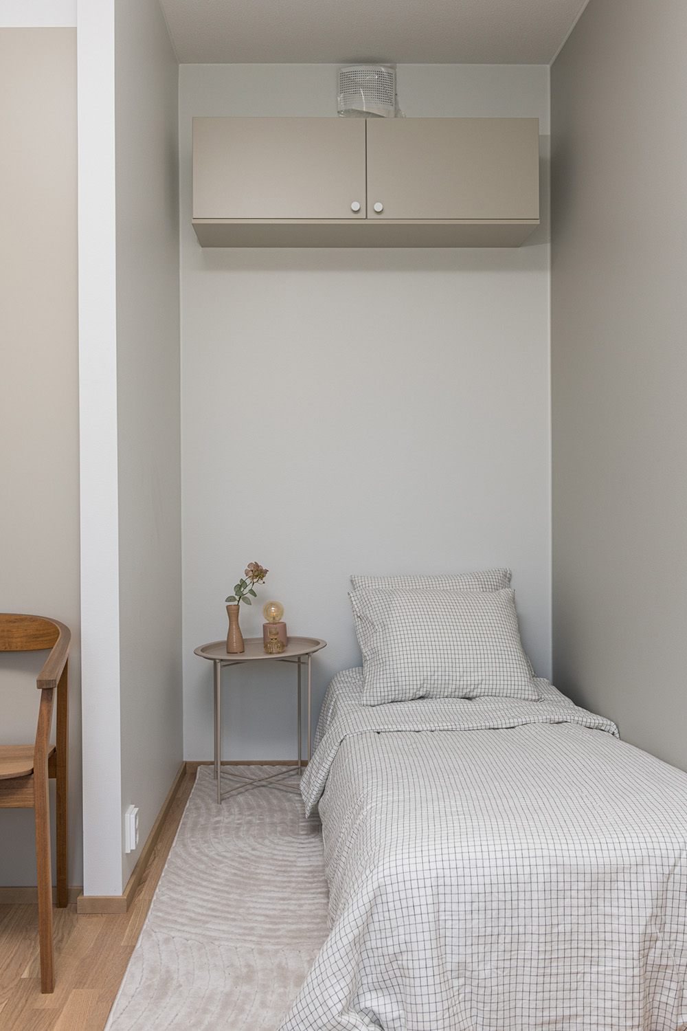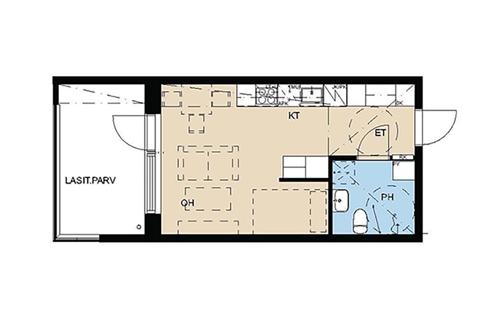 Tehokas ja toimiva yksiö, jossa on kaikki eväät sujuvaan arkipäivään. Pohjaratkaisusta löytyy luontevat paikat olennaisimmille kalusteille. Sängylle on suunniteltu suojaisa paikka. Ilta-auringon suuntaan avautuva lasitettu parveke on yhtä leveä kuin koko asunto.