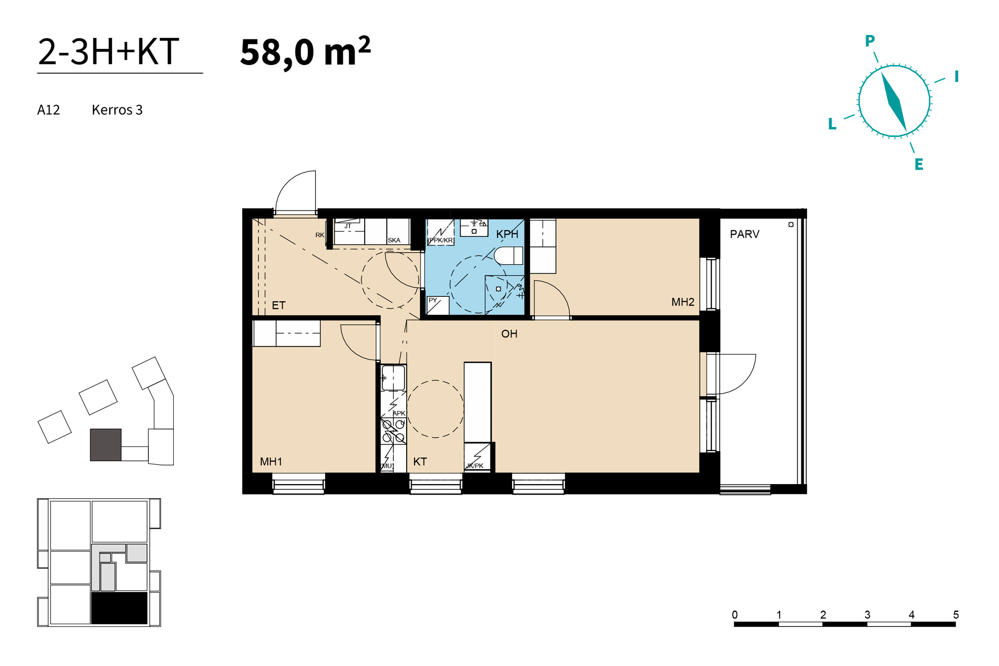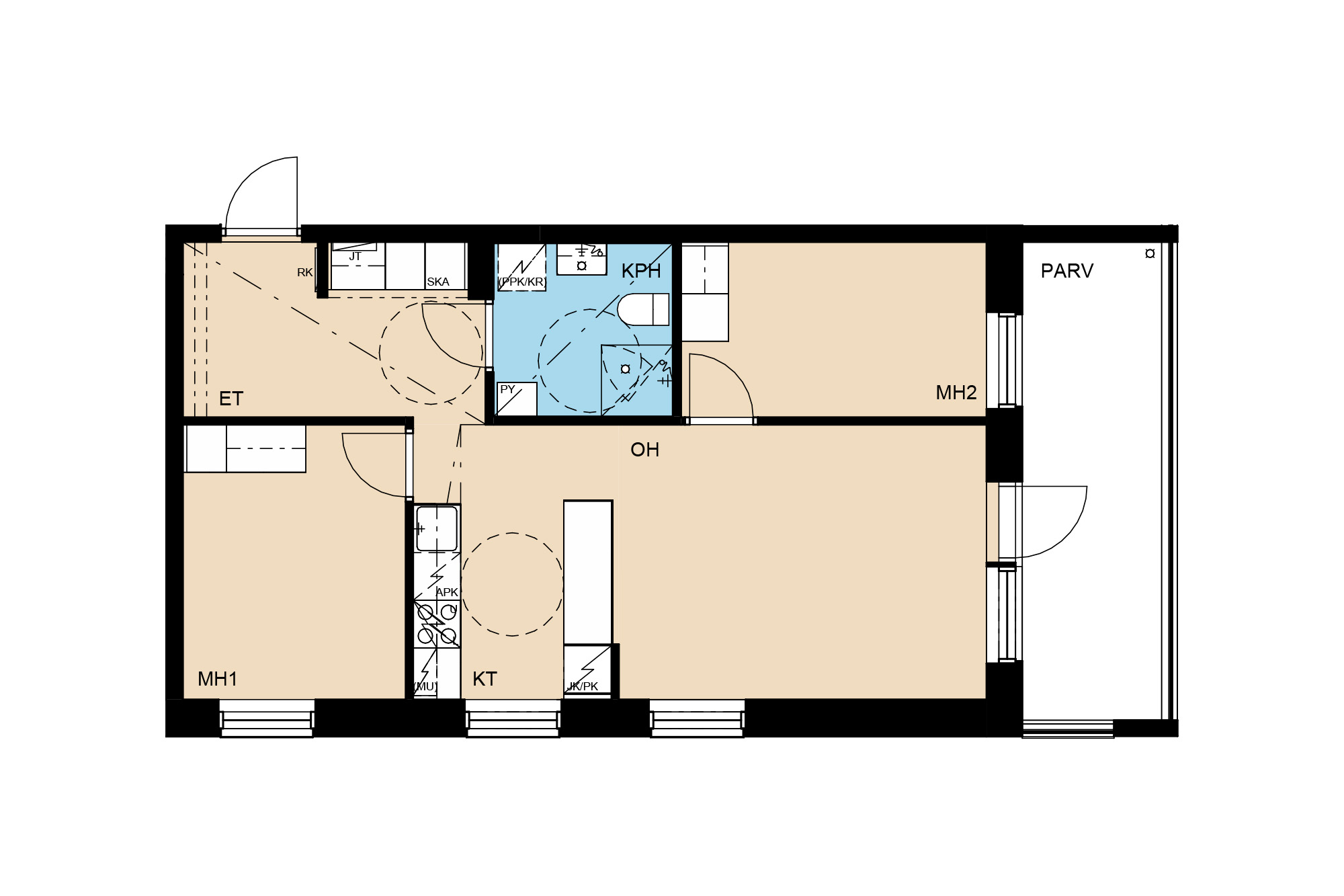 Suurenmoinen huoneisto, jonka tilat jatkuvat koko asunnon mittaiselle parvekkeelle. Jo eteisessä on reilusti tilaa. Pitkä niemeke rajaa keittiön omaksi kokonaisuudekseen. Isojen ja kahteen suuntaan avautuvien ikkunoiden vuoksi olohuone on erittäin valoisa. Kaksi makuuhuonetta, joista toinen soveltuu etätyöskentelyyn tai vaikka lastenhuoneeksi.