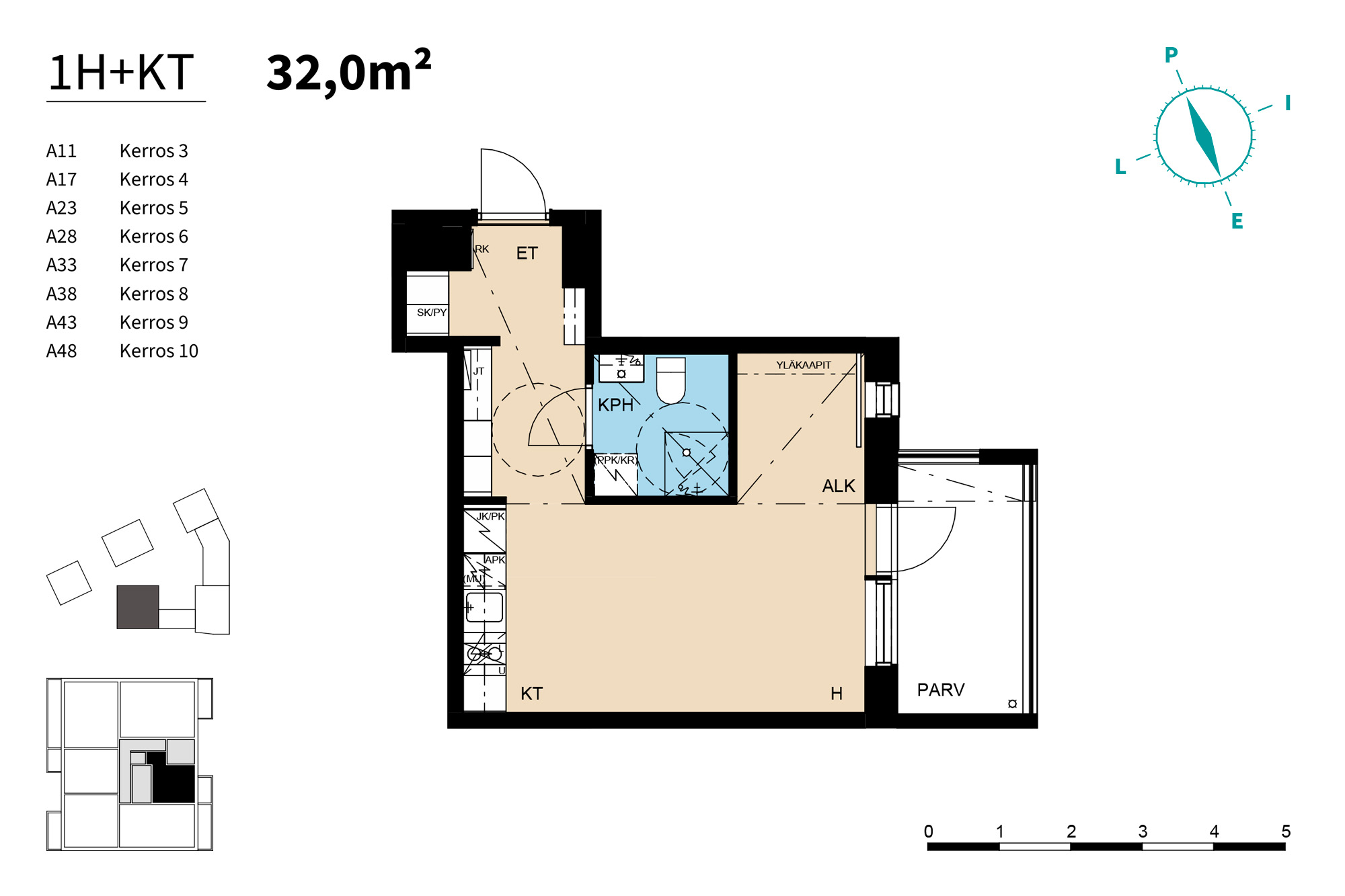 Todella toimiva yksiö, jossa sängylle jää luonteva paikka ikkunalliseen makuualkoviin. Säilytystilaa on asunnon koko huomioiden mukavasti, jopa makuualkovin takaseinään asennetaan yläkaapit. Aamuauringon suuntaan katsovalle parvekkeelle on ihana kattaa kesäiset aamukahvit.