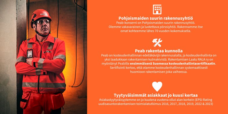 Peab-konserni on Pohjoismaiden suurin rakennusyhtiö. Rakennamme itse omat kohteemme yli 60 vuoden kokemuksella ja kerralla kuntoon. Olemme vakavarainen rakentaja ja alan edelläkävijä kosteudenhallinnassa, joka on meillä yksi laadukkaan rakentamisen kulmakivistä. Rakentamisen Laatu RALA ry on myöntänyt Peabille ensimmäisenä Suomessa kosteudenhallintasertifikaatin. Se kertoo, että huomioimme kosteudenhallinnan systemaattisesti rakennusprojektiemme kaikissa vaiheissa suunnittelusta lähtien.