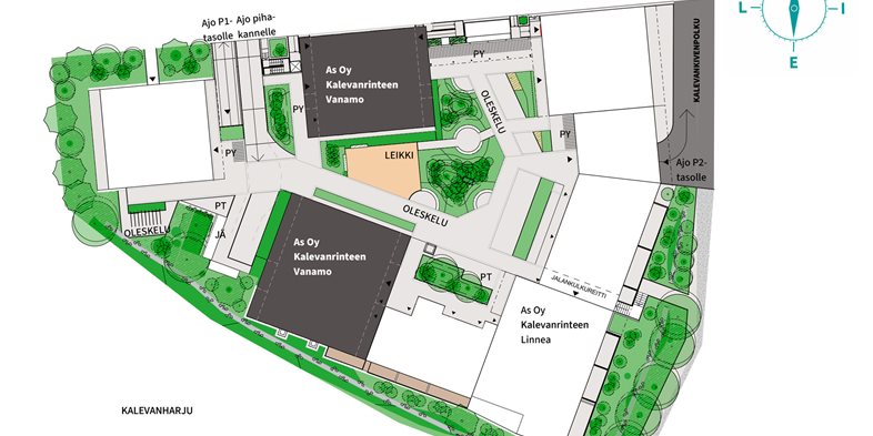 Taloyhtiö on osa Takojankadun ja Kalevanharjun puistikon väliin muodostuvaa uutta asuinkorttelia. Suojaisalla sisäpihalla on omat alueet oleskelulle ja lasten leikille. Piha-alueen kulkureitit ovat esteettömiä ja turvallisia, sillä autopaikat on sijoitettu pihakannen alle pysäköintihalliin, johon pääsee hissillä suoraan asuinkerroksista. Autopaikat myydään erillisinä osakkeina, ja niihin voi tilata sähköautojen latausaseman.