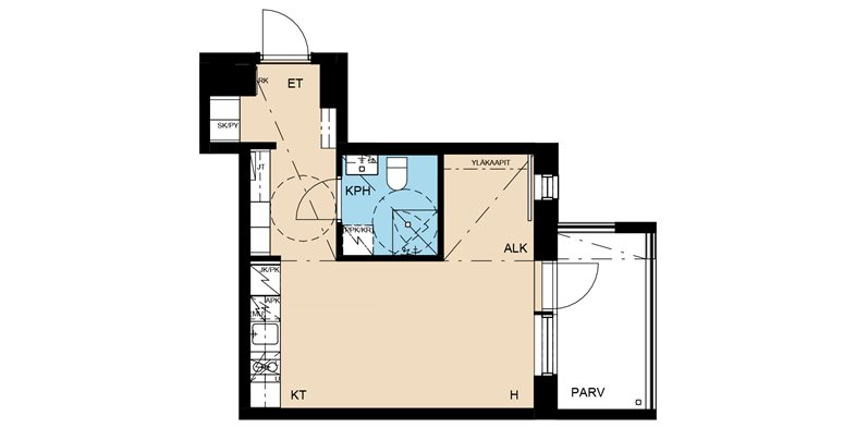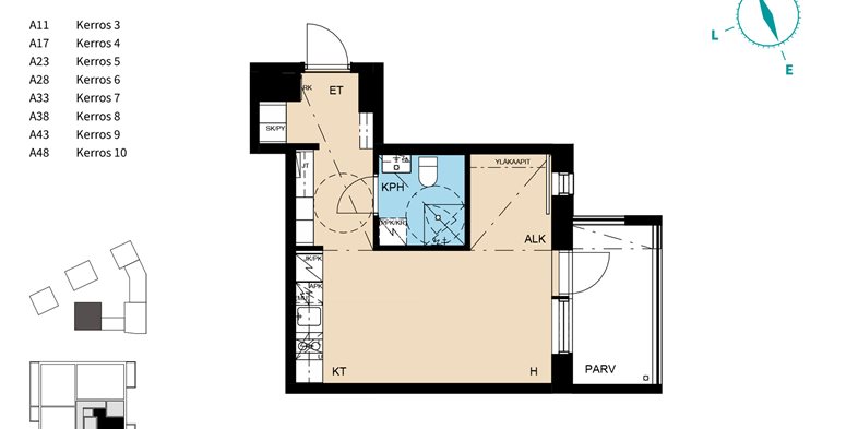 Todella toimiva yksiö, jossa sängylle jää luonteva paikka ikkunalliseen makuualkoviin. Säilytystilaa on asunnon koko huomioiden mukavasti, jopa makuualkovin takaseinään asennetaan yläkaapit. Aamuauringon suuntaan katsovalle parvekkeelle on ihana kattaa kesäiset aamukahvit.
