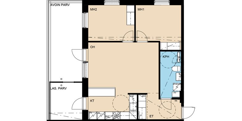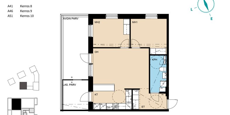 Korkealle rakennuksen kulmaan sijoittuva kahden tilavan makuuhuoneen huoneisto, jonka sydämenä toimii keittiön ja olohuoneen valoisa yhdistelmä. Pitkälle niemekkeelle voi kattaa näyttävät tarjottavat isommallekin ryhmälle. Lasitetun ja avoimen parvekkeen yhdistelmältä avautuu vaikuttavia maisemia.