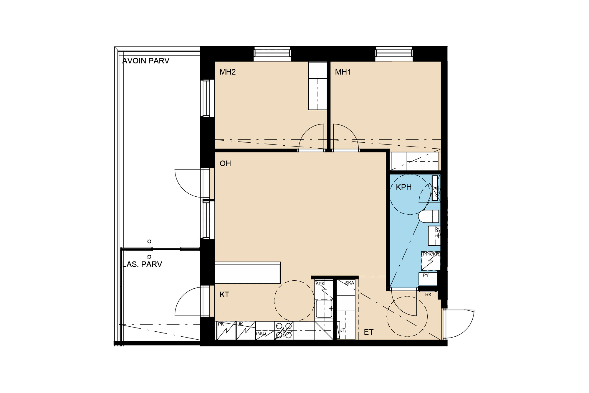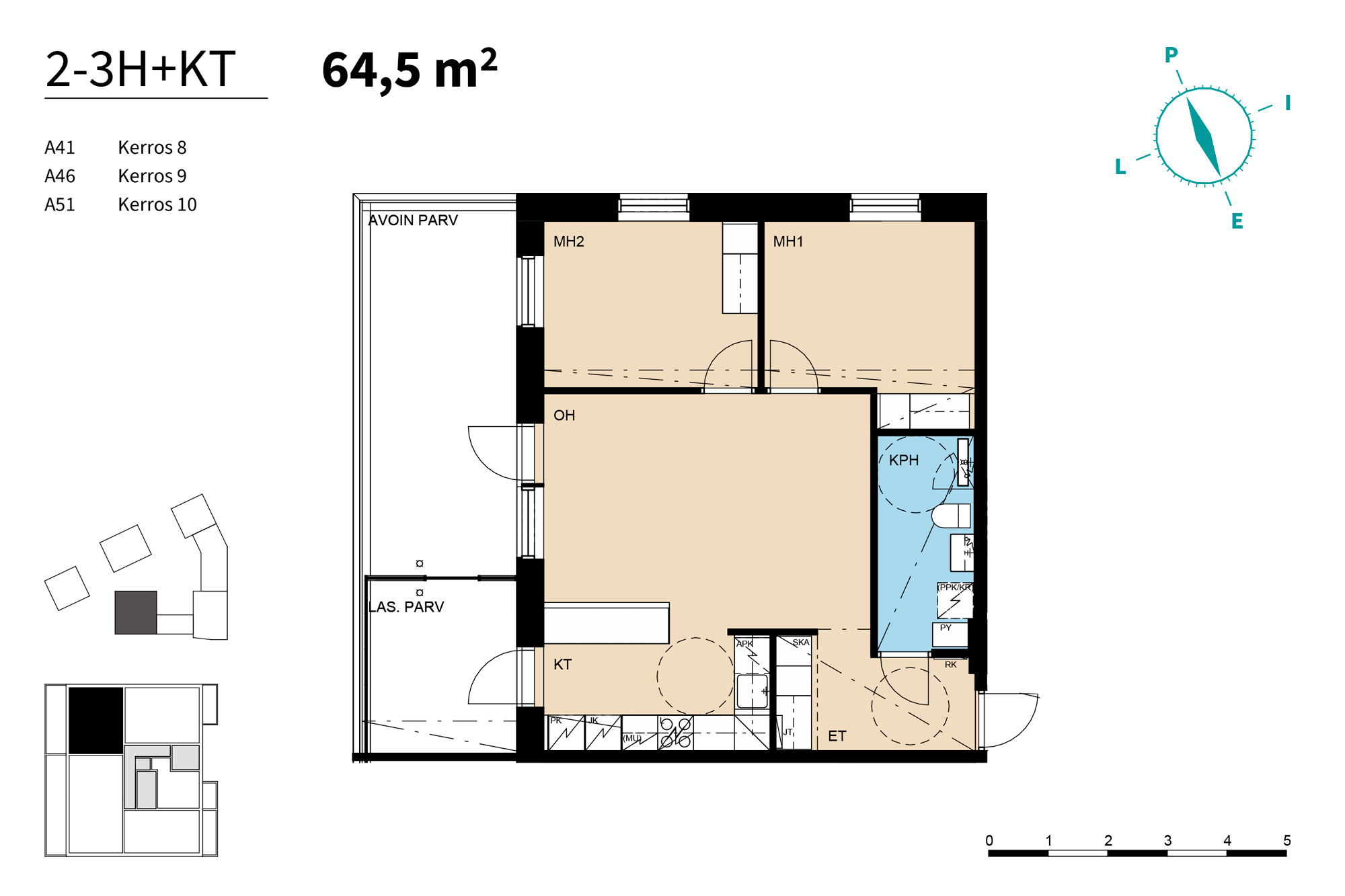 Korkealle rakennuksen kulmaan sijoittuva kahden tilavan makuuhuoneen huoneisto, jonka sydämenä toimii keittiön ja olohuoneen valoisa yhdistelmä. Pitkälle niemekkeelle voi kattaa näyttävät tarjottavat isommallekin ryhmälle. Lasitetun ja avoimen parvekkeen yhdistelmältä avautuu vaikuttavia maisemia.