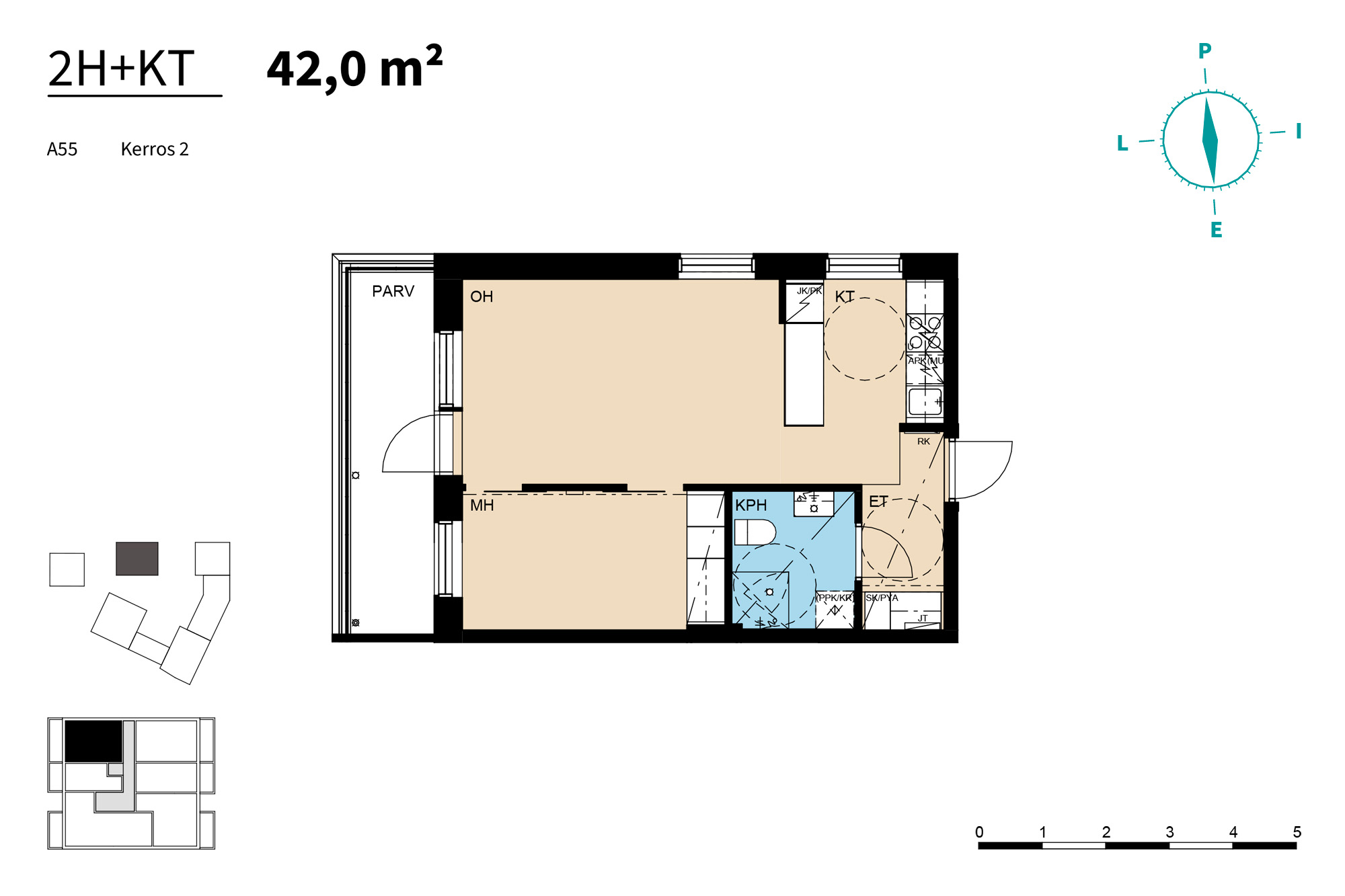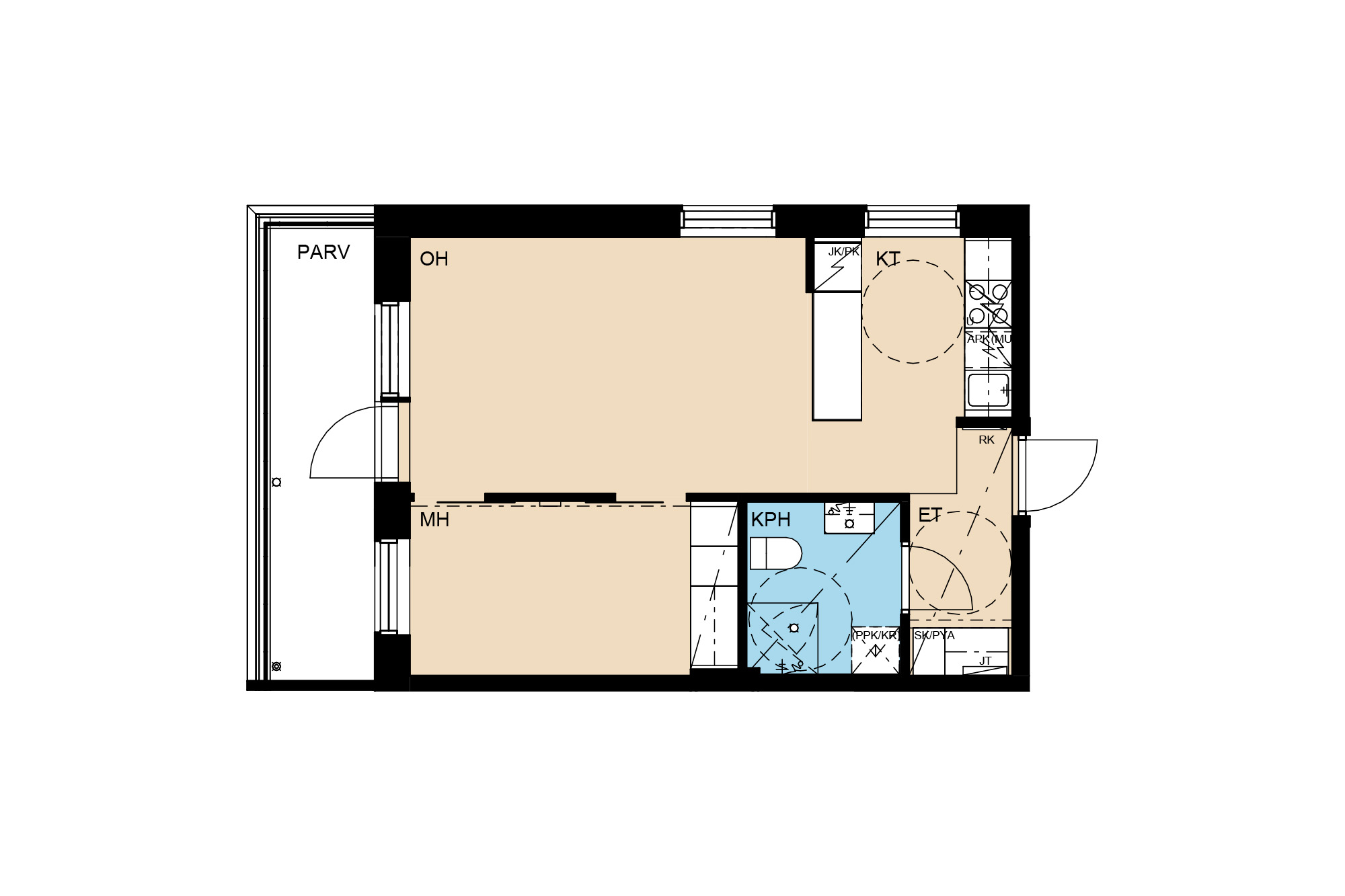 Lähes kaikki, mitä modernilta kaksiolta voi odottaa! Reilu eteistila ja nykyaikainen ikkunallinen keittiö, jonka pitkä tarjoiluniemeke rajaa omaksi kokonaisuudekseen. Myös ruokailuryhmän paikalle osuu ikkuna. Makuuhuoneeseen johtaa kaksi oviaukkoa, mikä vähentää turhia askelia arjessa. Länsiparvekkeelta on kiva ihailla hiljalleen hämärtyviä iltoja.