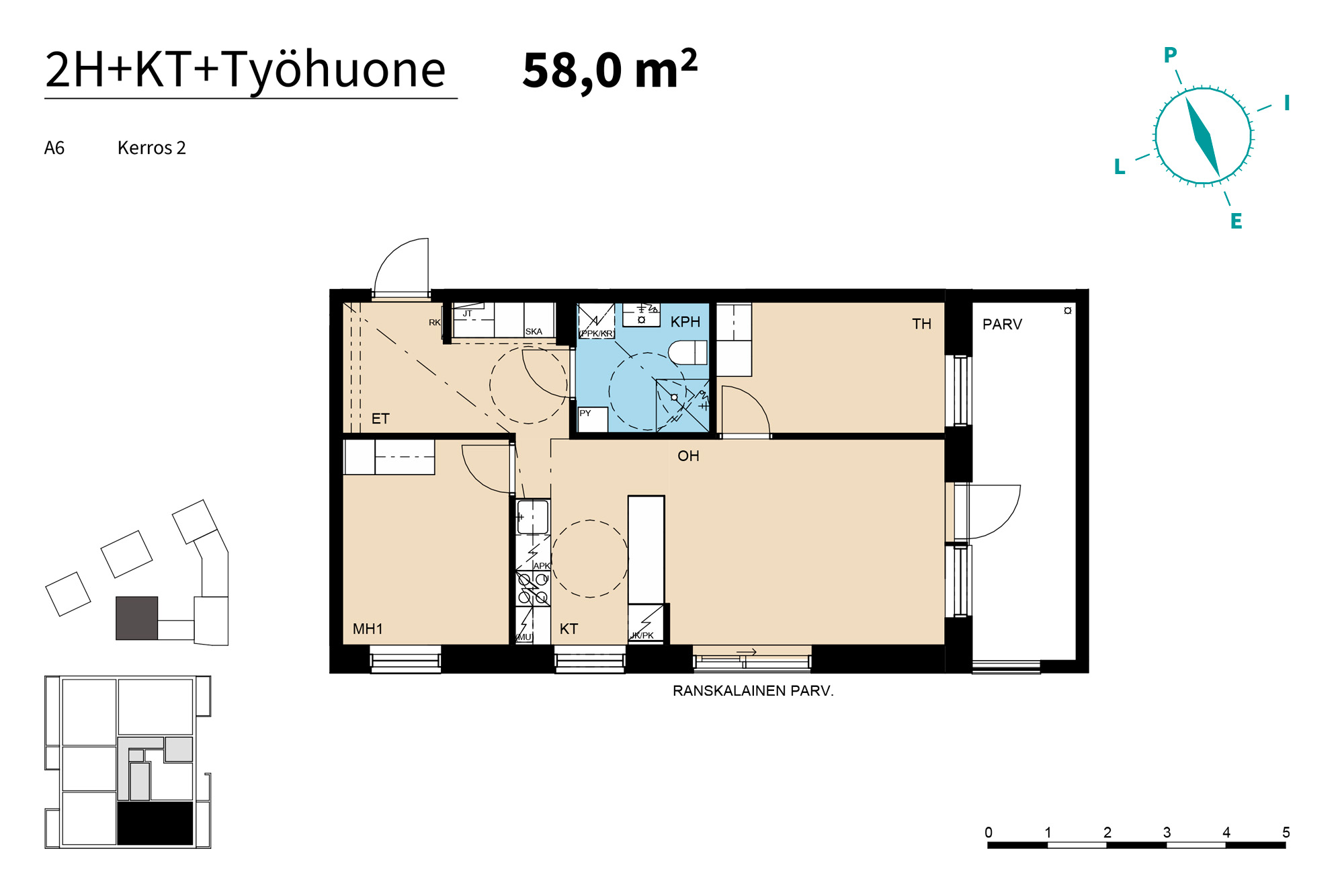 Suurenmoinen huoneisto, jonka tilat jatkuvat koko asunnon mittaiselle parvekkeelle. Jo eteisessä on reilusti tilaa. Pitkä niemeke rajaa keittiön omaksi kokonaisuudekseen. Isojen ikkunoiden ja ranskalaisen parvekkeen ansiosta olohuone on erittäin valoisa. Työhuone on omiaan etätyöskentelyä varten.