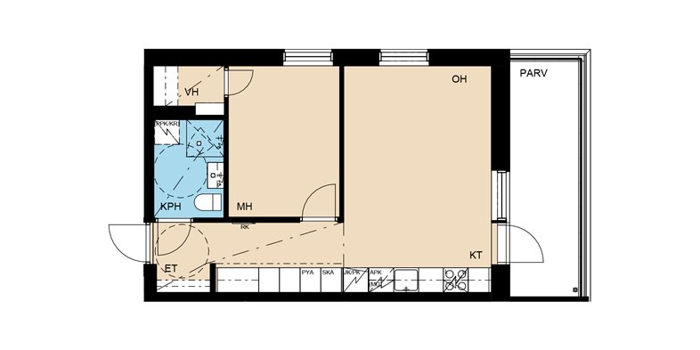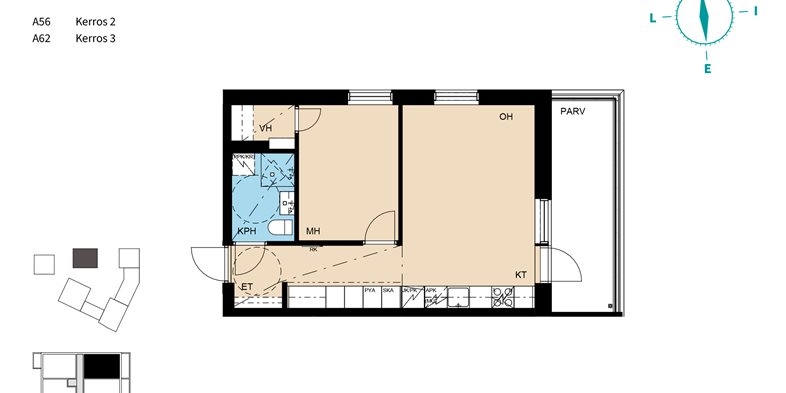 Rakennuksen kulmalta löytyvä kaksio, jonka parhaisiin puoliin lukeutuvat reilut säilytystilat. Vaatehuoneeseen mahtuu mukavasti asusteita ja kenkiä. Makuuhuoneeseen voi sijoittaa sängyn lisäksi työpöydän. Reilunkokoinen parveke avautuu aamuauringon suuntaan.