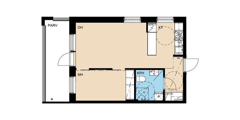 Lähes kaikki, mitä modernilta kaksiolta voi odottaa! Reilu eteistila ja nykyaikainen ikkunallinen keittiö, jonka pitkä tarjoiluniemeke rajaa omaksi kokonaisuudekseen. Myös ruokailuryhmän paikalle osuu ikkuna. Makuuhuoneeseen johtaa kaksi oviaukkoa, mikä vähentää turhia askelia arjessa. Länsiparvekkeelta on kiva ihailla hiljalleen hämärtyviä iltoja.