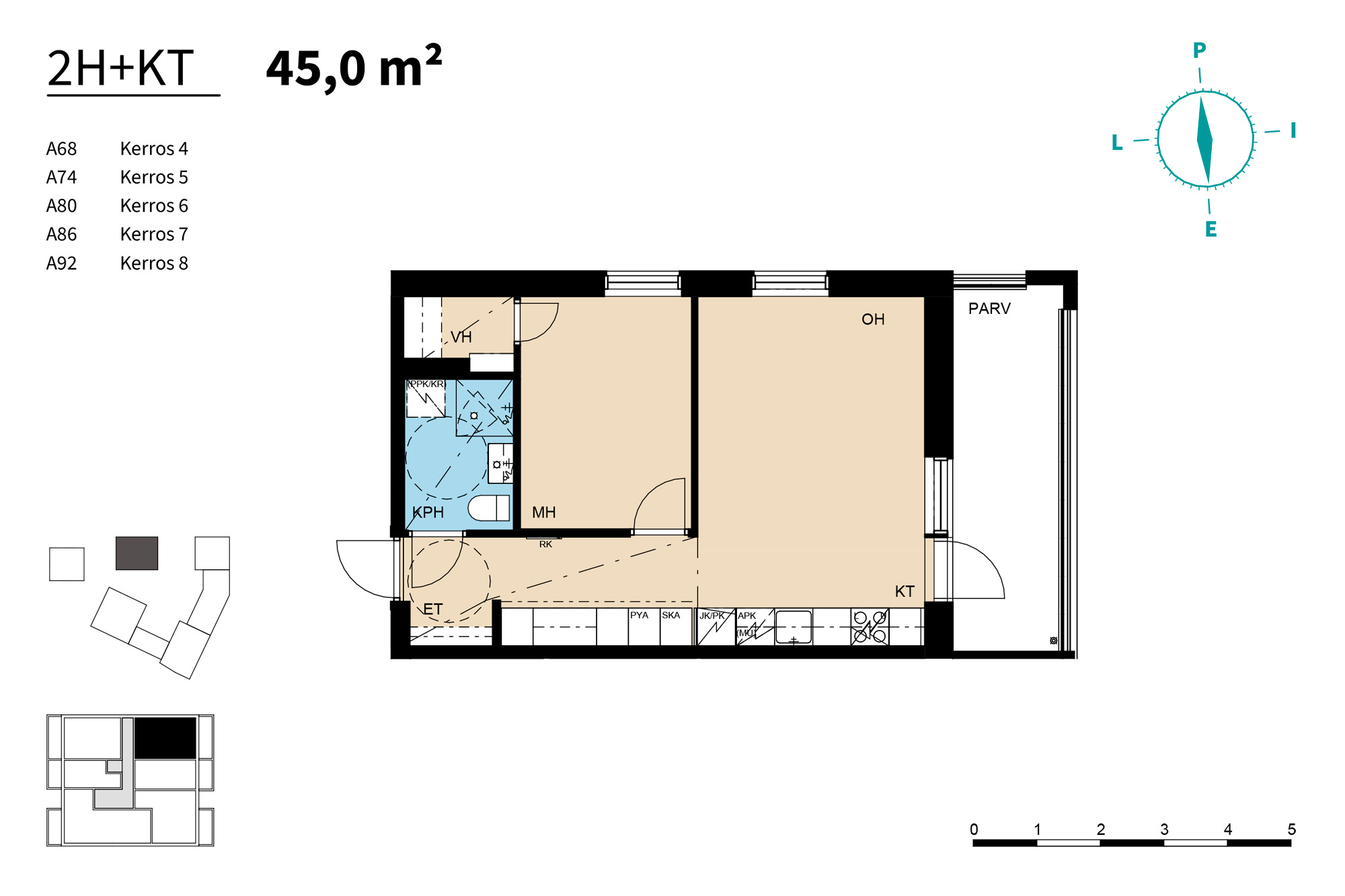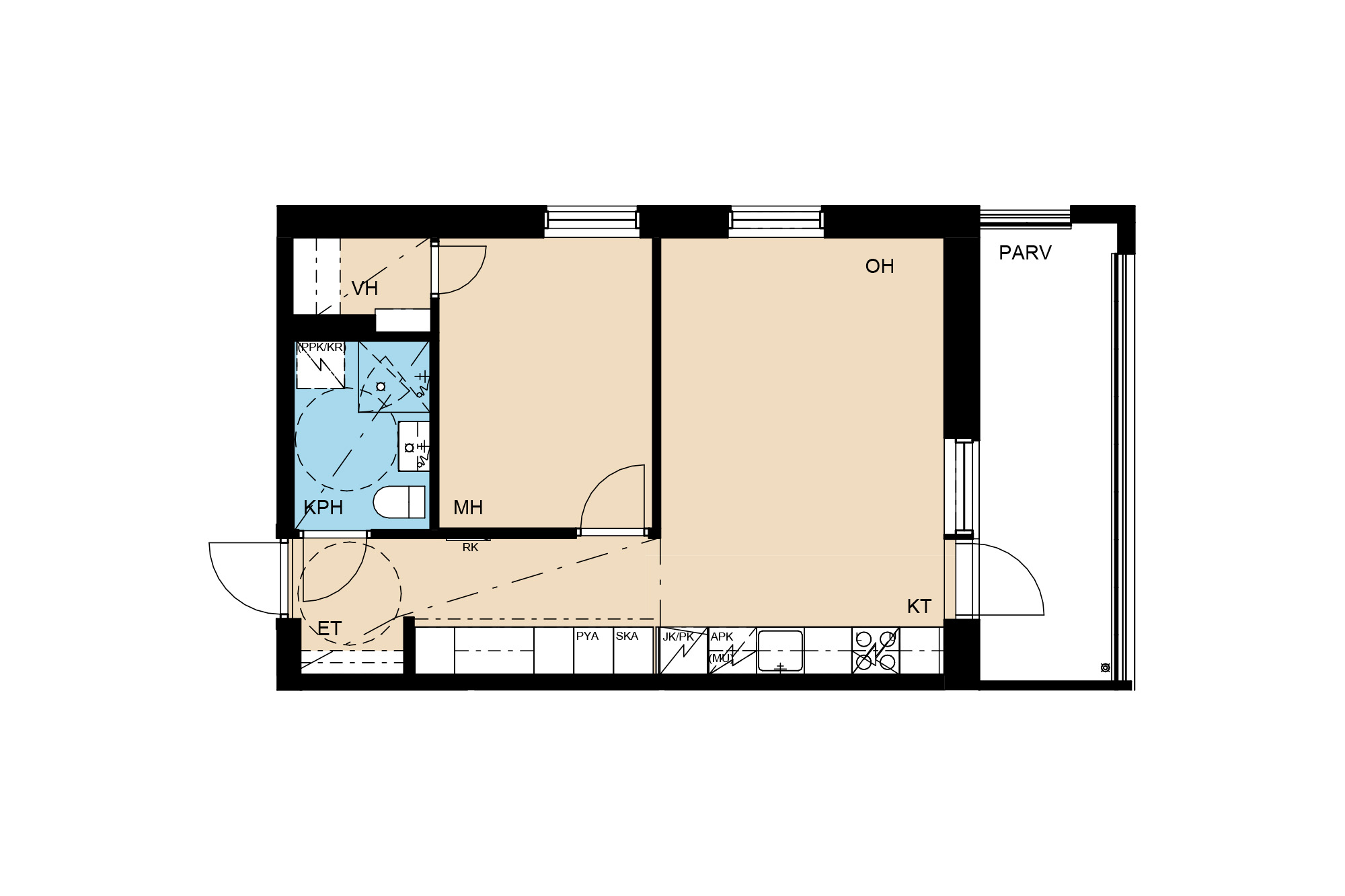 Rakennuksen kulmalta löytyvä kaksio, jonka parhaisiin puoliin lukeutuvat reilut säilytystilat. Vaatehuoneeseen mahtuu mukavasti asusteita ja kenkiä. Makuuhuoneeseen voi sijoittaa sängyn lisäksi työpöydän. Reilunkokoinen parveke avautuu aamuauringon suuntaan.