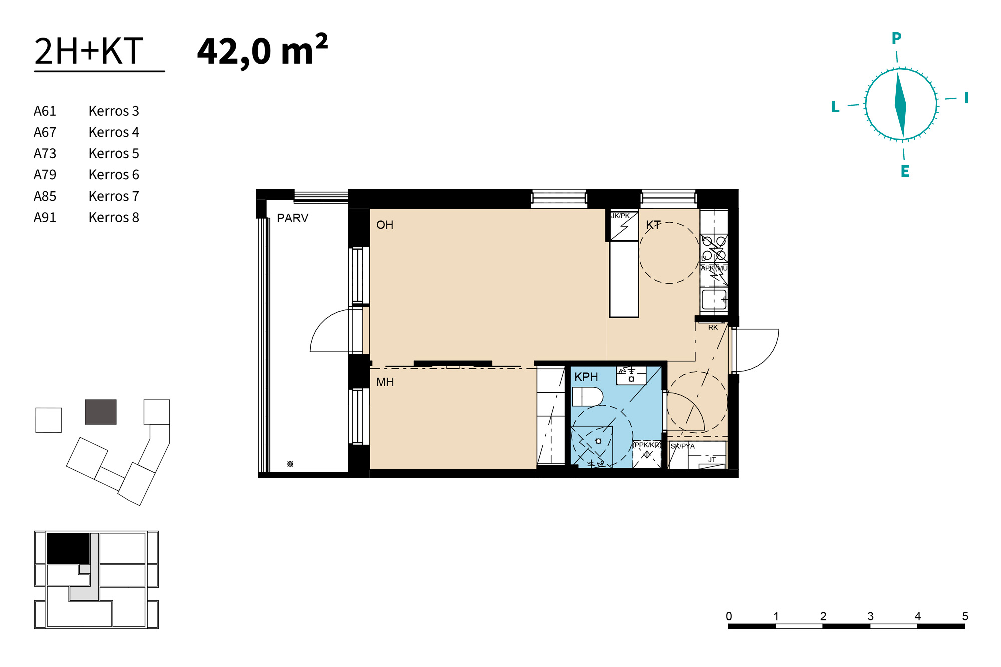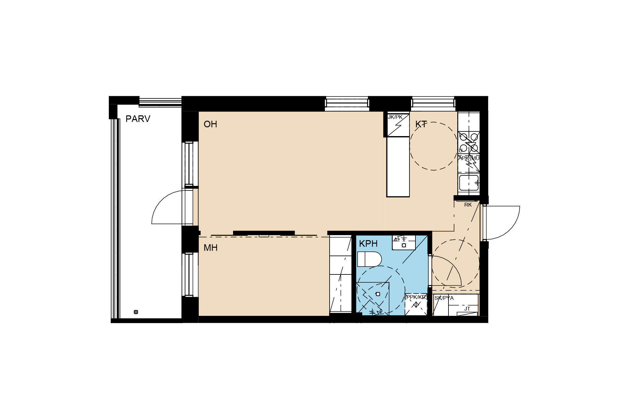 Lähes kaikki, mitä modernilta kaksiolta voi odottaa! Reilu eteistila ja nykyaikainen ikkunallinen keittiö, jonka pitkä tarjoiluniemeke rajaa omaksi kokonaisuudekseen. Myös ruokailuryhmän paikalle osuu ikkuna. Makuuhuoneeseen johtaa kaksi oviaukkoa, mikä vähentää turhia askelia arjessa. Länsiparvekkeelta on kiva ihailla hiljalleen hämärtyviä iltoja.