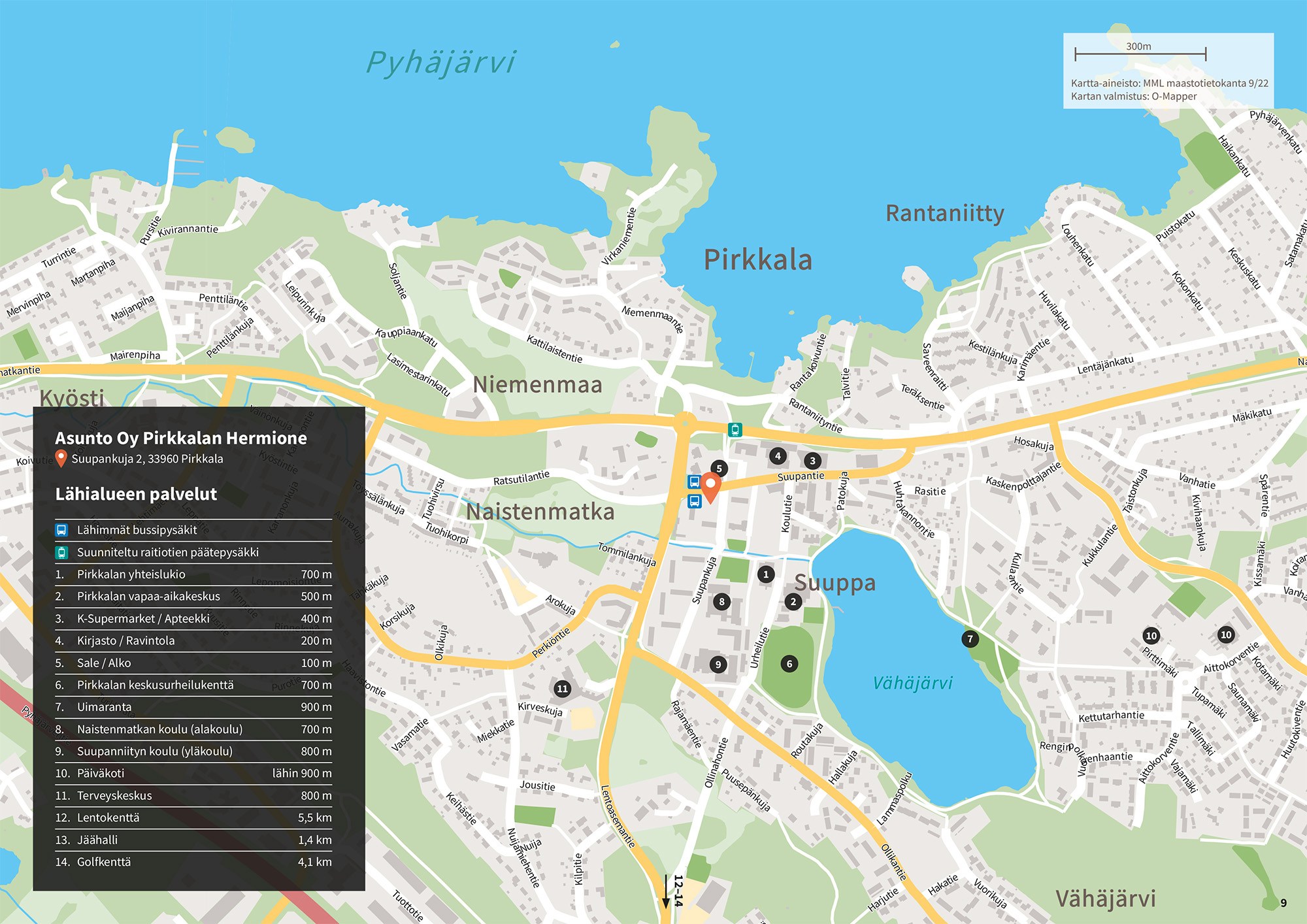 Hermionessa kaikki löytyy läheltä! Talo sijaitsee kirjaimellisesti keskellä Pirkkalan keskustan palveluja, mutta toisaalta lähellä on runsaasti luontoa ja erilaisia liikuntamahdollisuuksia.
