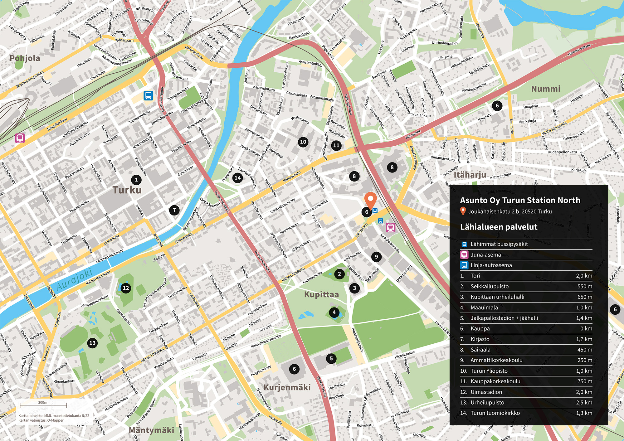 Station North sijaitsee kahden kilometrin päässä Kauppatorista ja Turun ydinkeskustan monipuolisesta palvelu- ja kulttuuritarjonnasta. Tuomiokirkolle ja Aurajoen rantaan on noin kilometri ja Kupittaan monipuolinen liikuntatarjonta kenttineen, puistoineen, halleineen ja ulkoliikuntapaikkoineen on ihan vieressä.