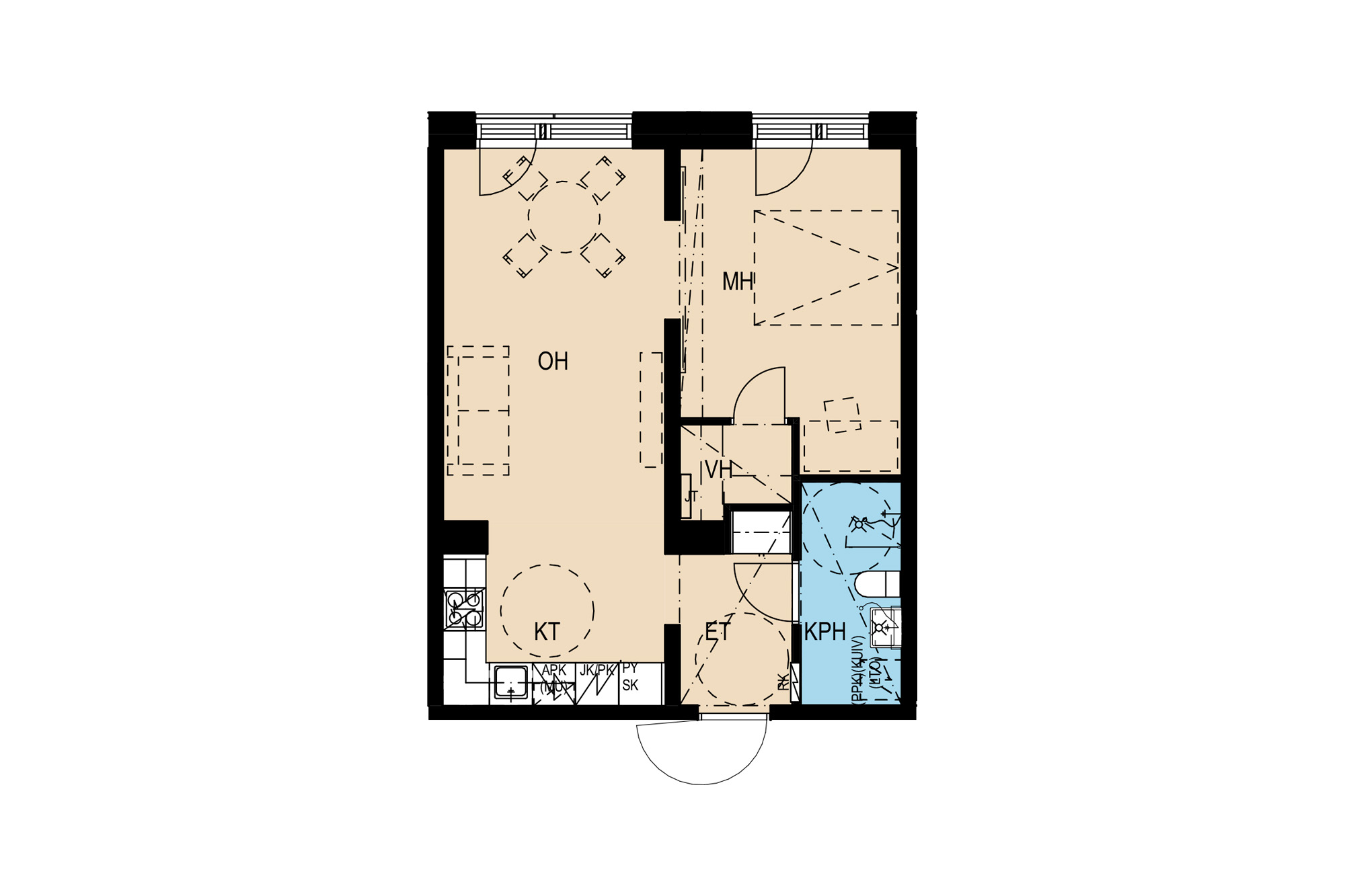 Tiloiltaan toimiva kaksio! Asunnon erikoisuutena ovat ranskalaiset parvekkeet sekä olohuoneessa että makuuhuoneessa. Makuuhuoneen yhteydessä on erillinen vaatehuone, ja makuuhuoneesta löytyy myös näppärä paikka työpöydälle. Fiksusti suunnitellussa keittiökulmauksessa on kaikki, mitä modernia kaupunkiasuntoa etsivä kaipaa.