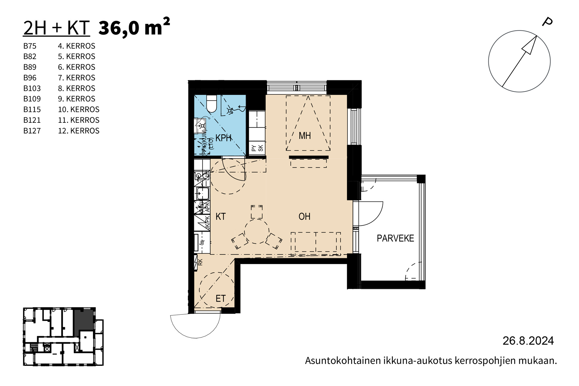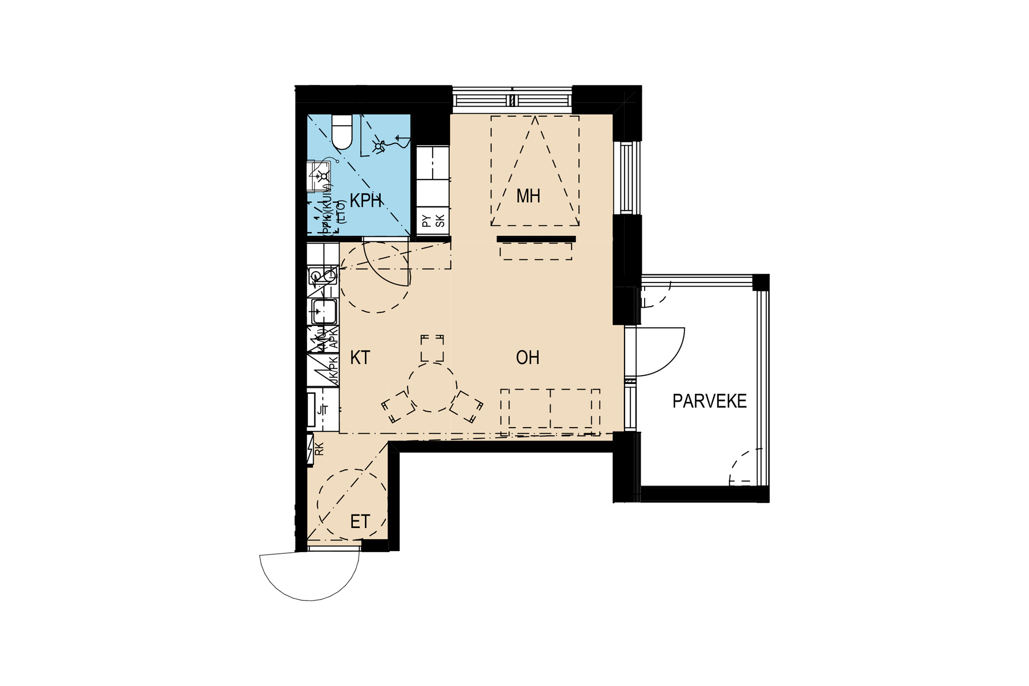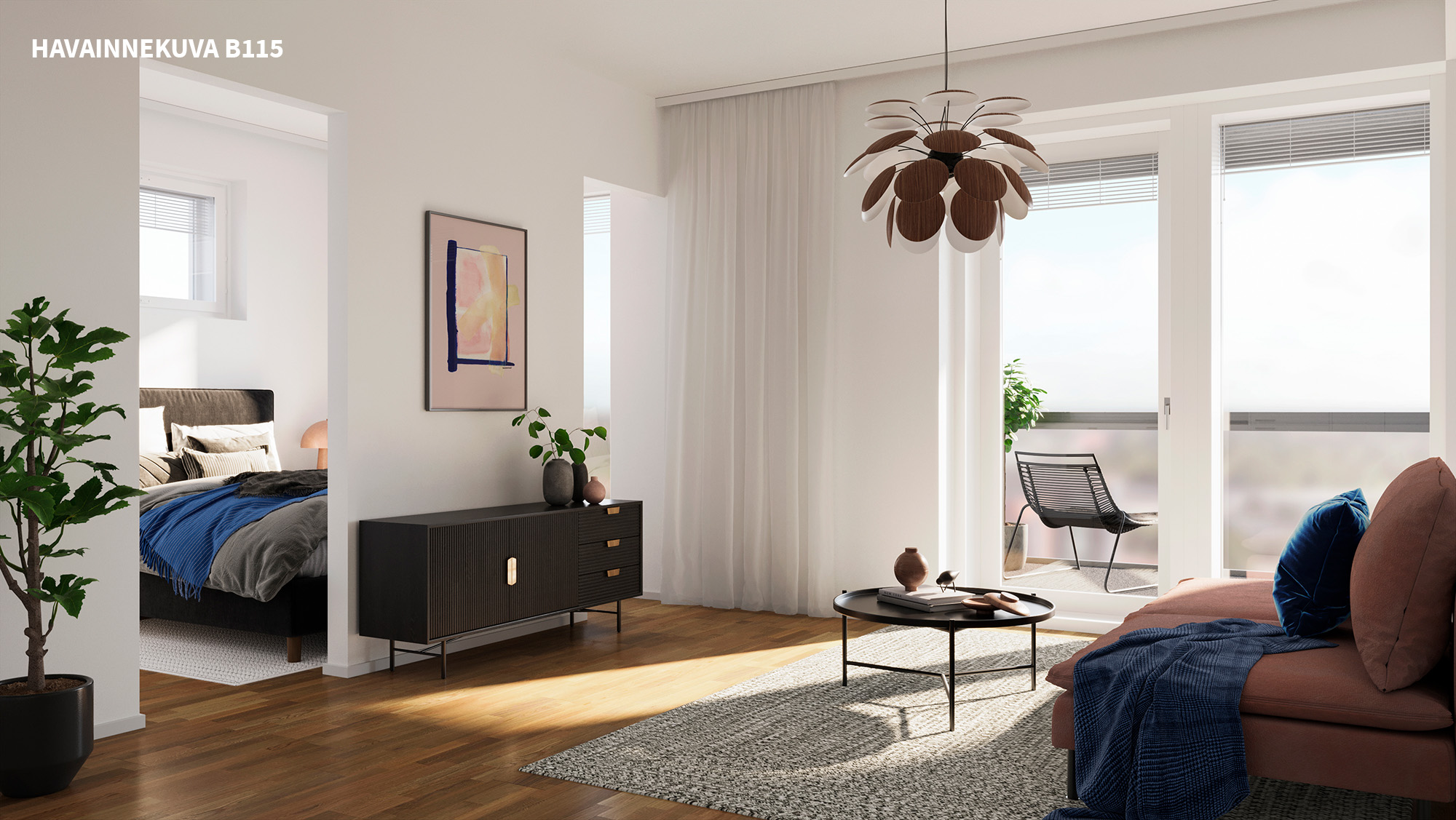 Mukavan tilavalla parvekkeella varustettu asunto on helppo sisustaa kodikkaasti oman makunsa mukaan. Modernissa keittiötilassa on kaikki, mitä citykaksion kotikokki kaipaa. Ikkunat antavat erilliseen makuuhuoneeseen ihanasti päivänvaloa kahdesta suunnasta.