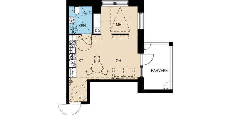 Mukavan tilavalla parvekkeella varustettu asunto on helppo sisustaa kodikkaasti oman makunsa mukaan. Modernissa keittiötilassa on kaikki, mitä citykaksion kotikokki kaipaa. Ikkunat antavat erilliseen makuuhuoneeseen ihanasti päivänvaloa kahdesta suunnasta.