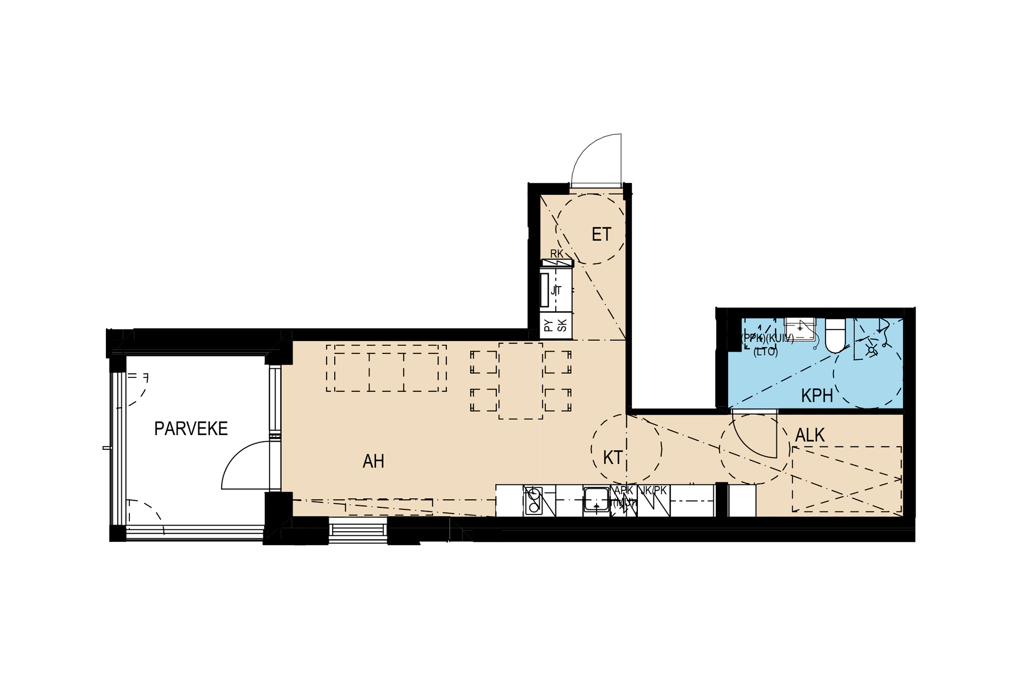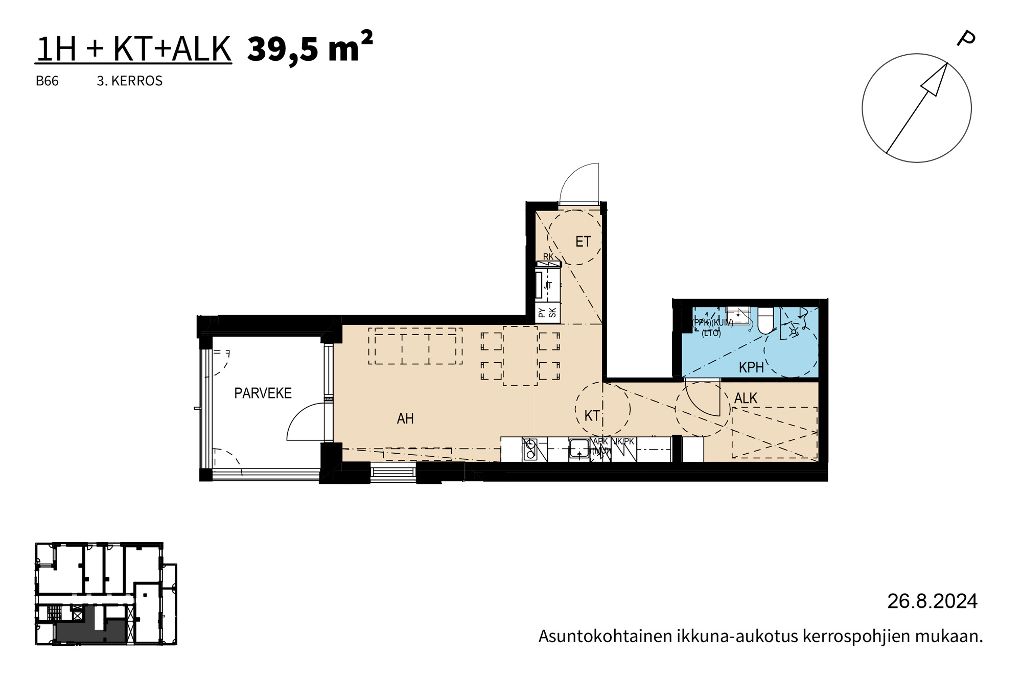 Yksiö vai kaksio? Samapa tuo, kun tilaa on joka tapauksessa lähes 40 neliötä ja asunnon toiseen päähän sijoittuva erillinen makuualkovi tarjoaa täydellisen rauhan. Myös tässä kolmannen kerroksen yksiössä on lasitettu parveke, joka antaa mukavaa lisätilaa keväästä syksyyn. Ja asunnon mukavuuksiin kuuluu tietenkin parkettilattia vesikiertoisella lattialämmityksellä.