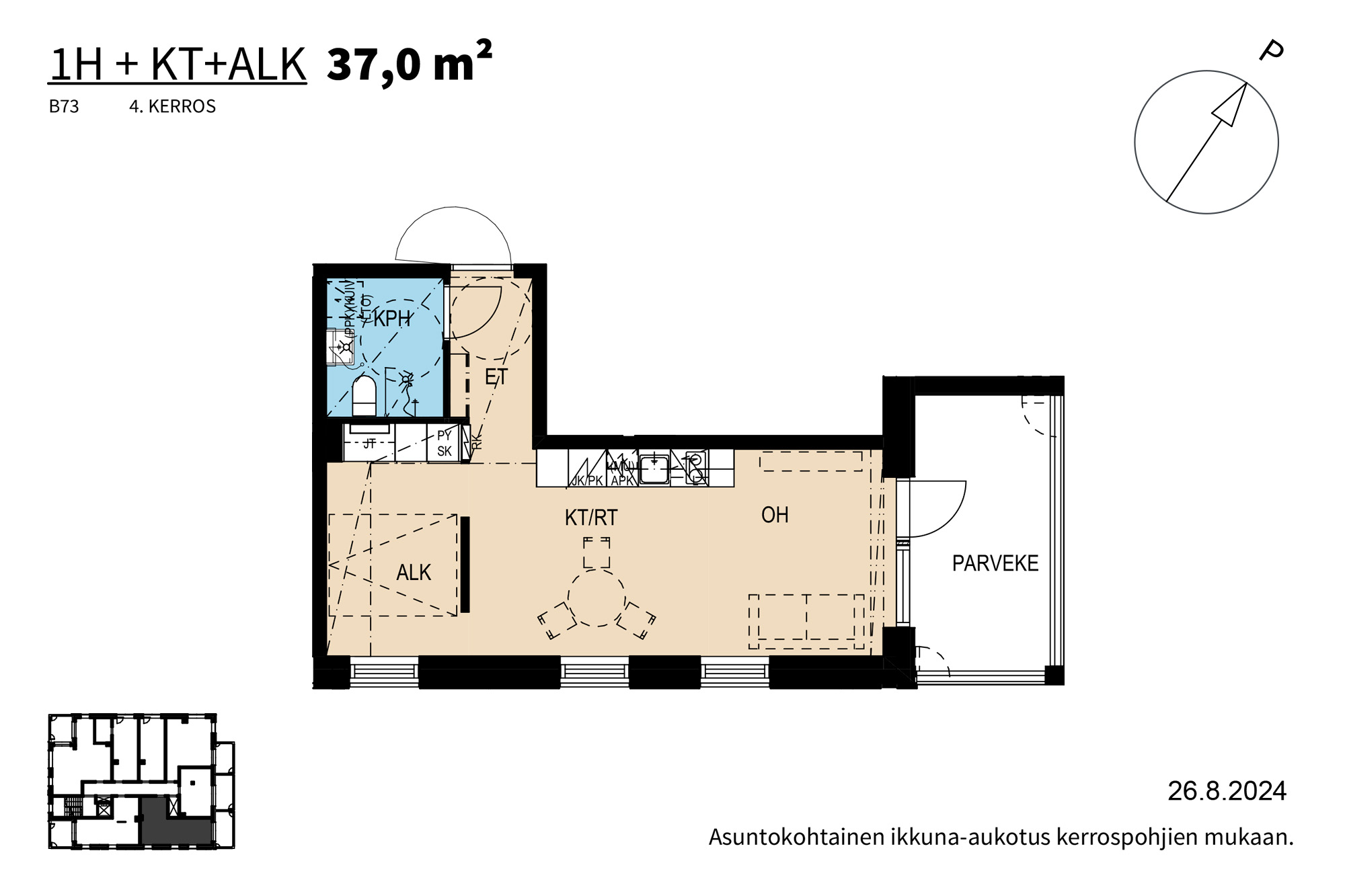 Etsitkö persoonallista uudiskotia upealla sijainnilla ja laadukkailla pintamateriaaleilla? Tässä olisi sellainen, ja neliöt riittävät mukavasti sinkulle tai pariskunnalle. Ikkunalliseen makuualkoviin mahtuu mukavasti vaikka parisänky, ja lasitettu parveke toimii oivallisesti olohuoneen jatkeena.
