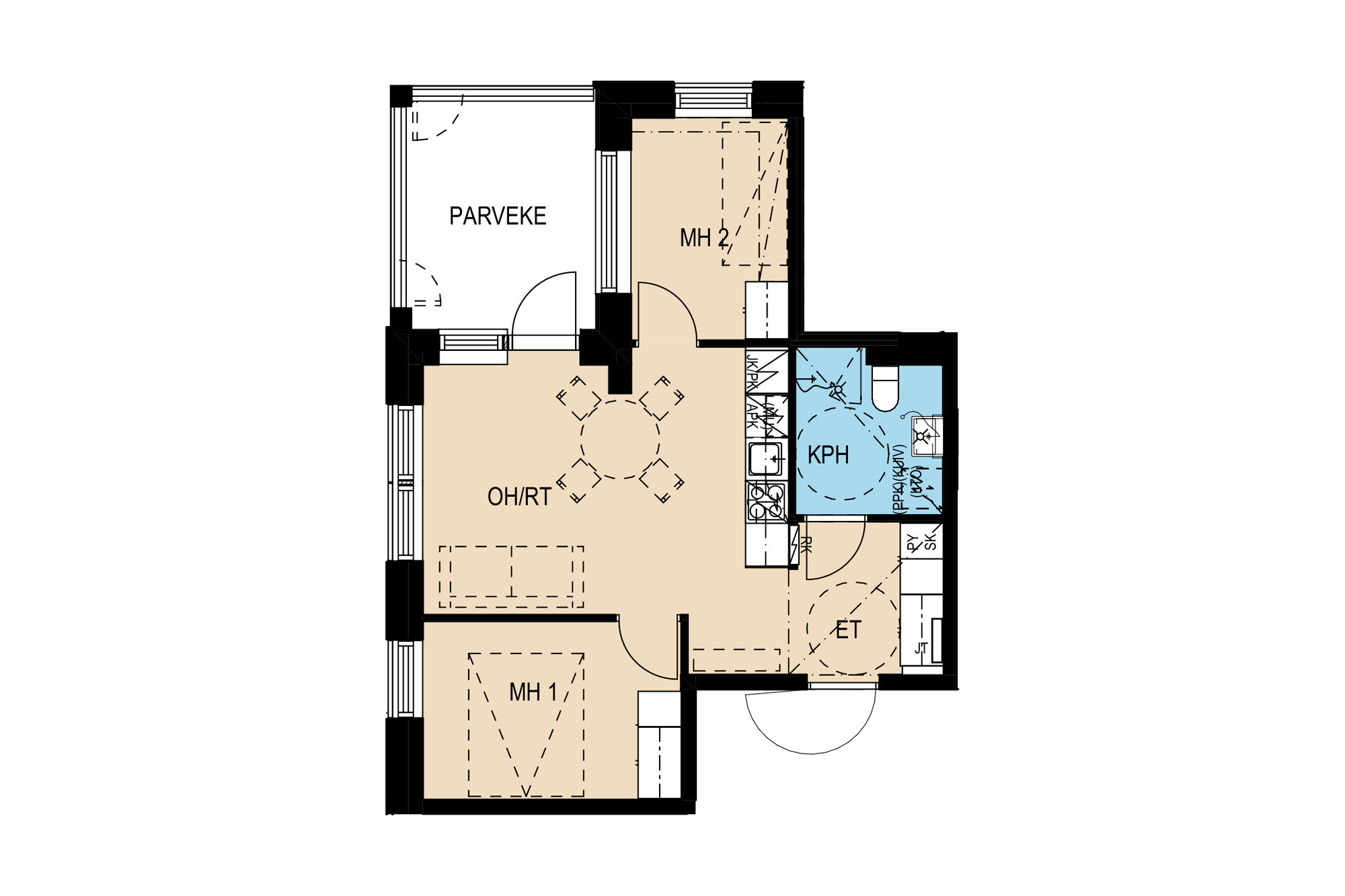Tehokolmio rakennuksen kulmaan sijoittuvalla lasitetulla parvekkeella. Toinen makuuhuoneista soveltuu esimerkiksi etätyö-, vieras- tai lastenhuoneeksi. Keittiö ja olohuone ovat avointa yhteistä tilaa, johon tulee paljon luonnonvaloa kookkaista ikkunoista.